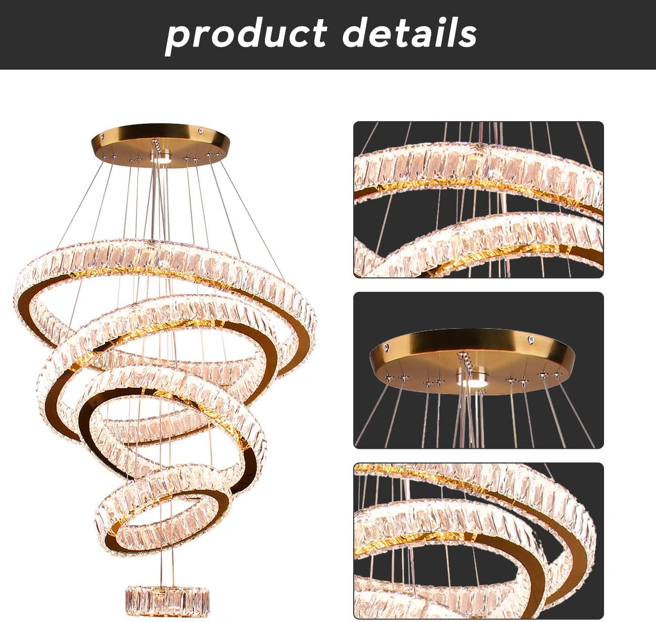 - LED Chandeliers Ring Size:D21.7″+D17.7″+D13.8″+D9.8″+D5.9″. Ceiling Canopy: 9.8″