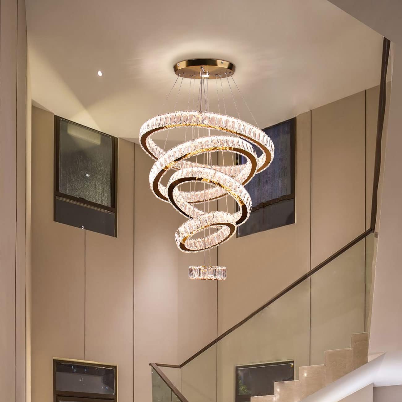 Dixun LED Big Crystal Chandeliers Modern 5 Rings Pendant Light Adjustable Ceiling Light for Bedroom Dinning Room Kitchen (Warm White)