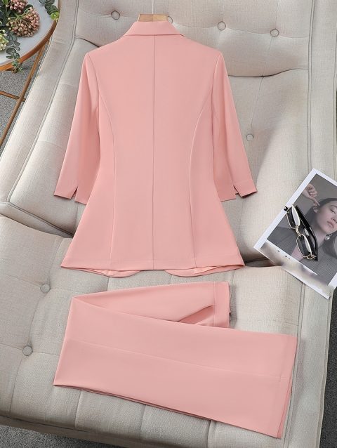 Women Commute Suit Double-breasted Women’s Coat Pants Suit with High Waist Slim Fit Pants Lapel Jacket for Formal Business