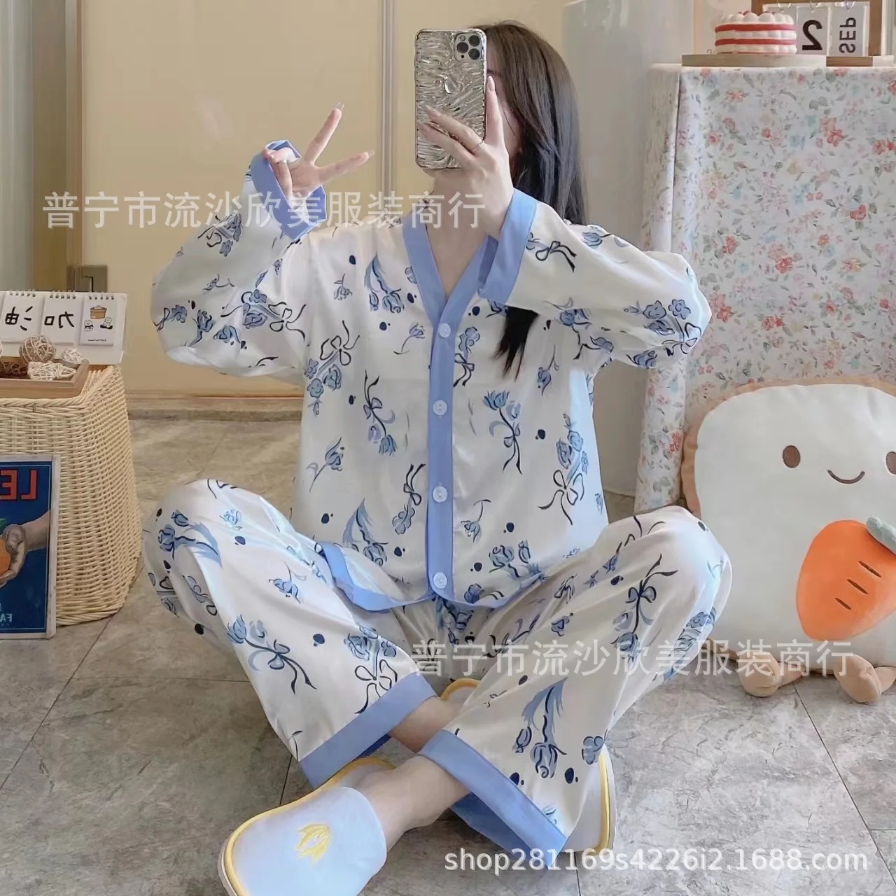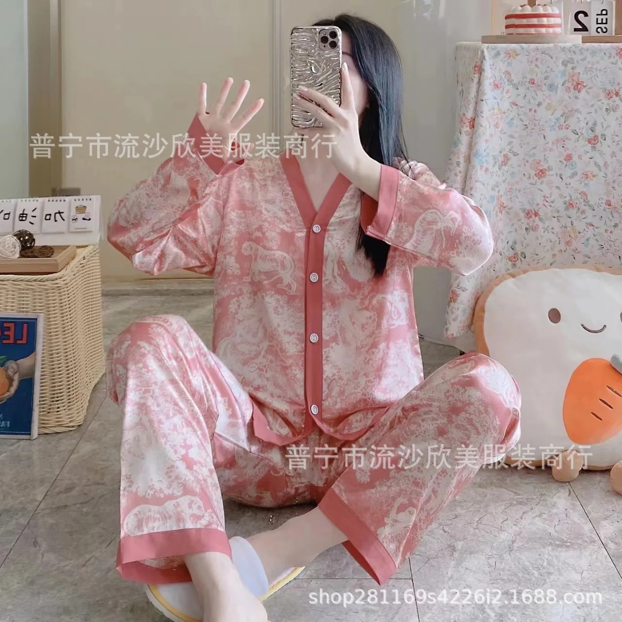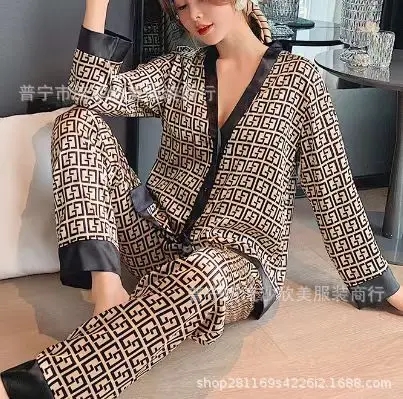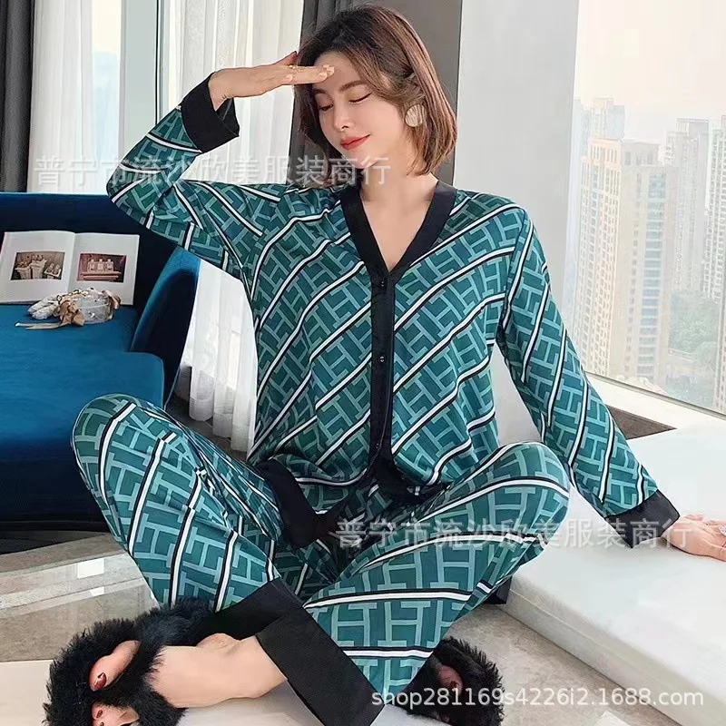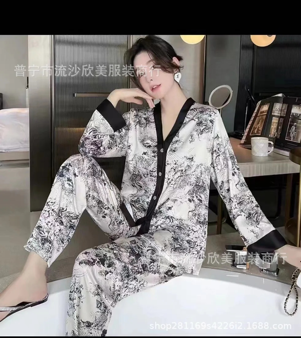 Autumn New Women’s Long-sleeved Pants Cardigan Simulation Silk Loose Lapel Women’s Homewear Pajamas Set Women’s Ice Silk Pajamas