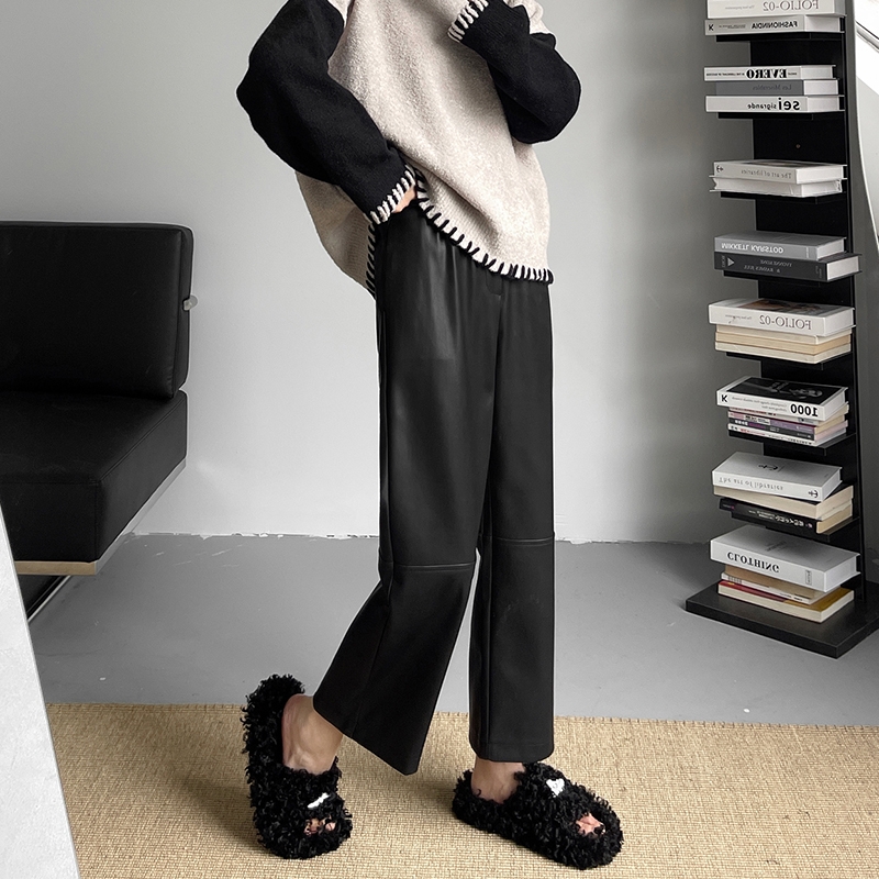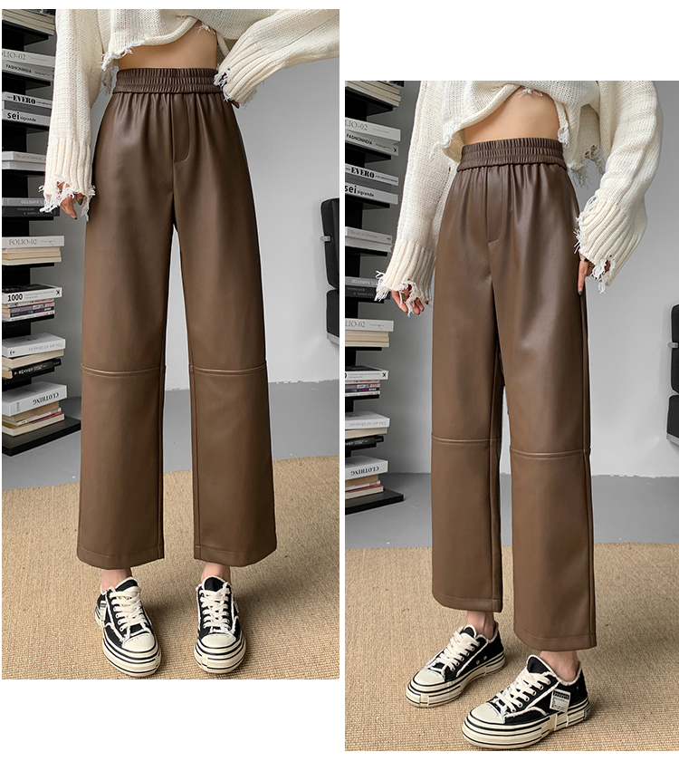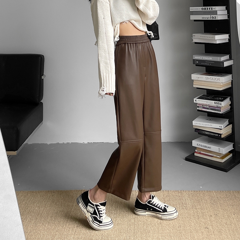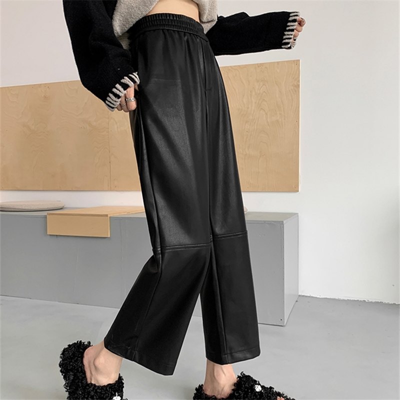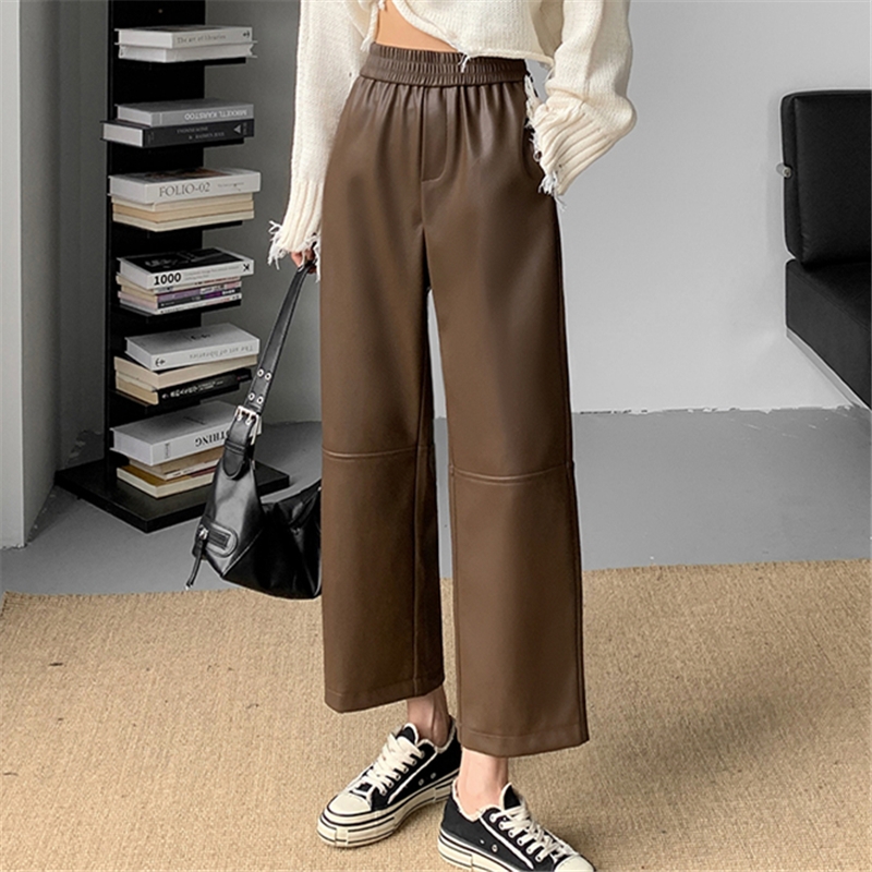 Autumn Winter PU Leather Women’s Ankle Length Pants 2024 New Korean High Waist Black Straight Loose Pants Pocket Female