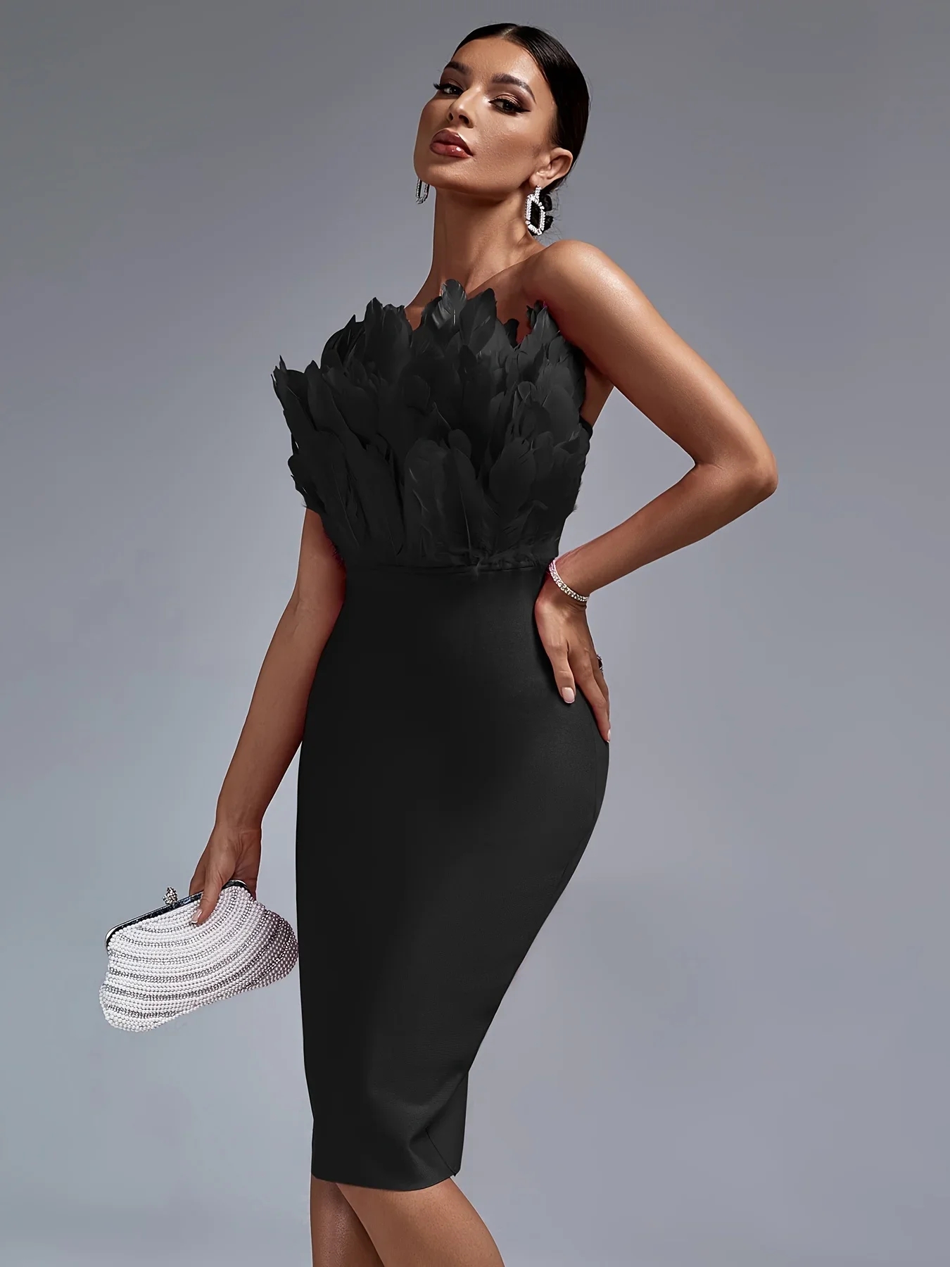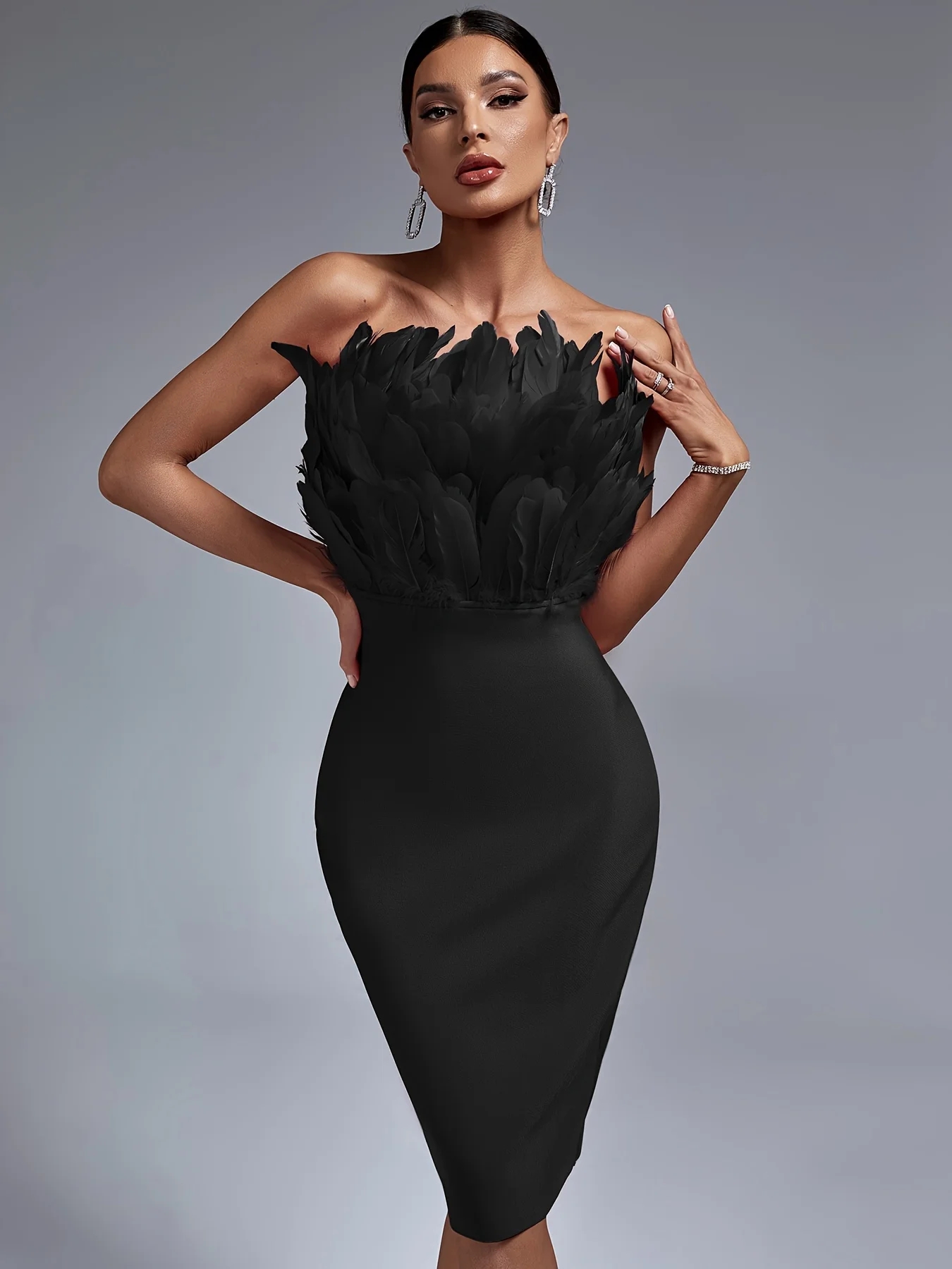 Black Bandage Dress Women Feather Party Dress Bodycon Elegant Midi Sexy Strapless Evening Birthday Club Outfits Summer 2023