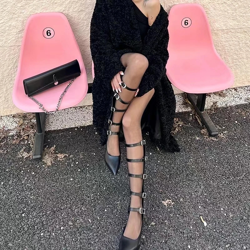 Black Belt Buckles Pointed Toe Thick Heel Summer Boots Woman Summer 2025 Side Zipper Sexy Hollow Knee-High Sandals Fashion