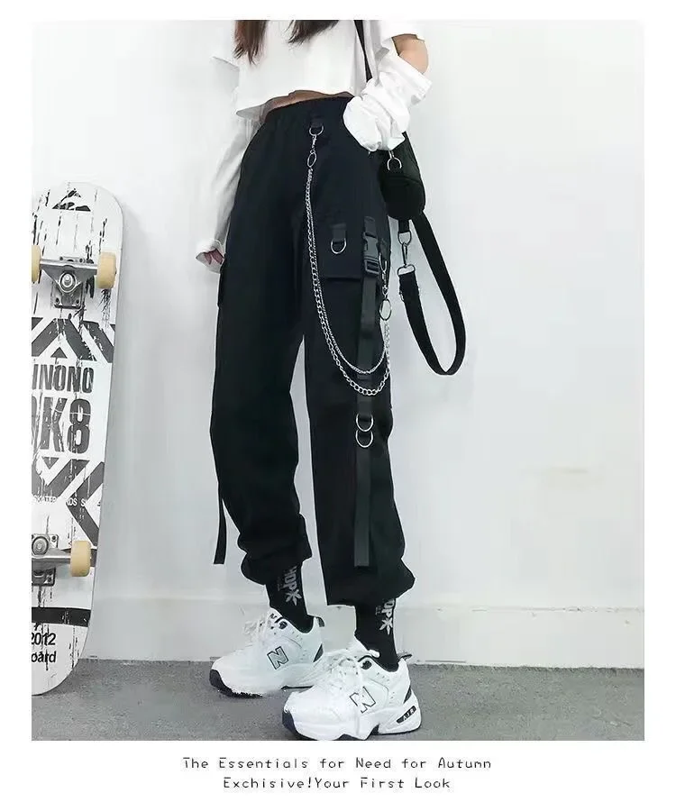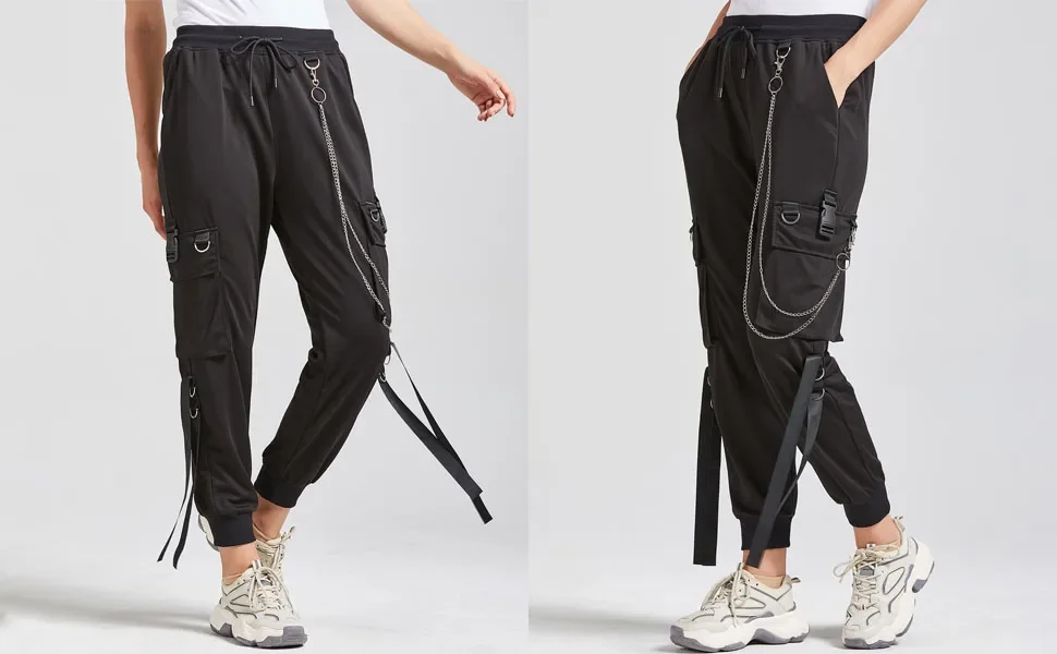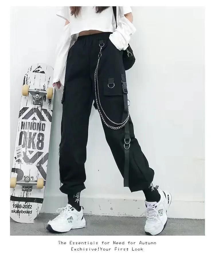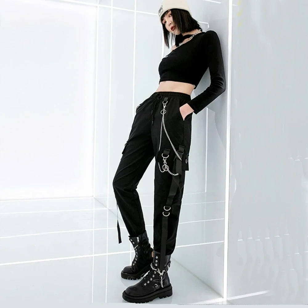 Black Cargo Pants for Women Techwear Women Loose Street Rock Style Casual Black Pants with Chain Goth Pants