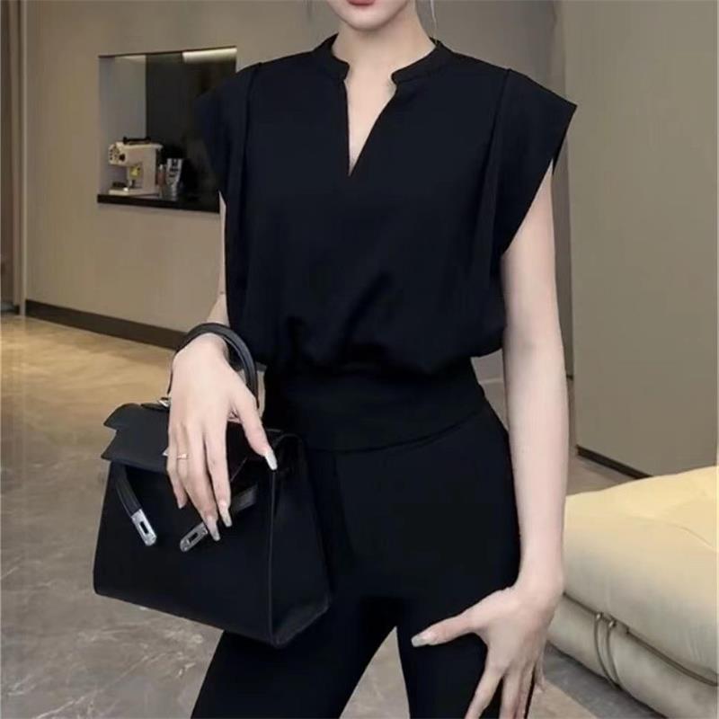 Black V-neck Short Shirt Summer Crop Top Women’s Fashion Sleeveless Shirts Elegant Office Lady Clothes Top Casual Blouse