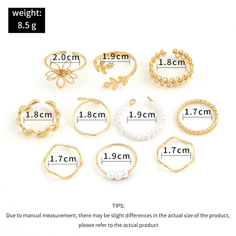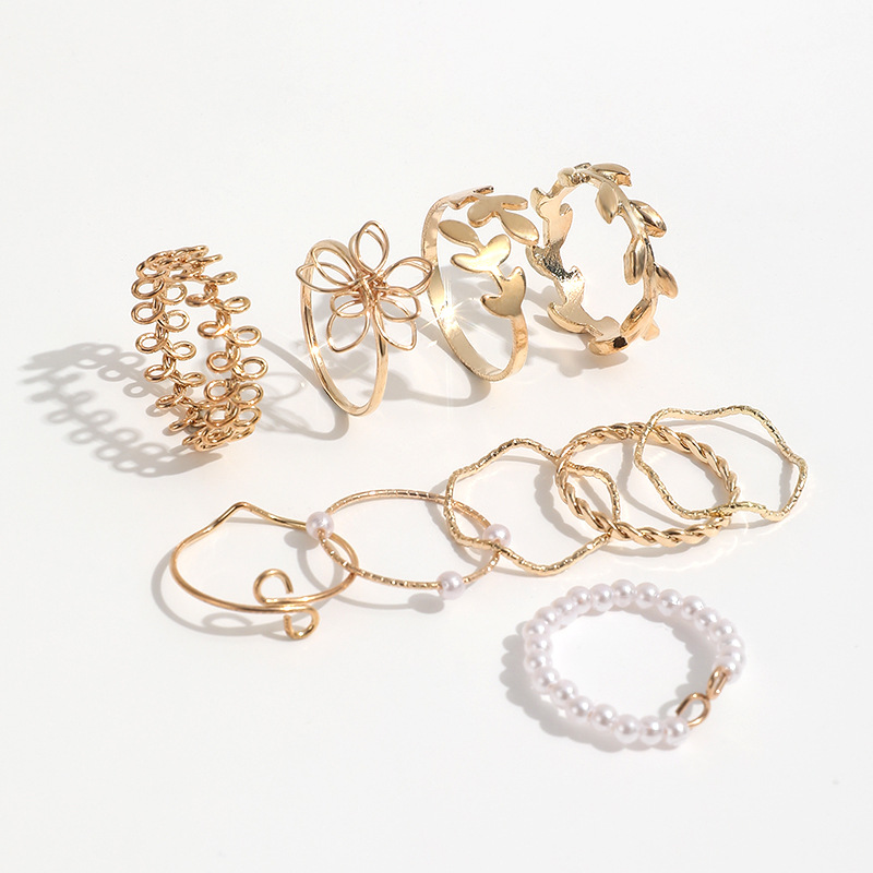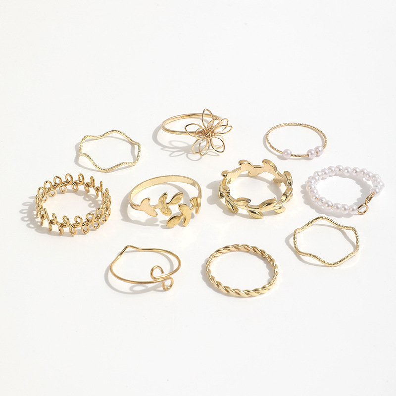 Bohemian Hollow Flower Ring Set Glossy Leaf Vine Design Imitation Pearl Jewelry 1Set Stackable Set Boho Birthdday Gift