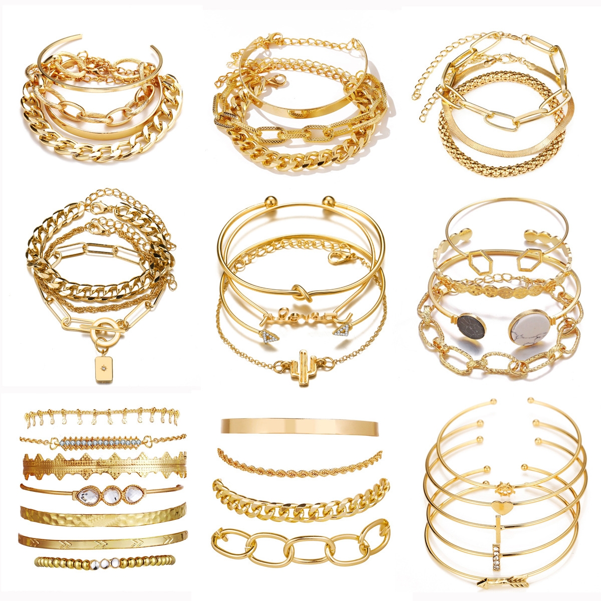 Bohemian Metal Chain Bracelet Set For Women Geometric Gold Color Thick Link Chain Open Bangle Female Fashion Jewelry