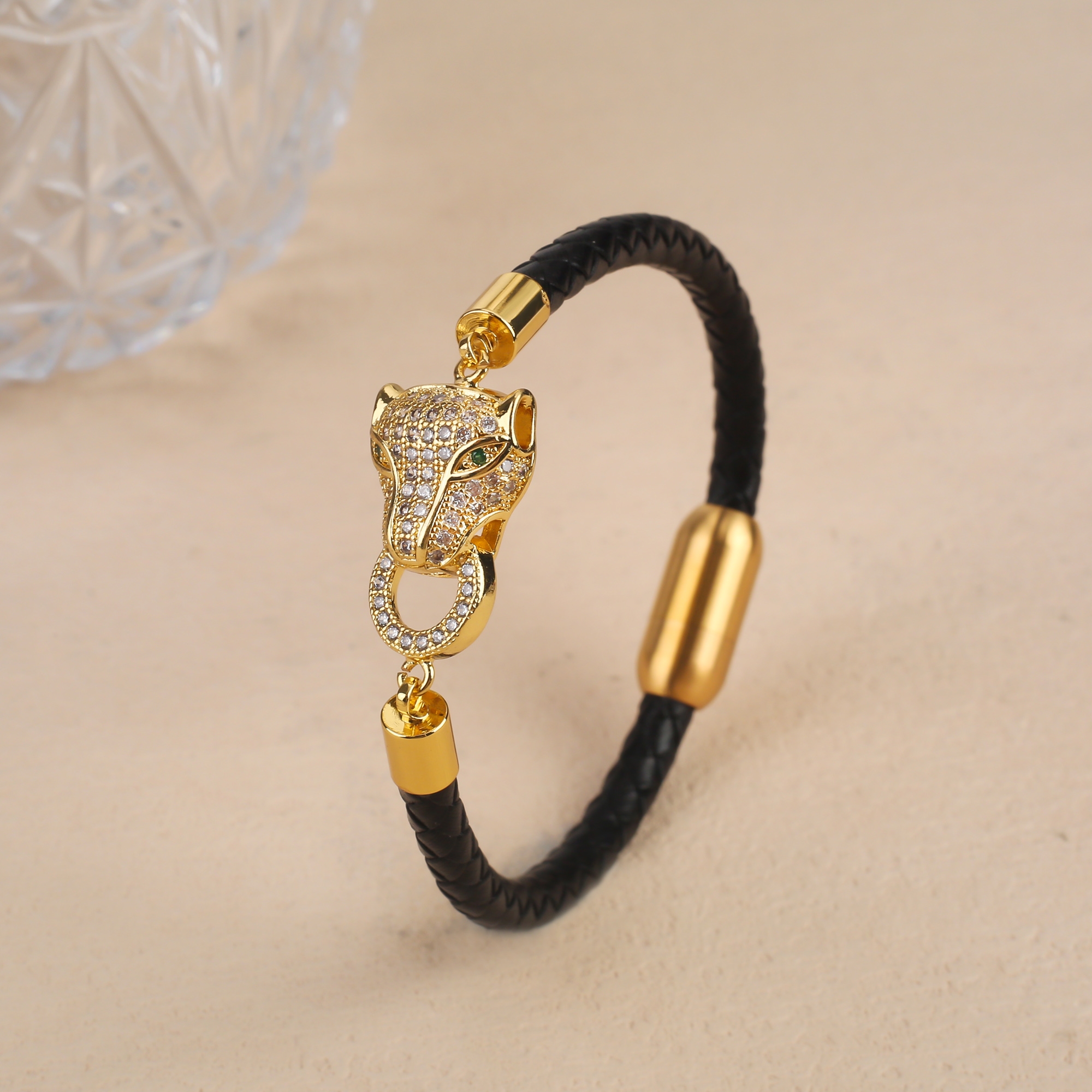 Name: Bully Animal Style Leopard Head Braided Leather Rope Bracelet Fashion for Man Woman Stainless Steel Zirconia Jewelry Daily Wear