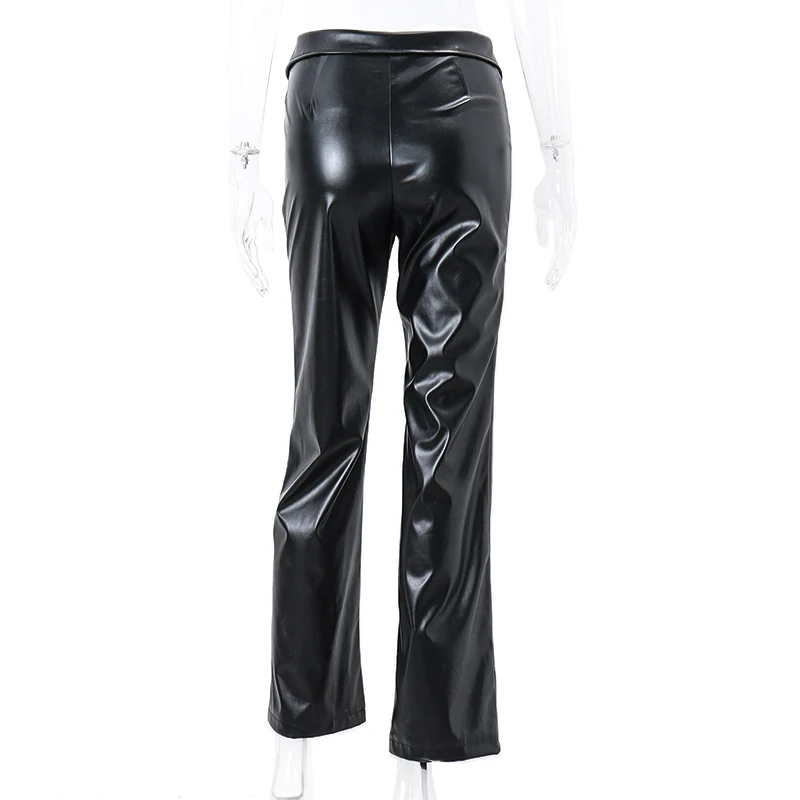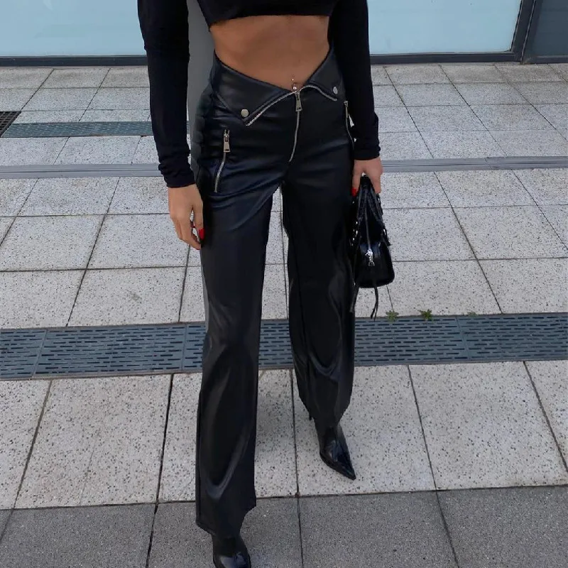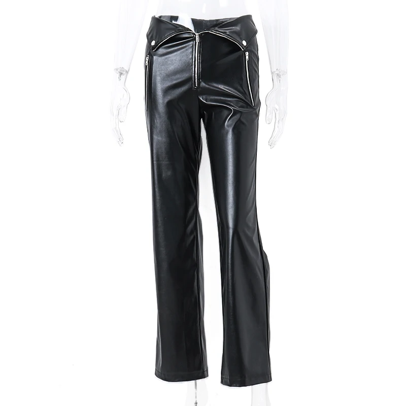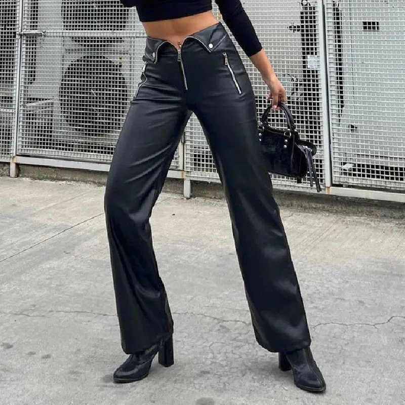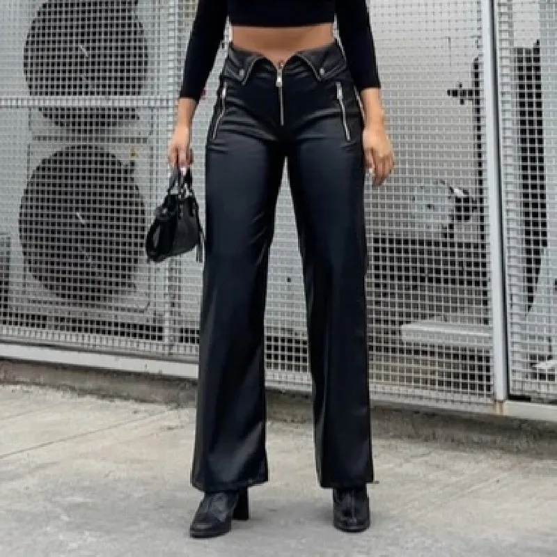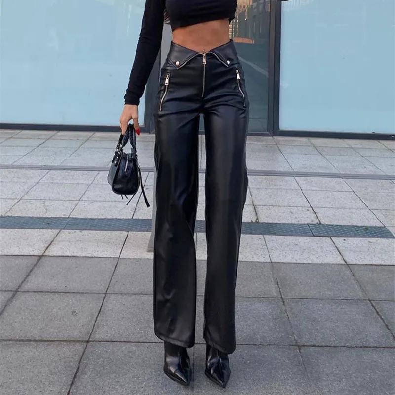 Candyhot PU Leather Zipper Slim Pants Y2K Casual Party Streetwear High-waist Straight Leg Pants 2024 Gothic Chic Women Trousers