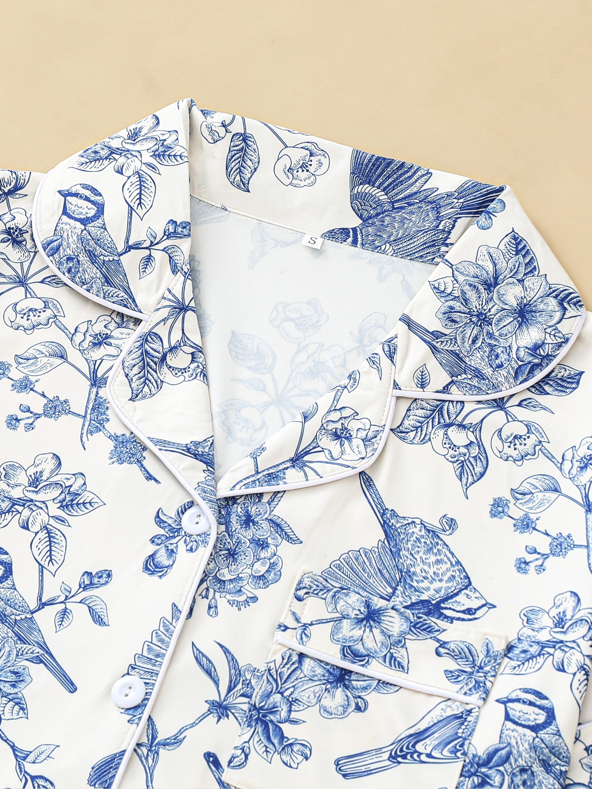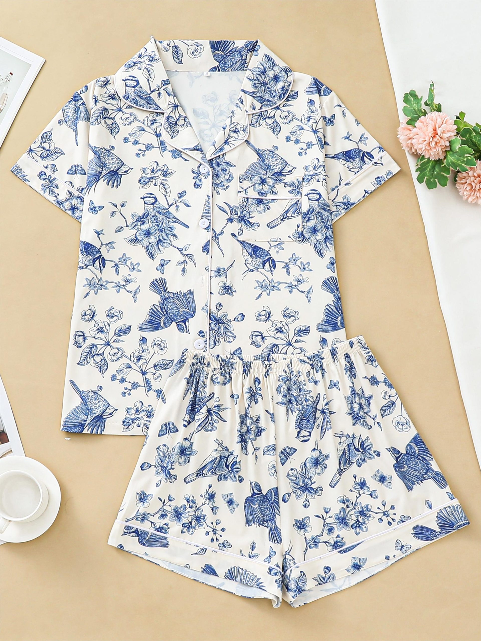Casual bird floral print pajamas for women short-sleeved tops with button-down lapels and comfy shorts loungewear for women
