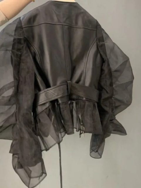 Short Coat Women Organza Bubble Sleeved Ruffled Fashion Leather Jacket Streetwear Retro Y2k Black Faux Autumn