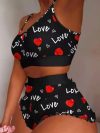 Elegant Solid Pajama Set Heart Pattern Short Sleeve Blouse Top & Elastic Waistband Shorts Women’s Sleepwear & Loungewear