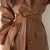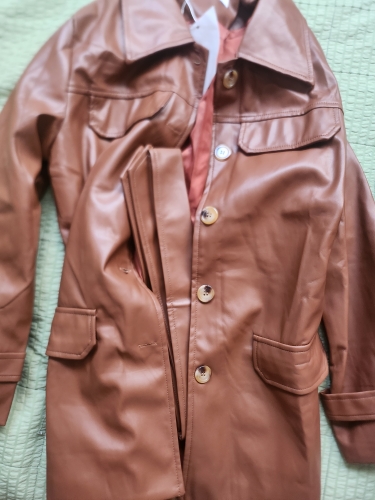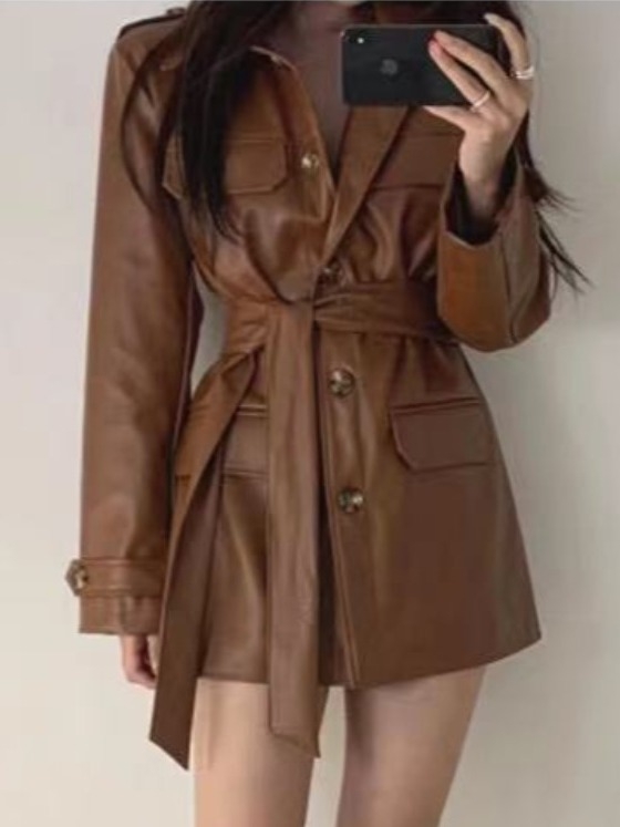 Chic Retro Long Sve Collar Single Button Multi ket Waist Cinched Leather Jaet Coat for Women mid Length Outerwear