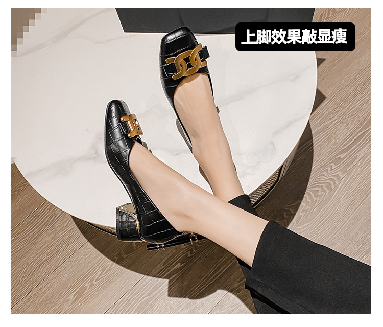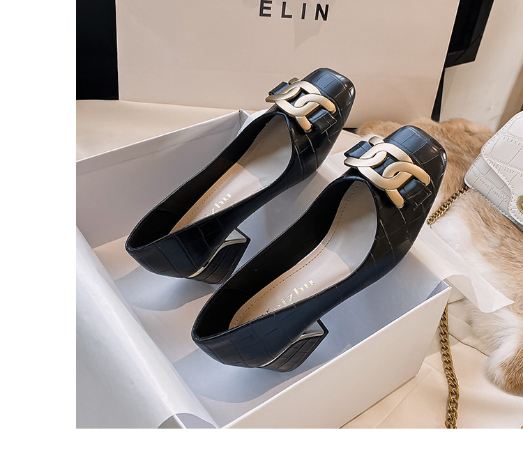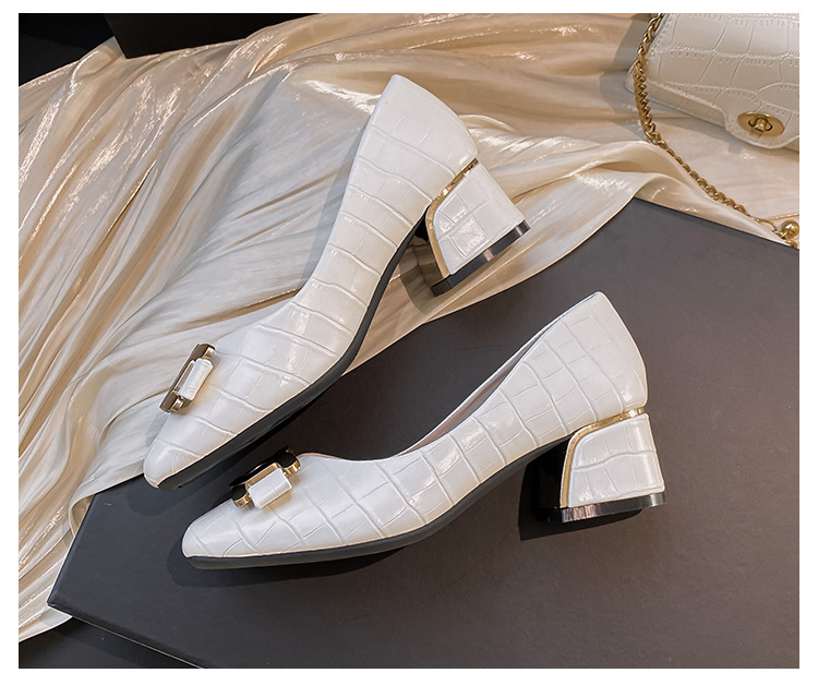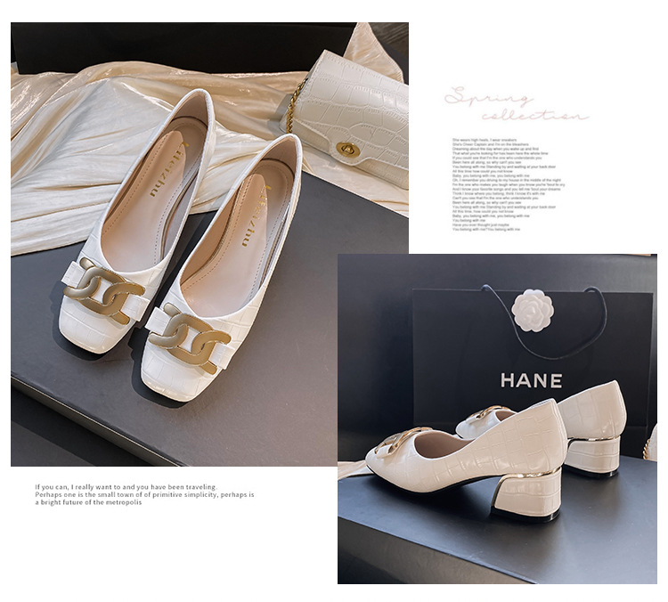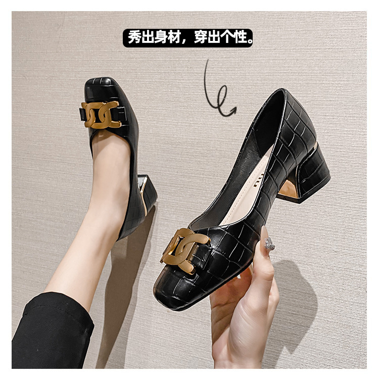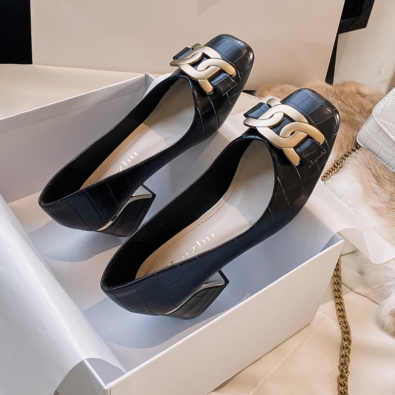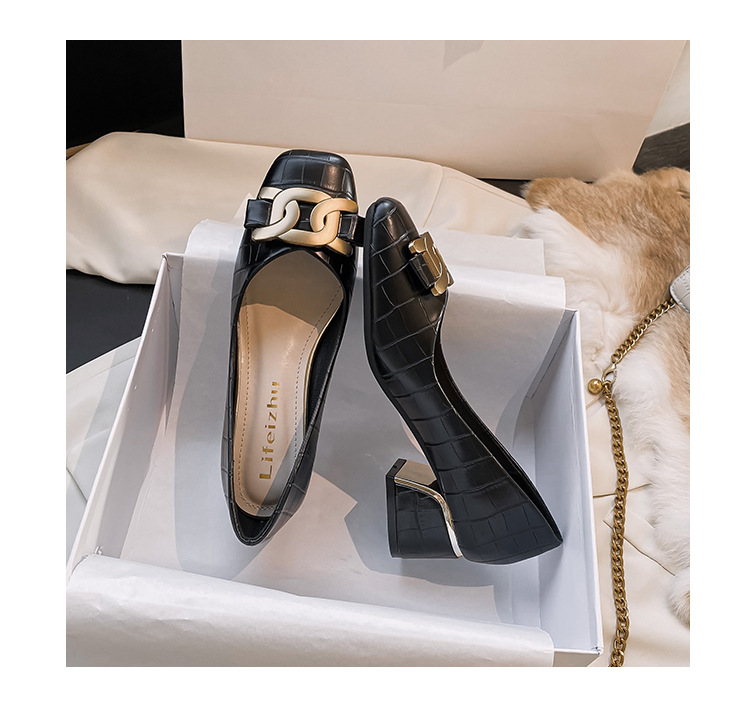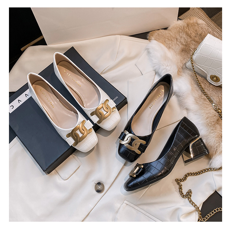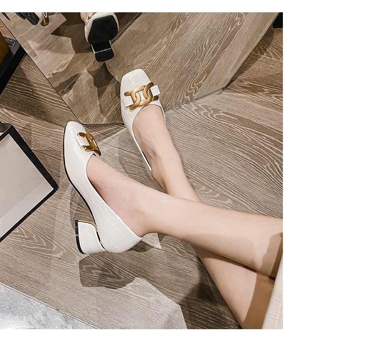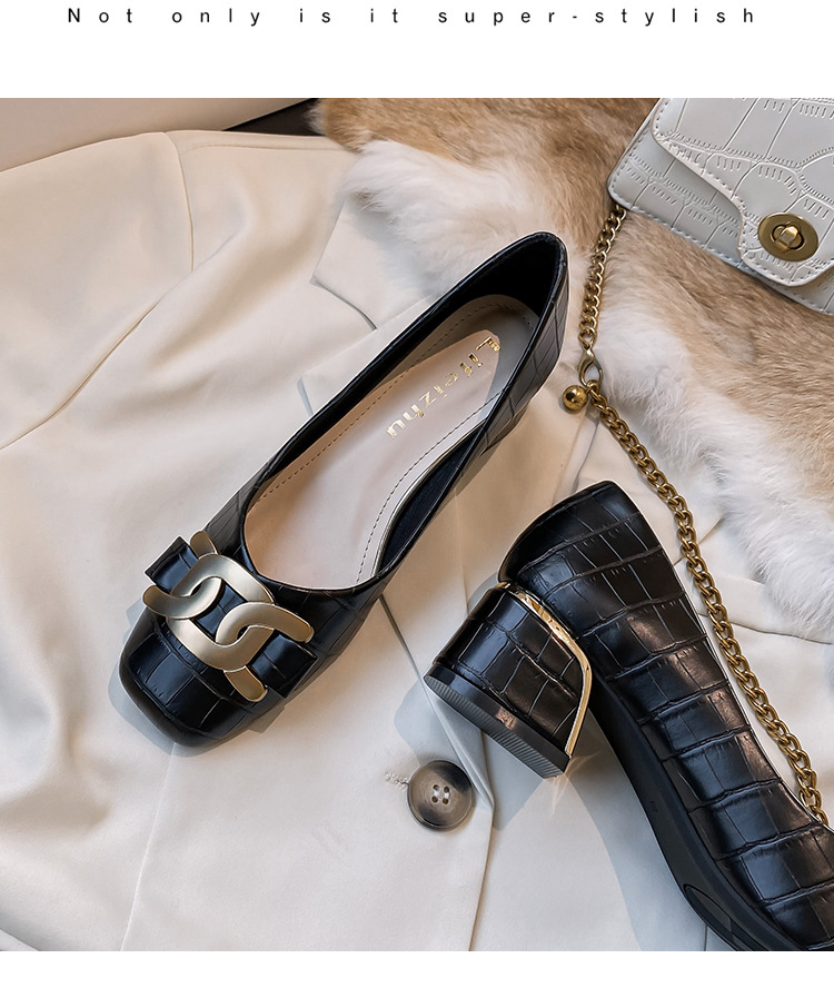 Chunky Med-High Heels Shoes Woman Luxury Metal Chain Pumps Alligator Mary Janes Ladies Dress Square Toe Tacones Mujer Escarpins