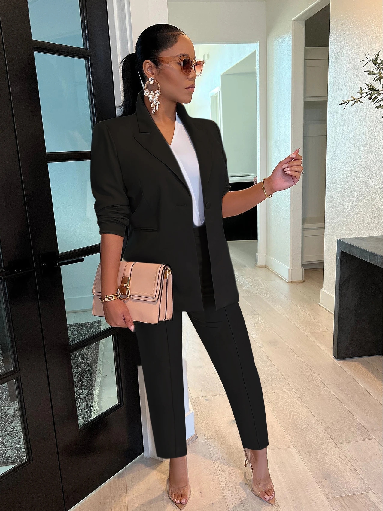 Woman Elegant Solid Slim Blazer Suit 2021 Spring Casual Female High Waisted Pencil Pants Suits Office Ladies 10 Color 2 Pcs Sets
