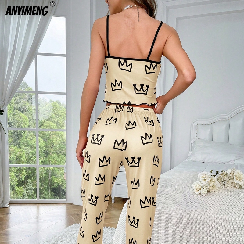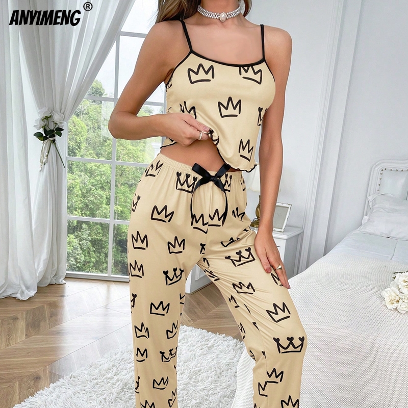 Crown Printing Women Sling Wide-legs Pajamas Set Fashion Pijama for Girl Soft Milk Silk Sleepwear Casual Lady Sexy Nightwear