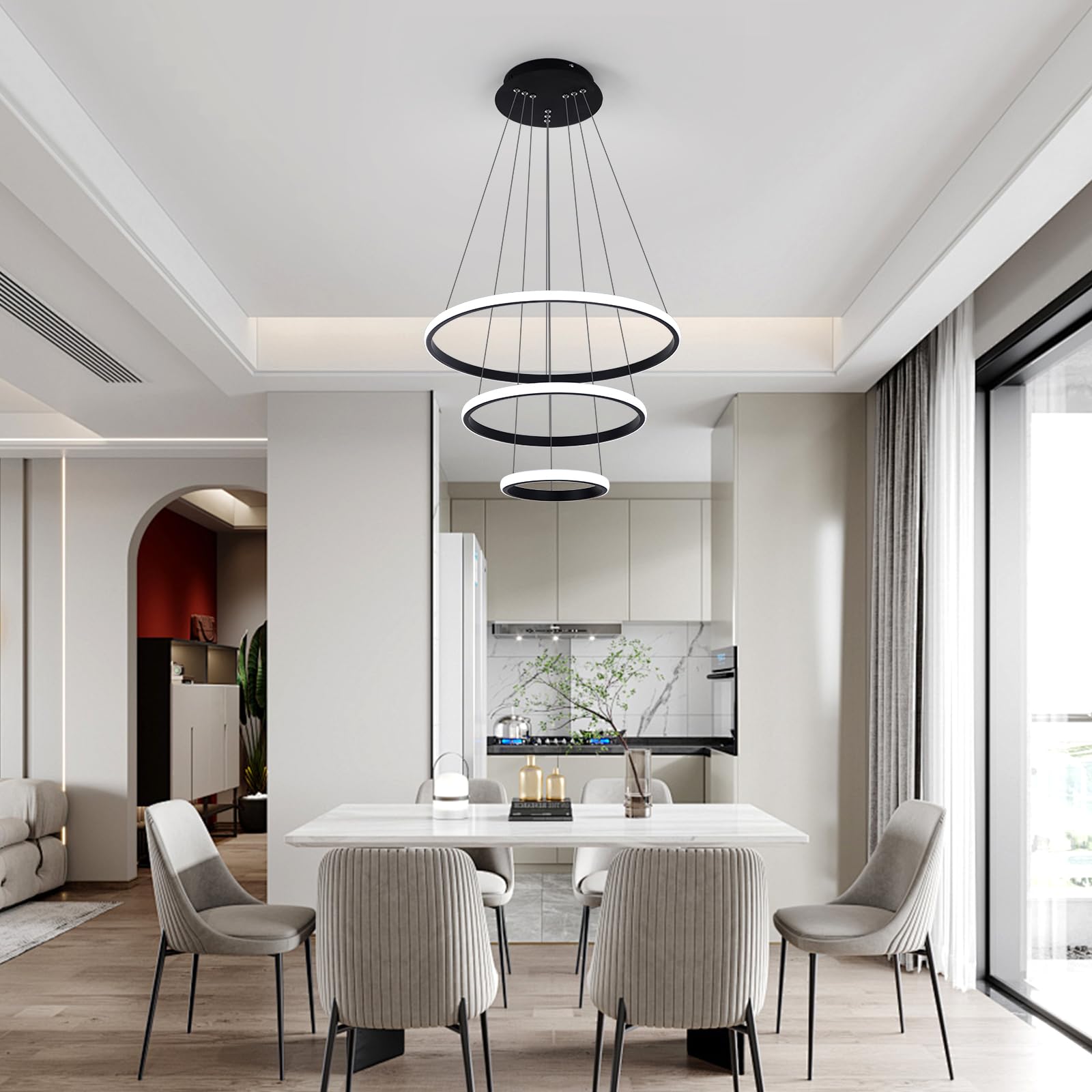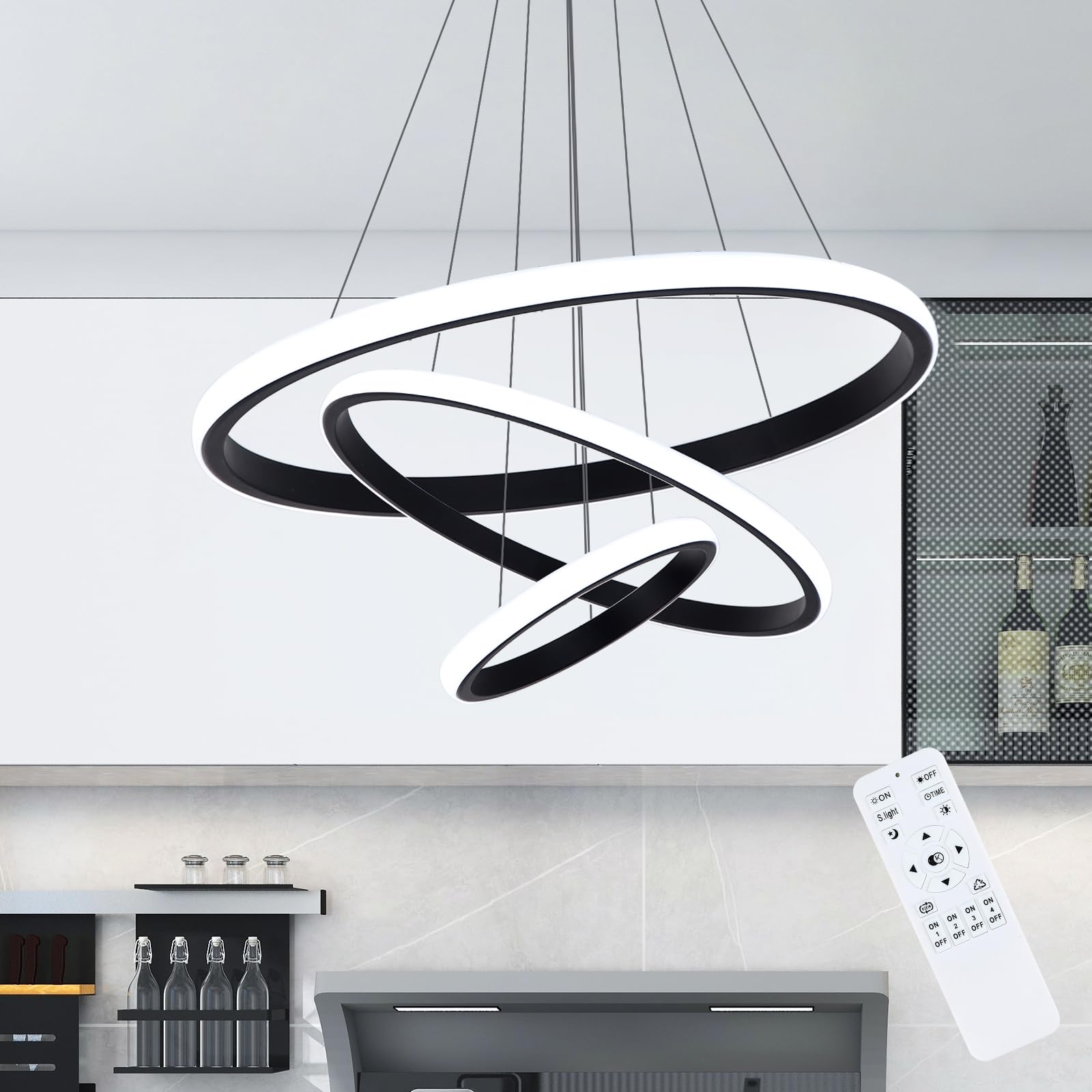 Dimmable Modern LED Chandelier,3 Rings Black Pendant Light with Remote,3000K-6500K Adjustable,40W Ceiling Light for Bedroom