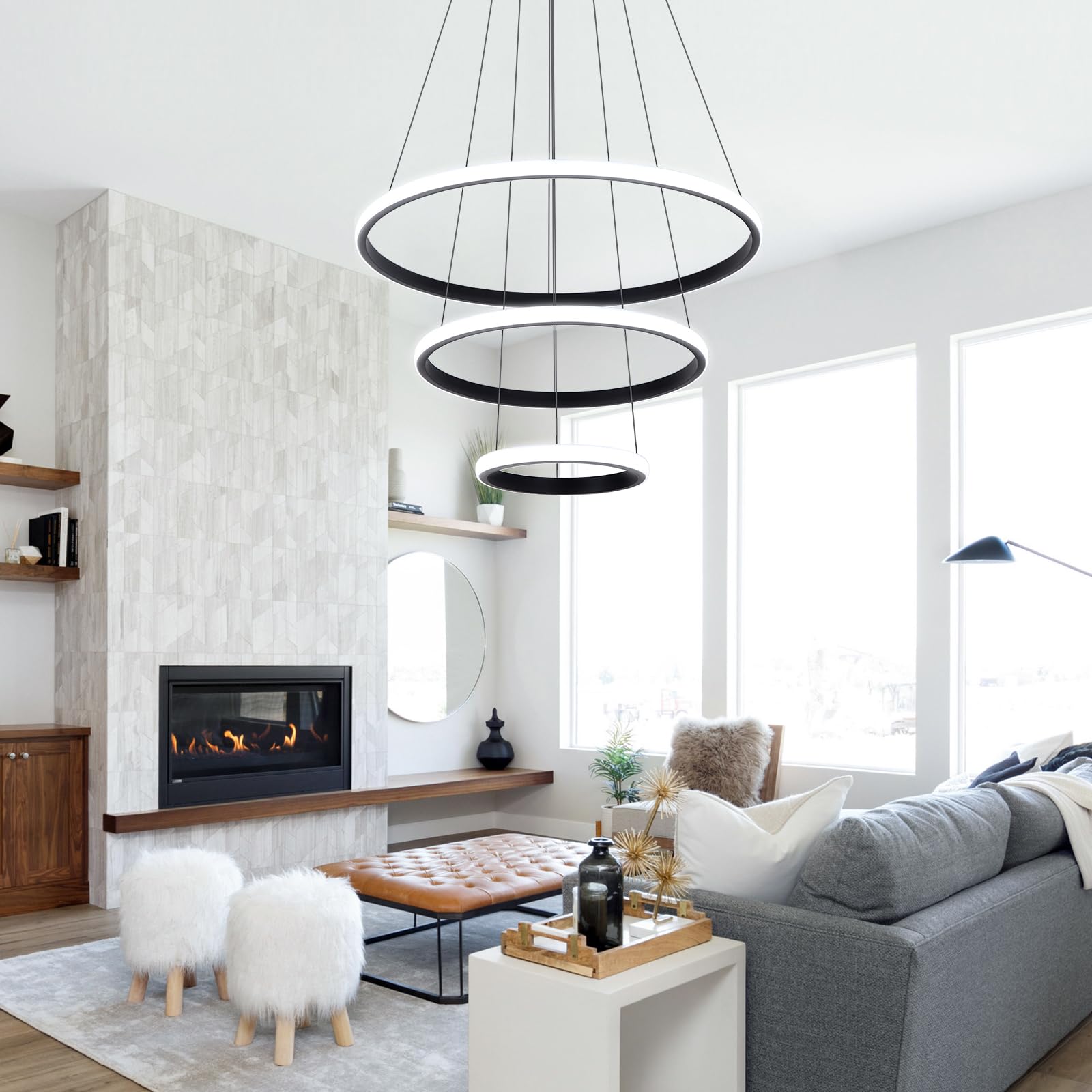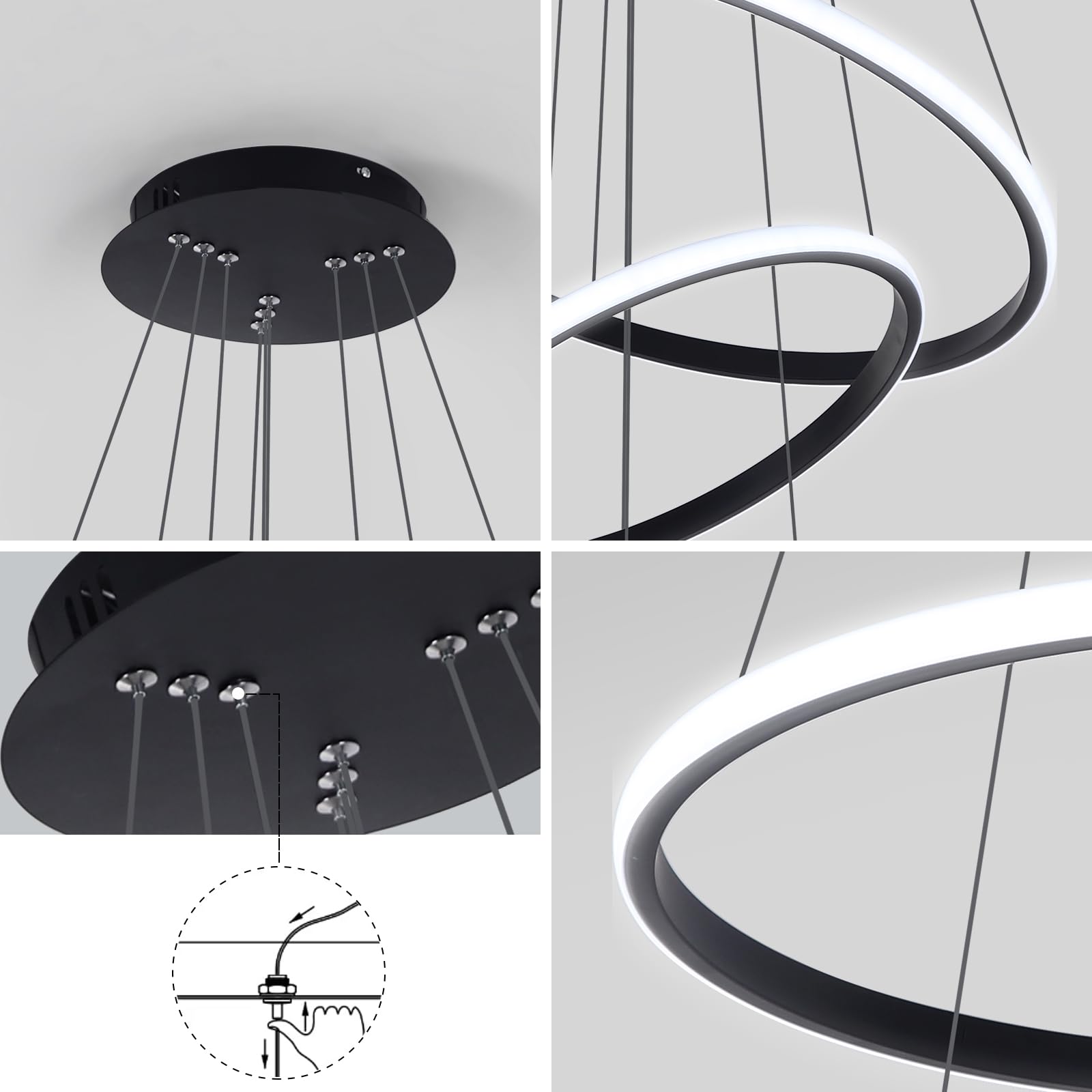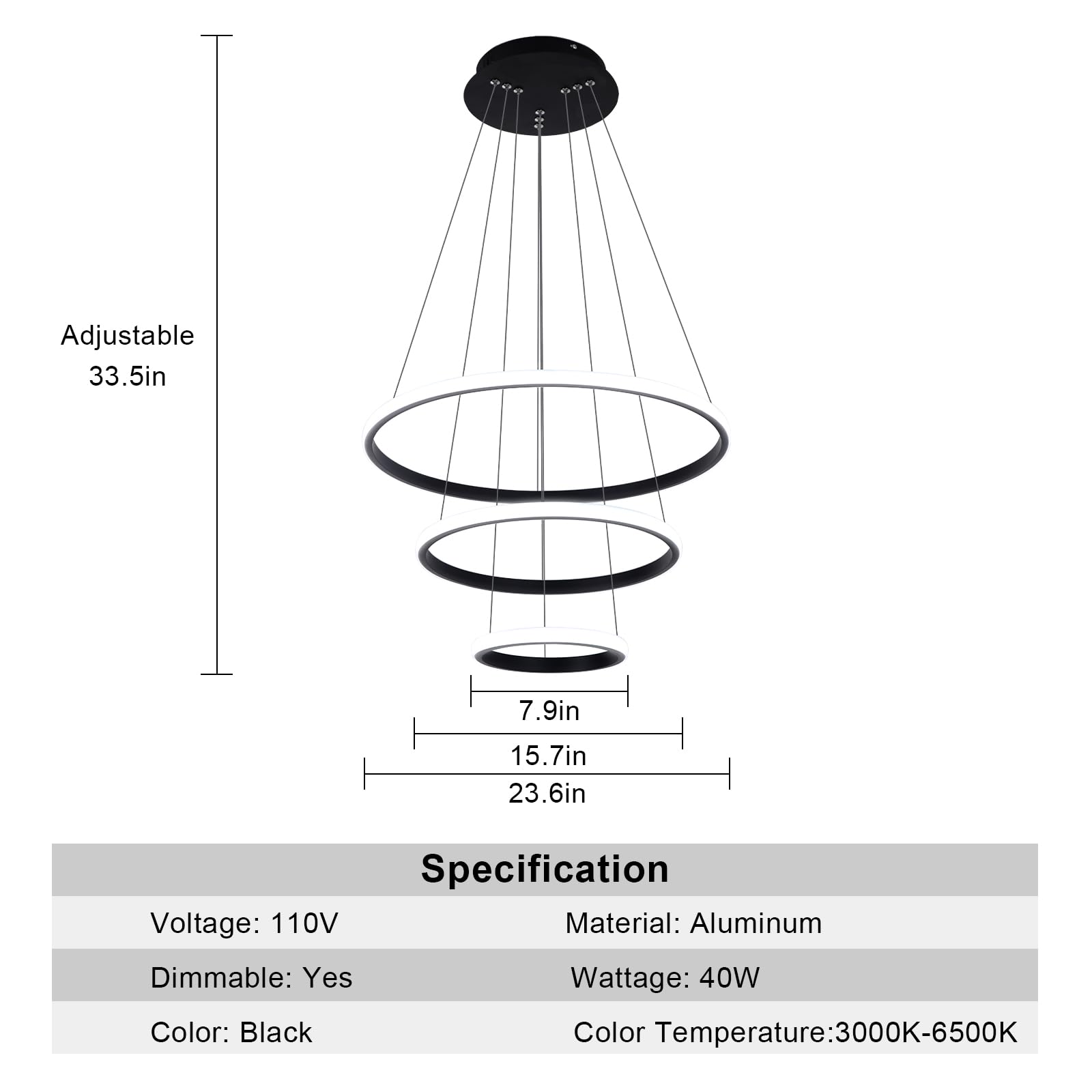 Modern Circular LED Chandelier: The 3-rings LED chandelier is made of premium aluminum, metal, and acrylic.ring diameter: 23.6″+15.7″+7.8″, heigh: max 33.5 inch adjustable Ceiling Hanging Light and strip to get different shape.