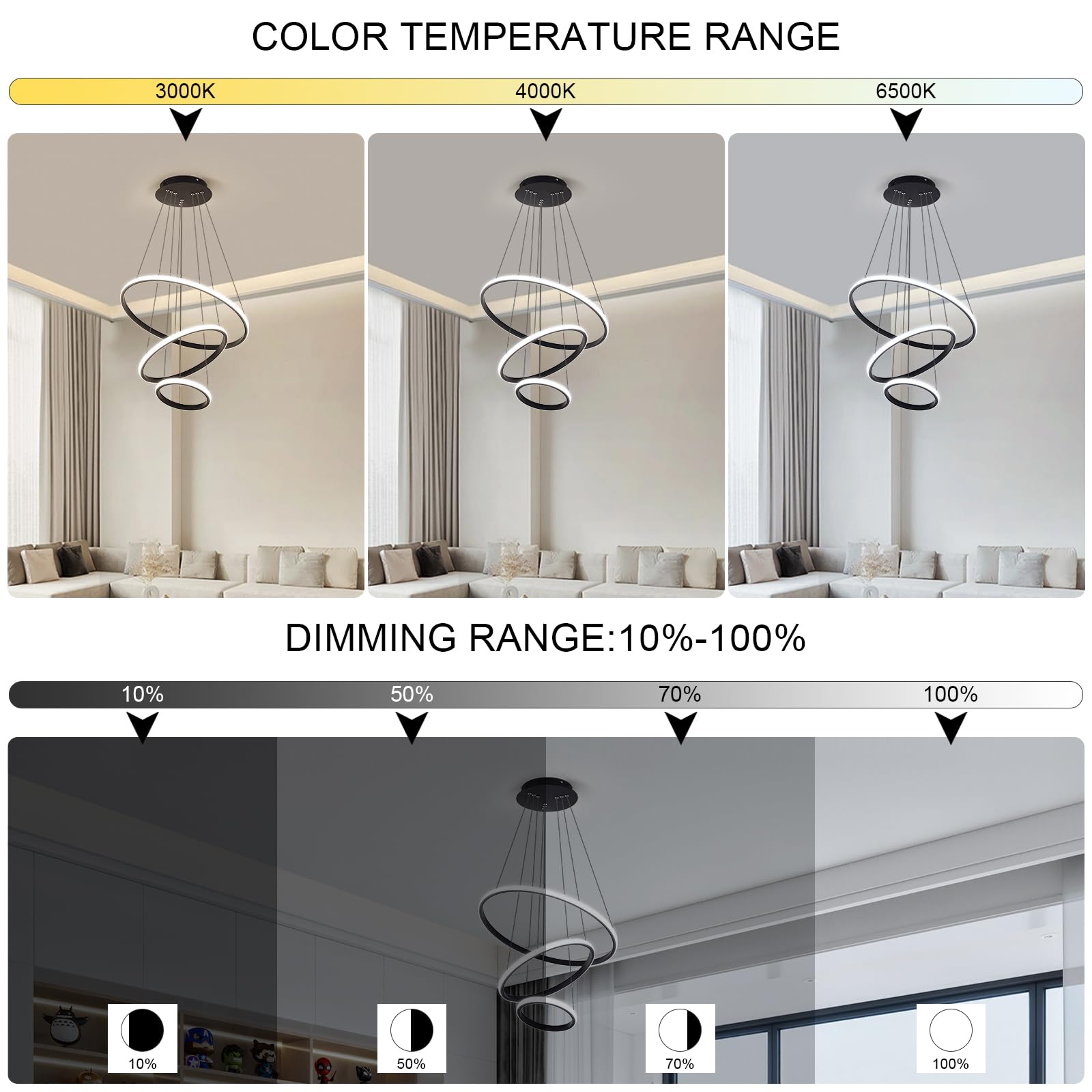 Dimmable LED Chandelier with Remote: Power 40W, adjustable light 3000K, 4000K, 6500K three different color temperatures, adjusted between white light, and warm light; add a touch of modern/luxury/elegant sense of space to the dining room, living room, or entryway.