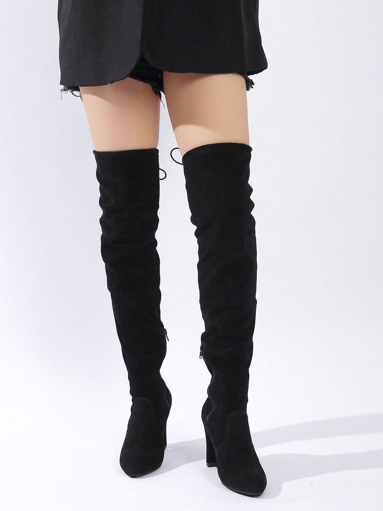 Elegant Black OTK Boots for Women – Chunky Heel Tall Boots, Adjustable Lace Up & Side Zipper, Comfortable for Office & Party