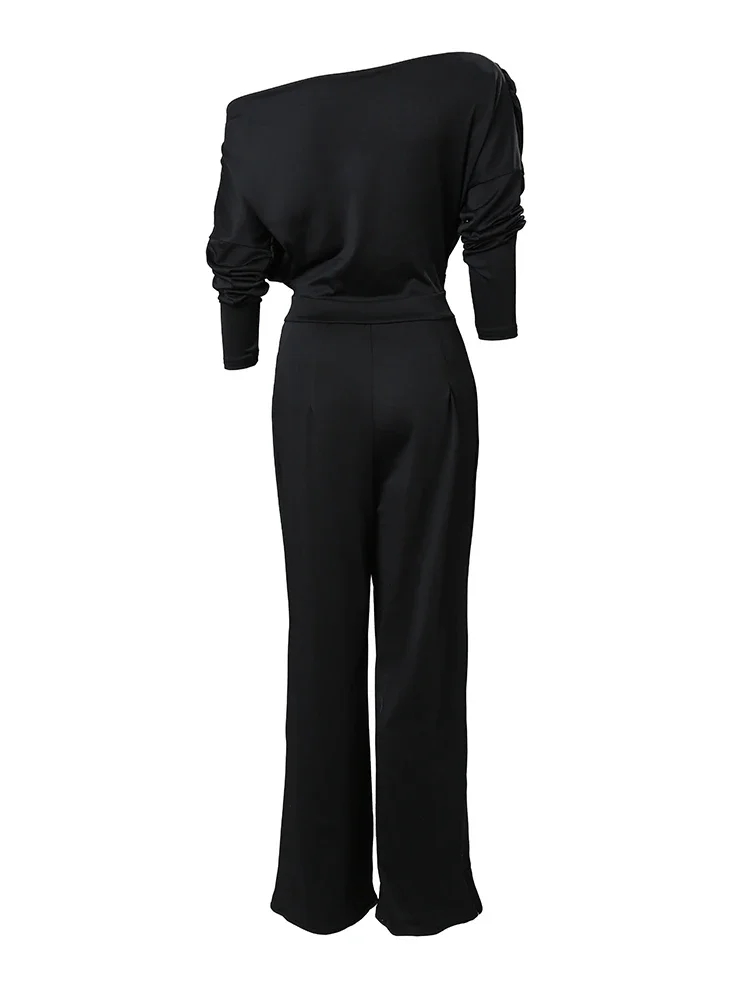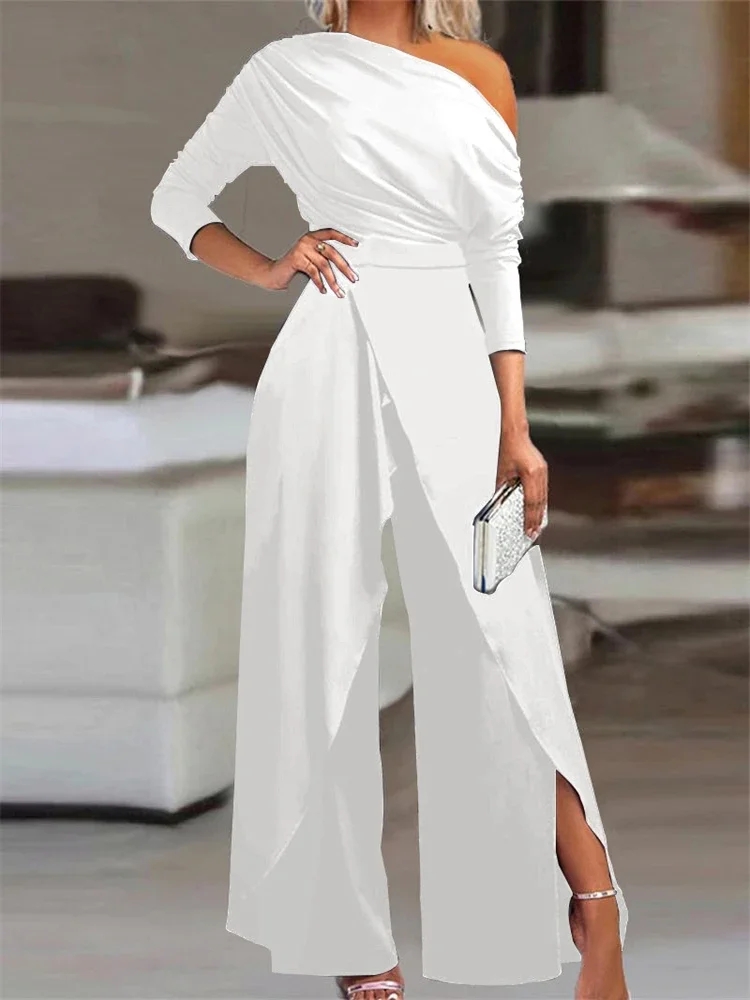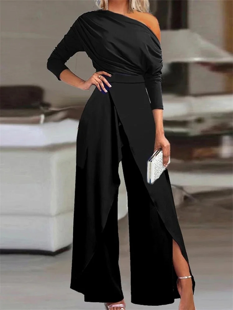 Elegant Jumpsuits for Women 2025 Spring New Plain Elegant Office Lady Loose Ruched Cold Shoulder Split Hem Wide Leg Jumpsuit