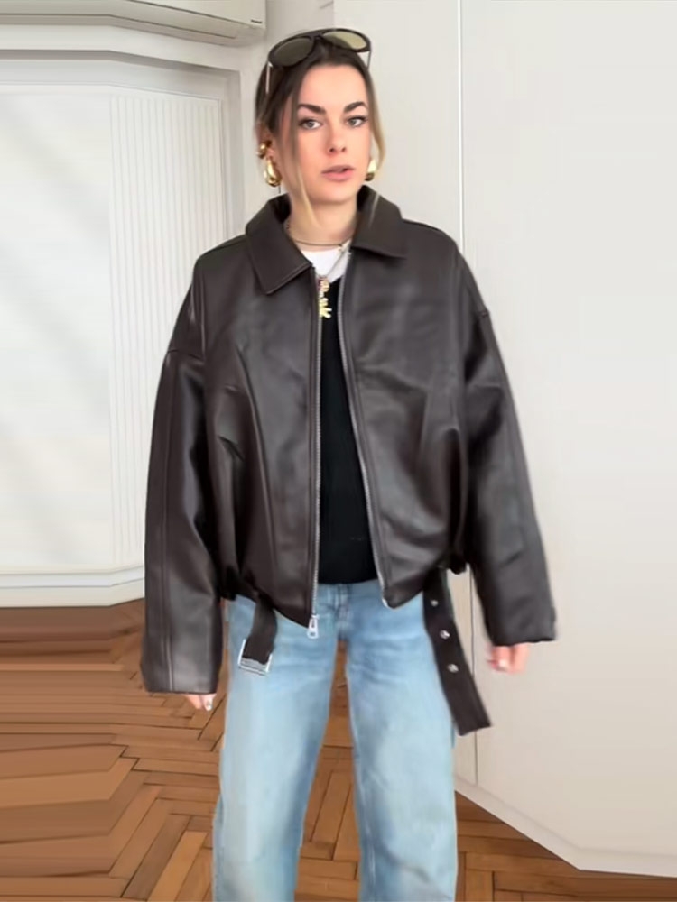 Elegant Pu Zipper Jacket with Belt Women Long Sleeve Lapel Loose Pockets All-match Jacket 2025 Autumn Leather Street Coat Lady