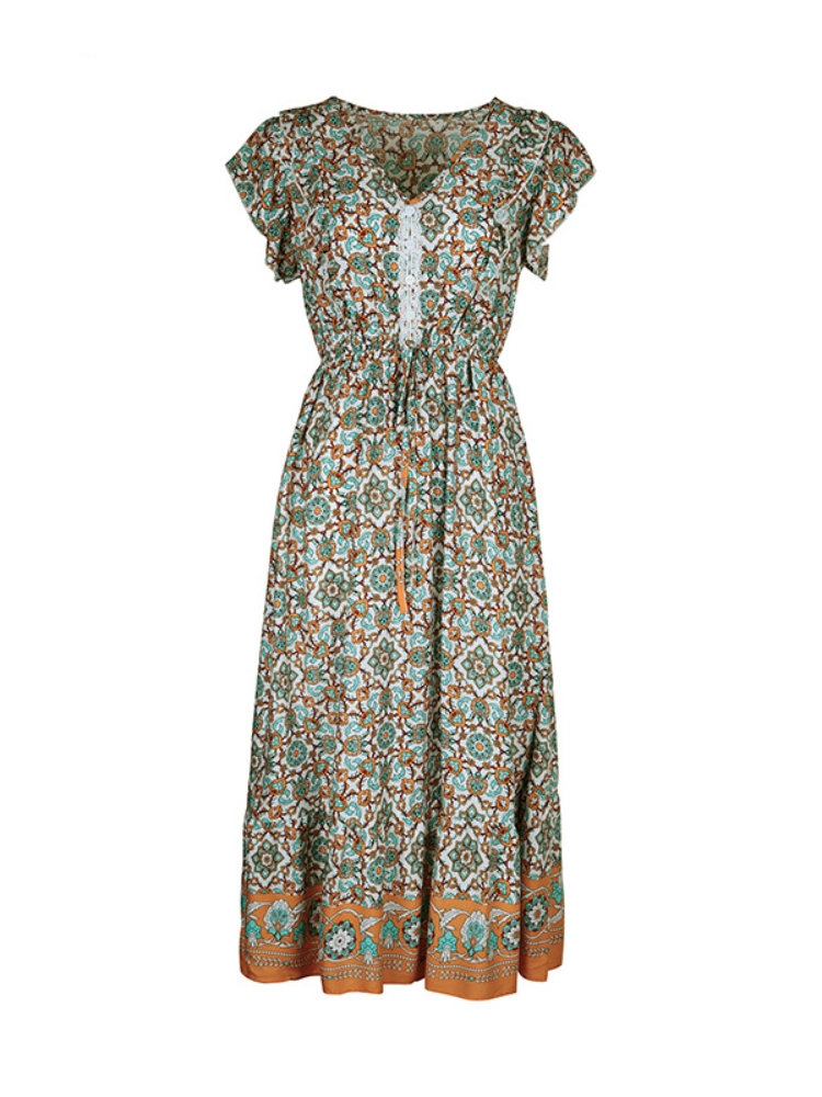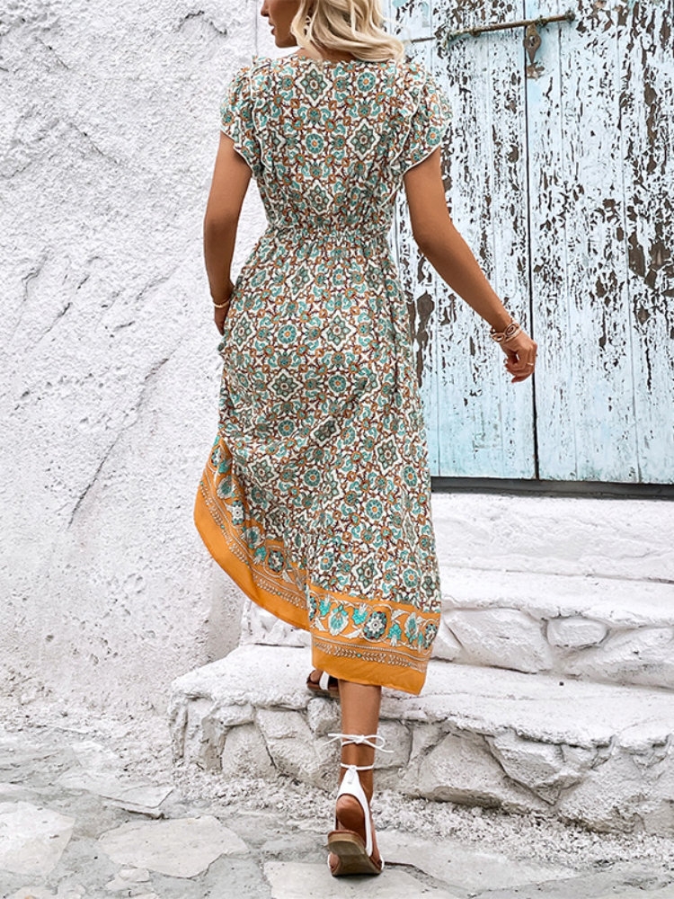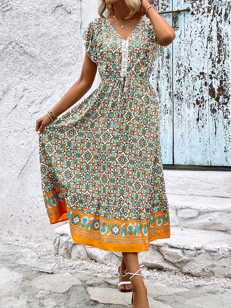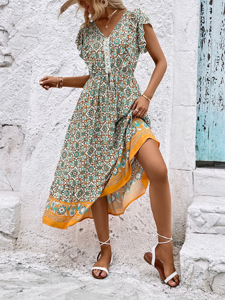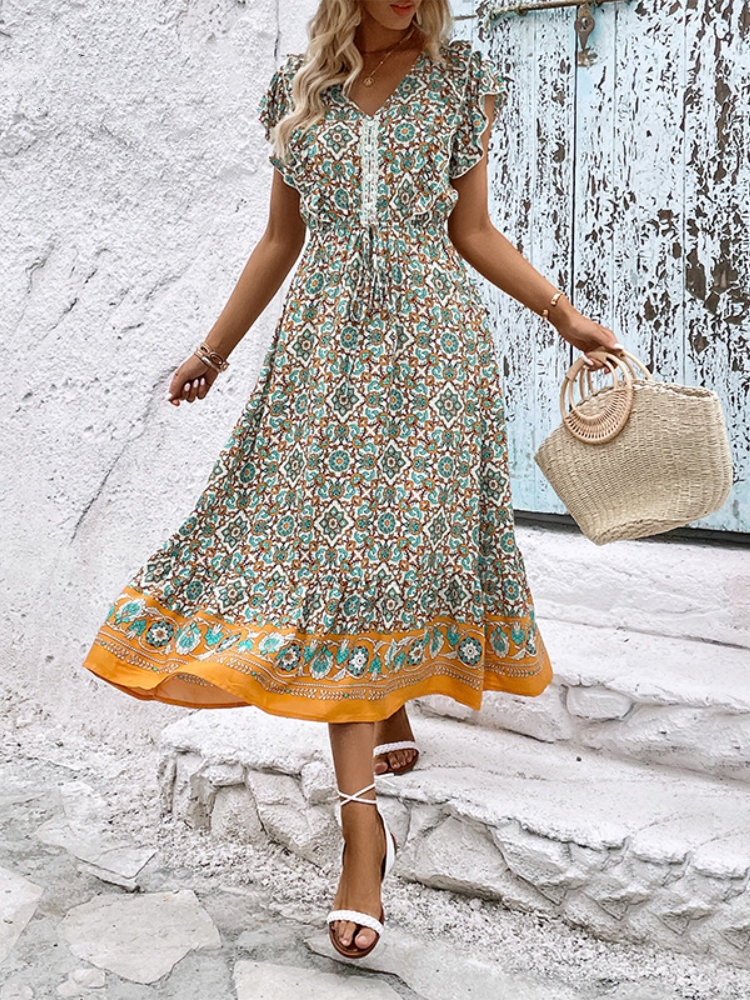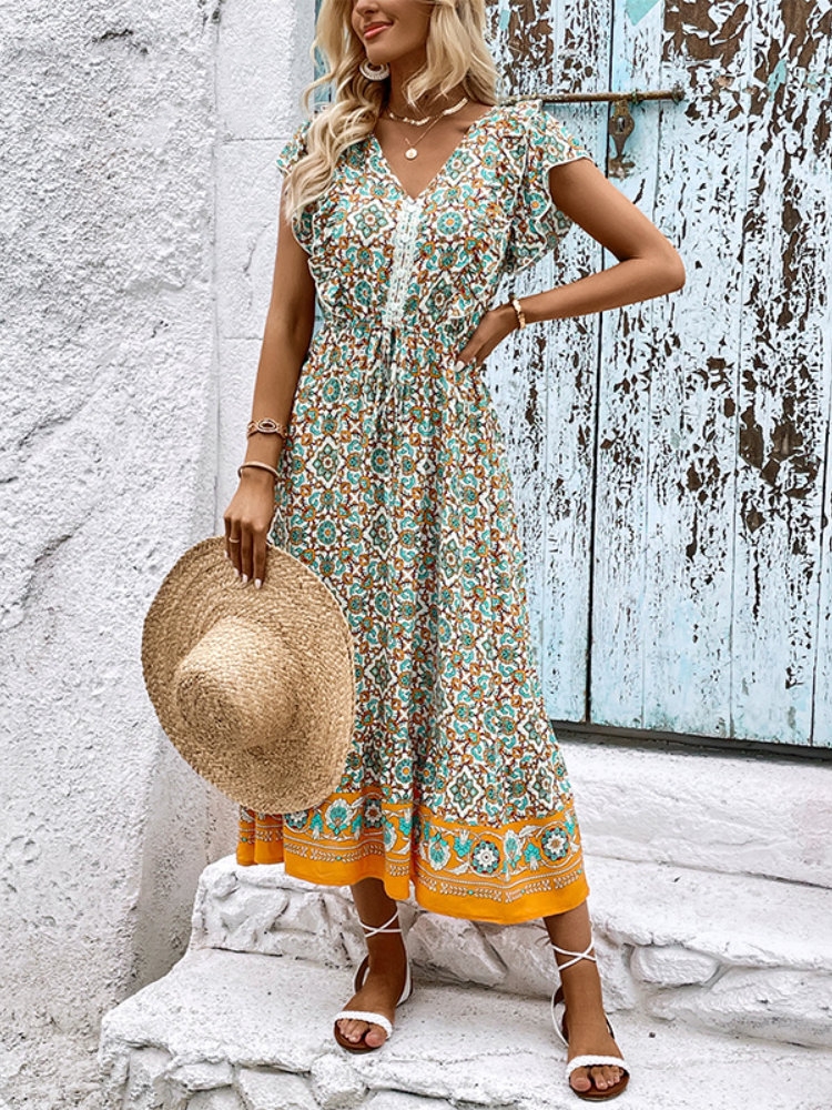 Add to cartElegant Short Ruffle Sleeve Elastic Waist Large Swing Maxi Boho Dress for Women Summer Light Floral Viscose Dresses Outfits