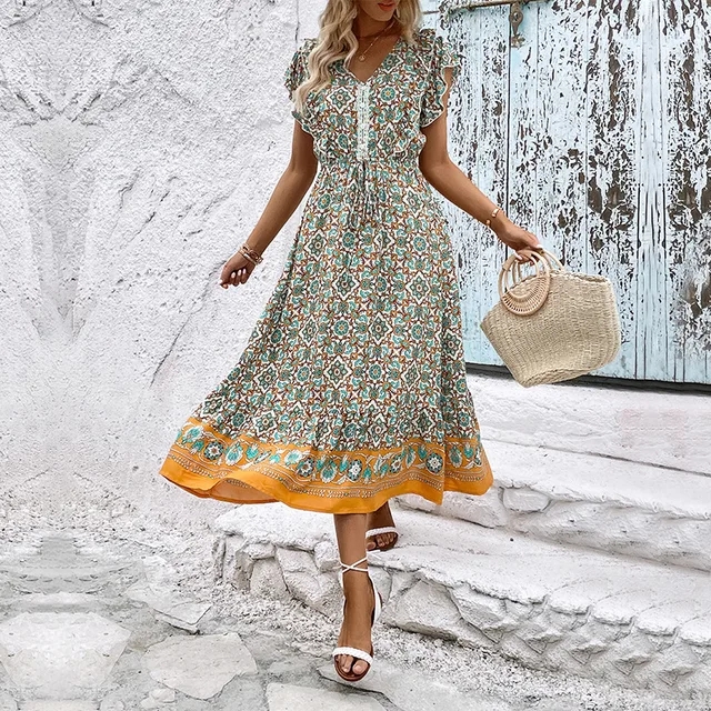 Be the first to review “Elegant Short Ruffle Sleeve Elastic Waist Large Swing Maxi Boho Dress for Women Summer Light Floral Viscose Dresses Outfits” Cancel reply