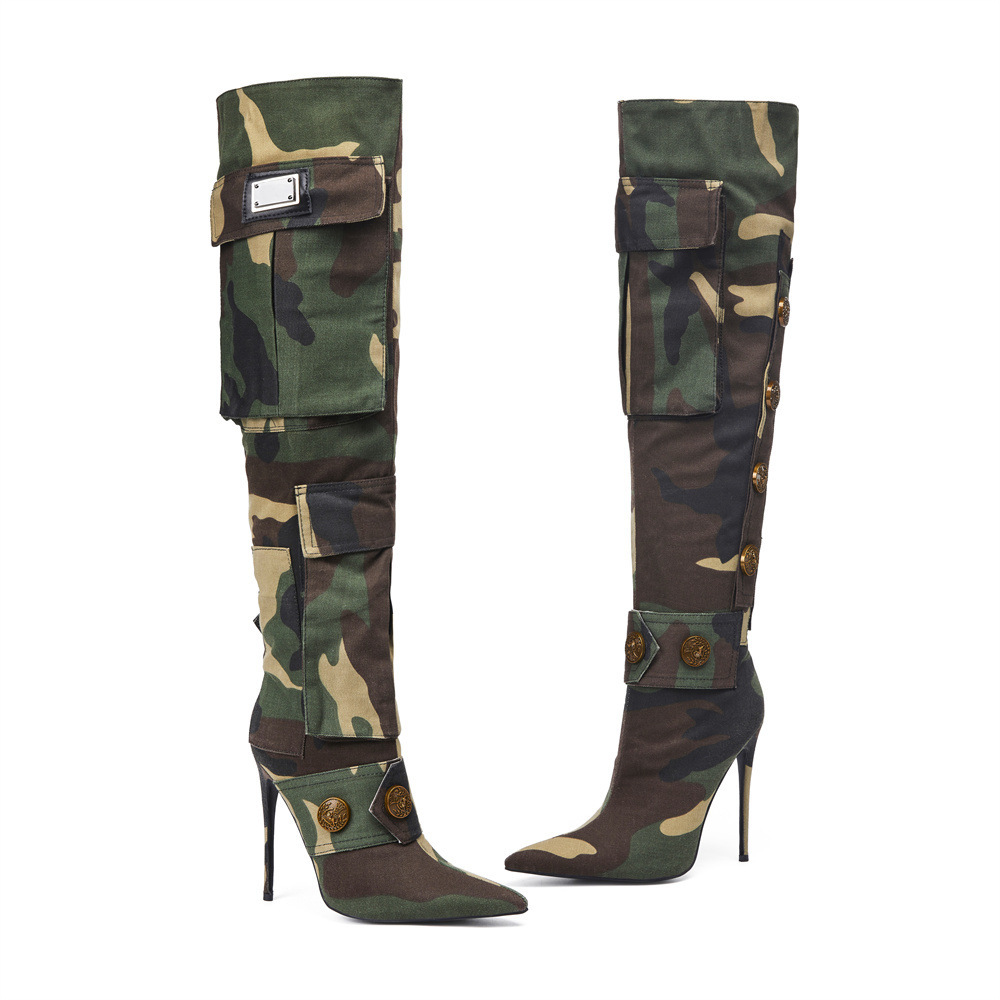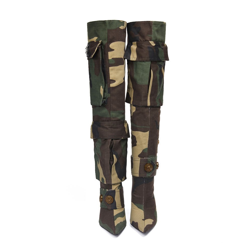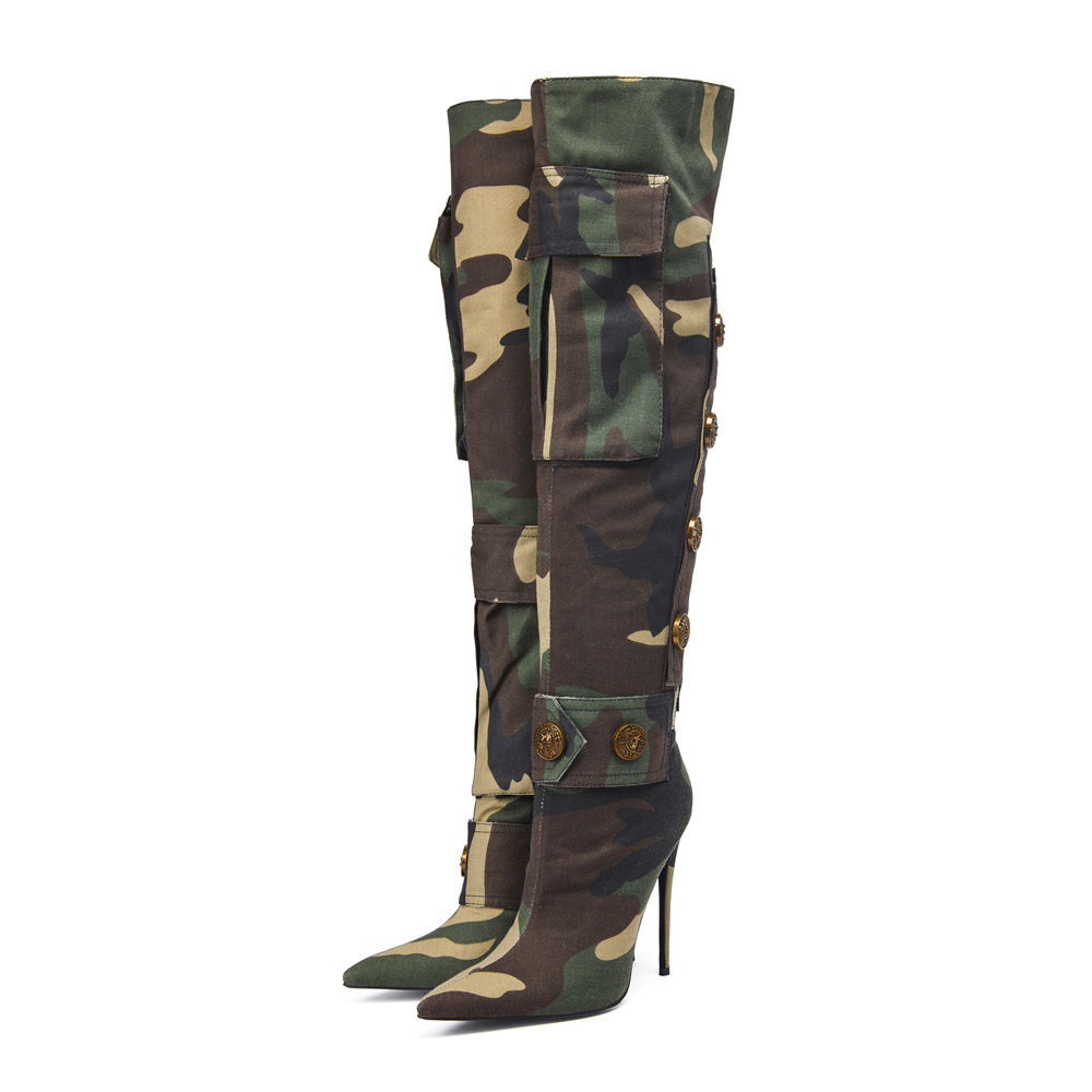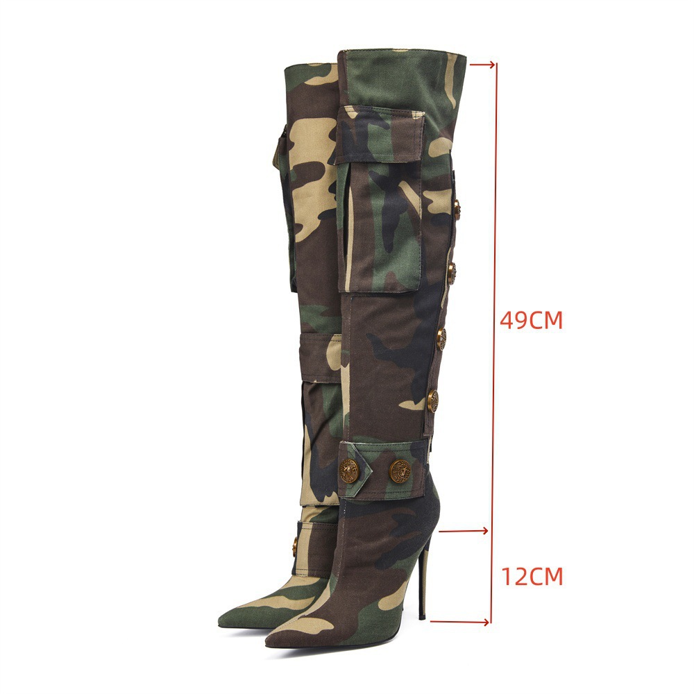 European and American Pointed High Heels Camouflage Rivets Fashion Plus Size Motorcycle Women’s Sleeve Trendy Knee Boots
