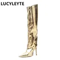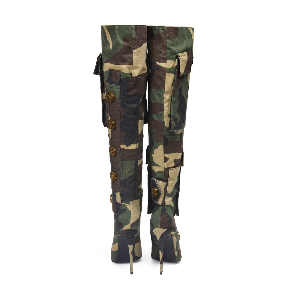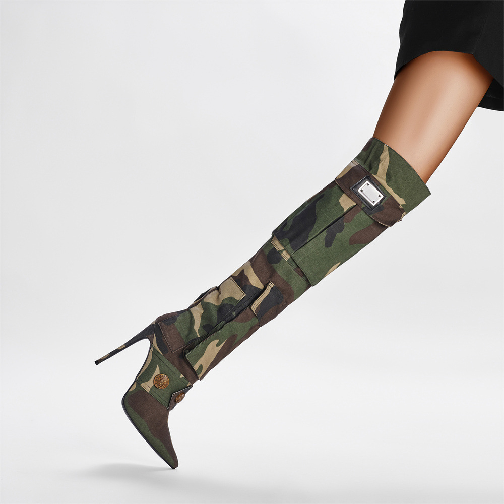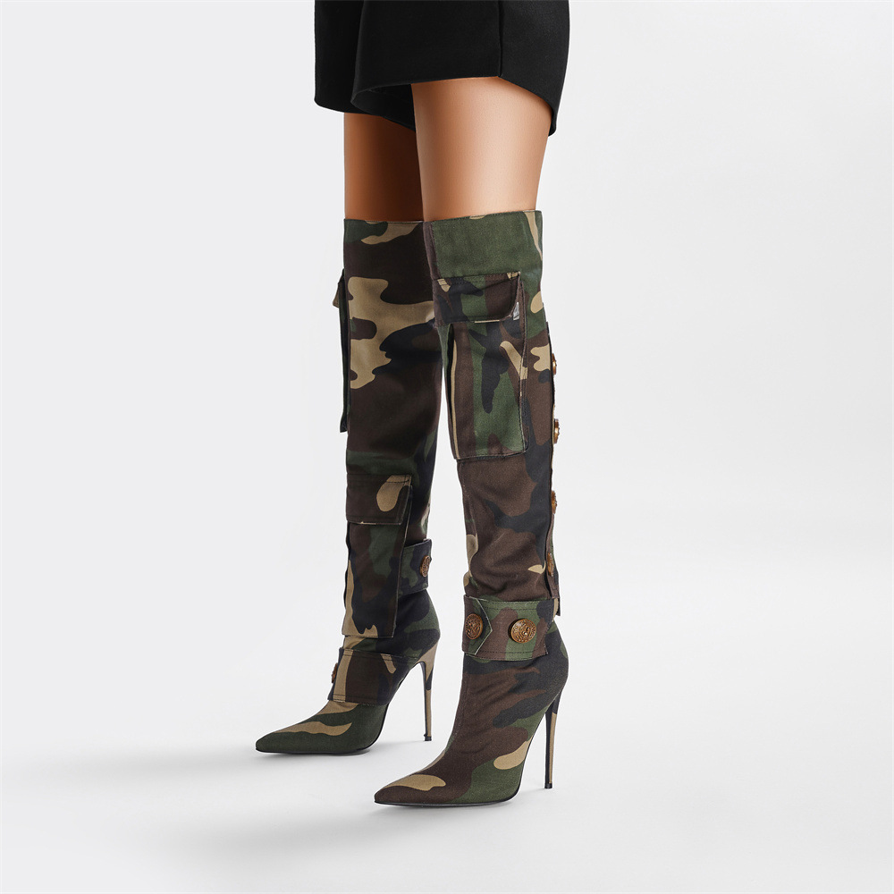 European and American Pointed High Heels Camouflage Rivets Fashion Plus Size Motorcycle Women’s Sleeve Trendy Knee Boots