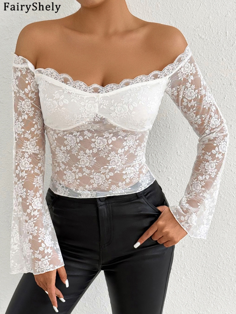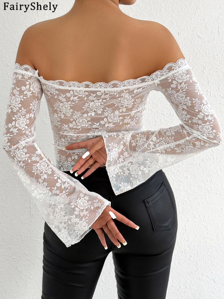 Fairyshely 2025 Sexy Spring White Lace Short Y2K Top Women Ruffle Off Shoulder Bodycon Tops Lady Long Sleeve Club Party Clothes