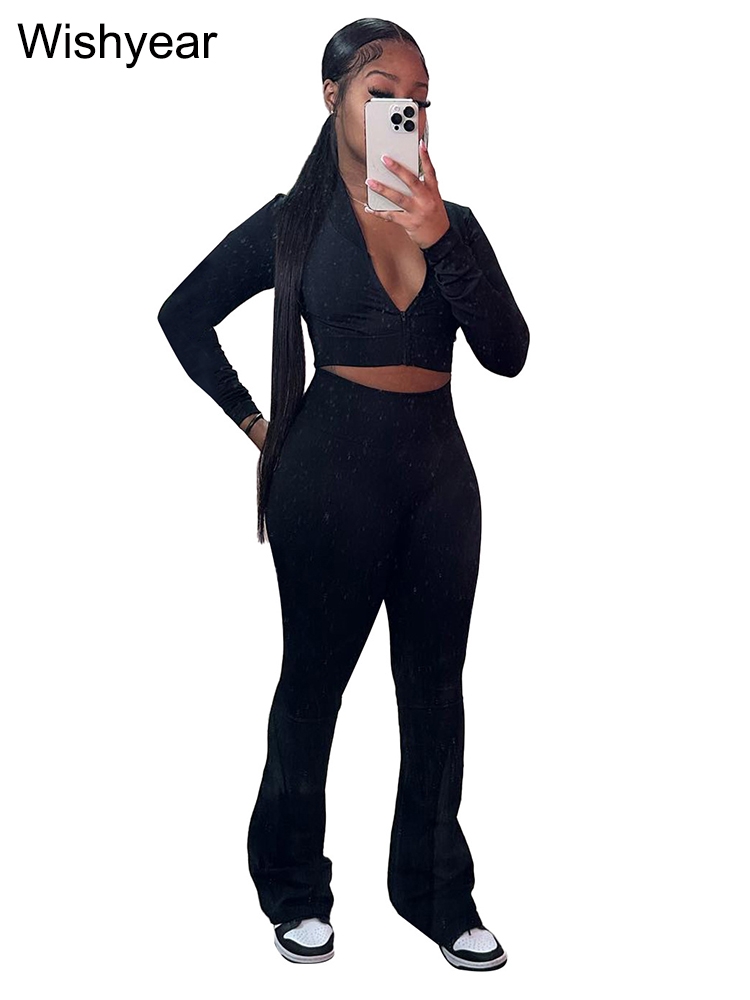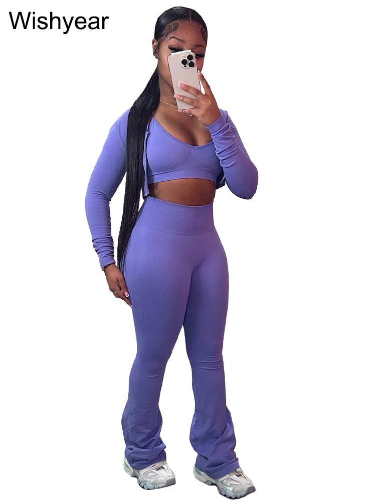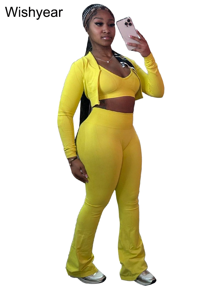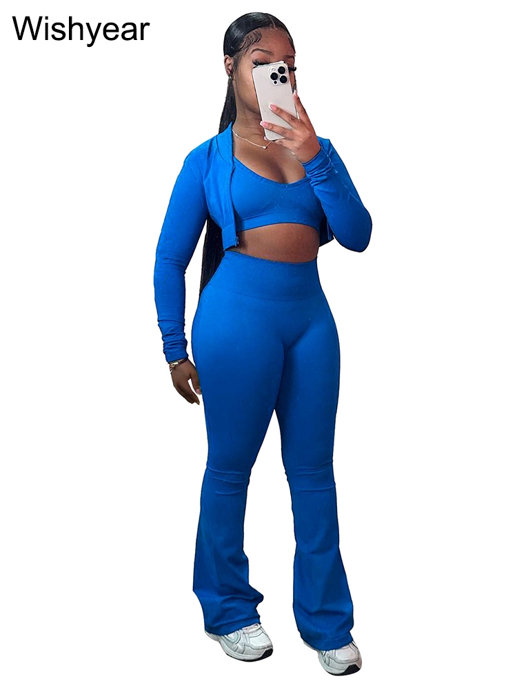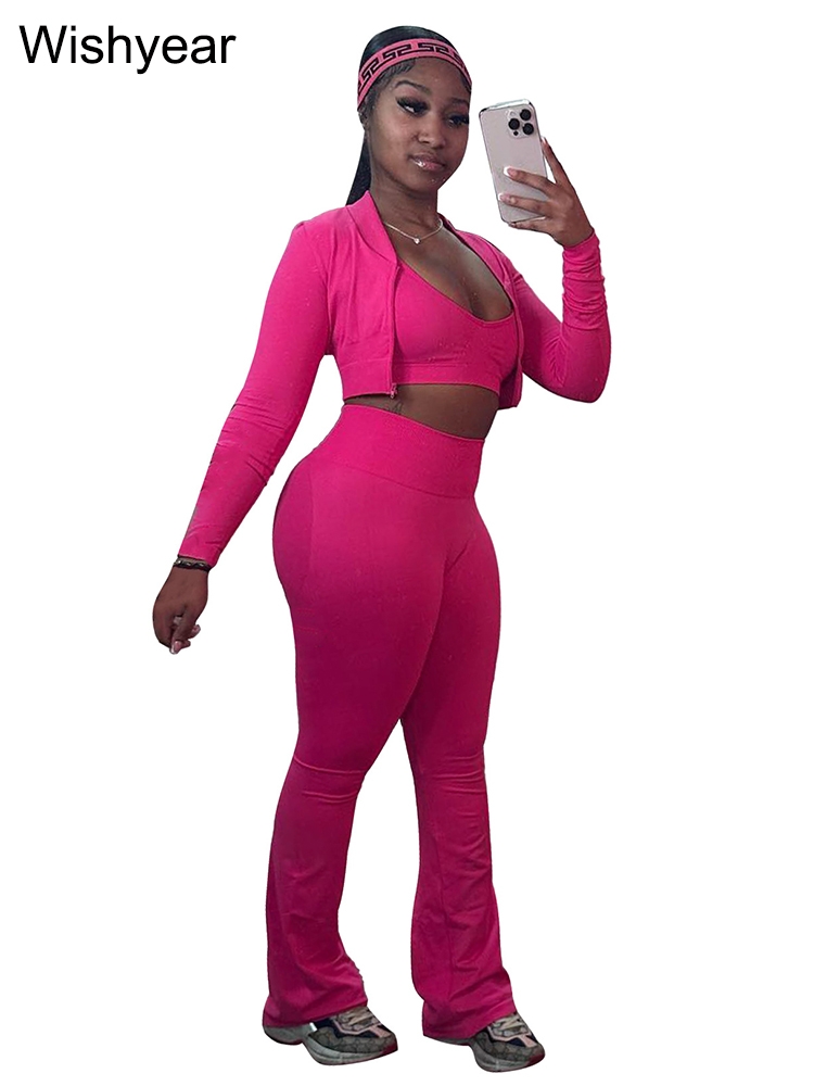 Fashion Solid 3 Pieces Sets Women Long Sleeve Crop Tops+Tanks+Flare Pants Active Fitness Jogging Tracksuits Streetwear Outfits