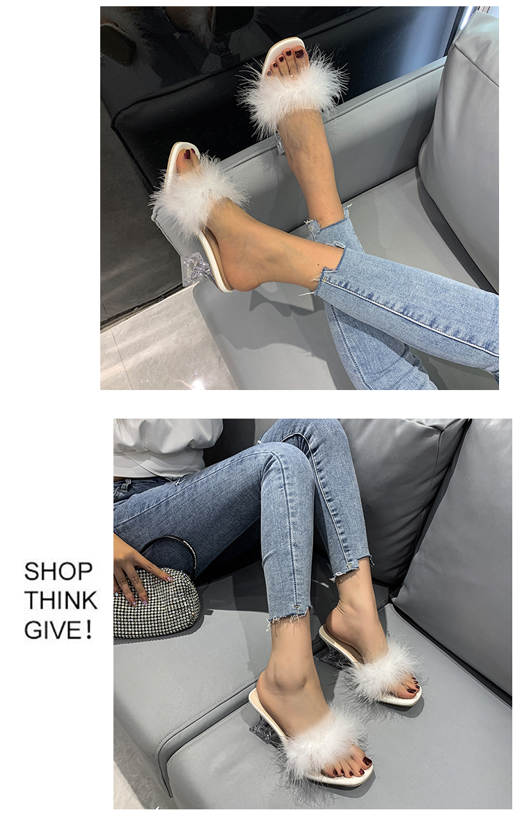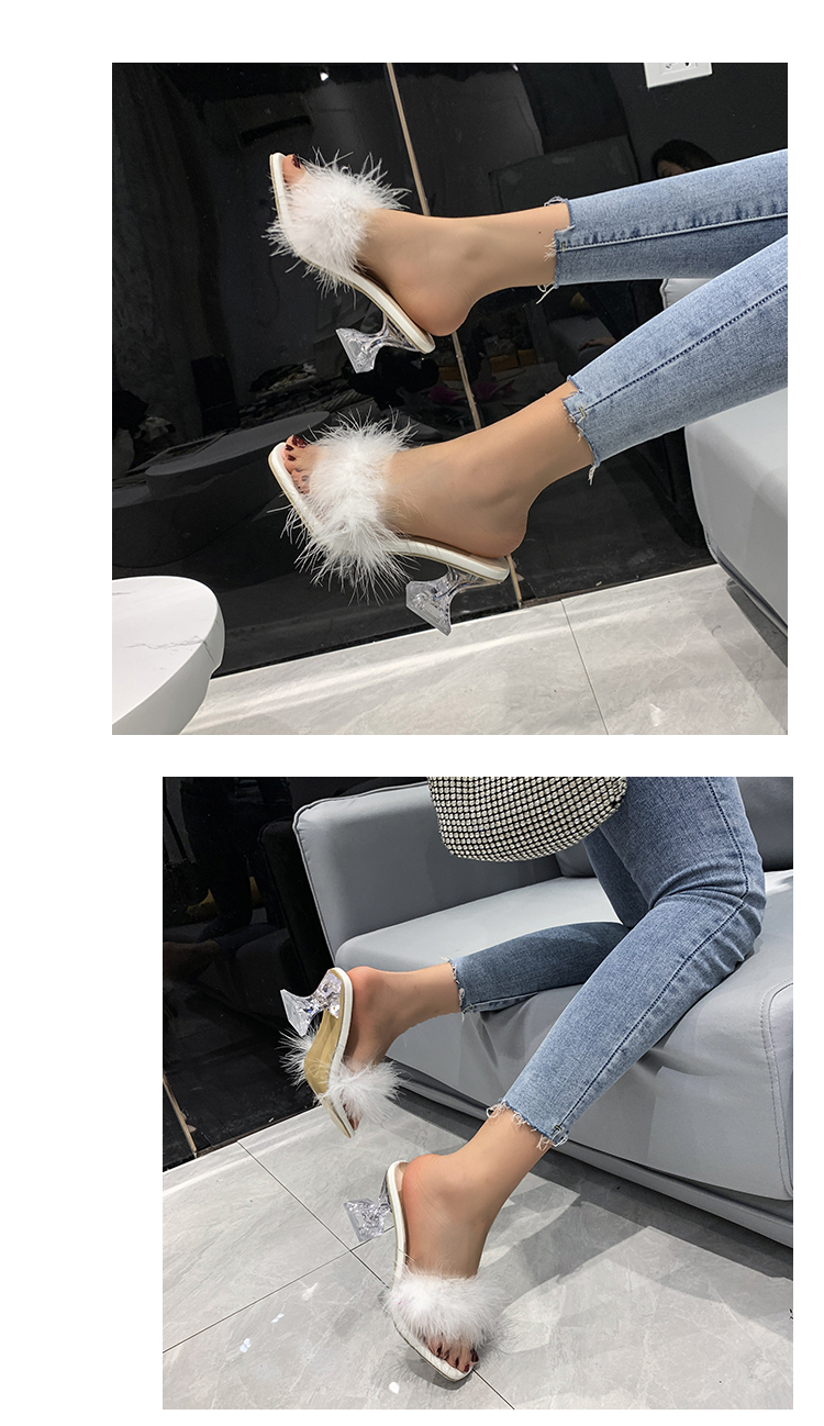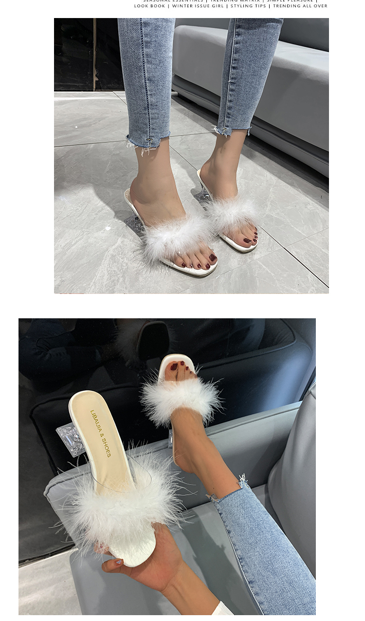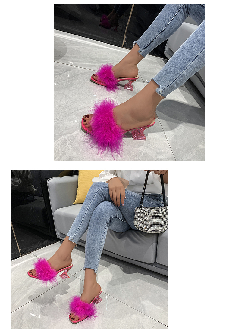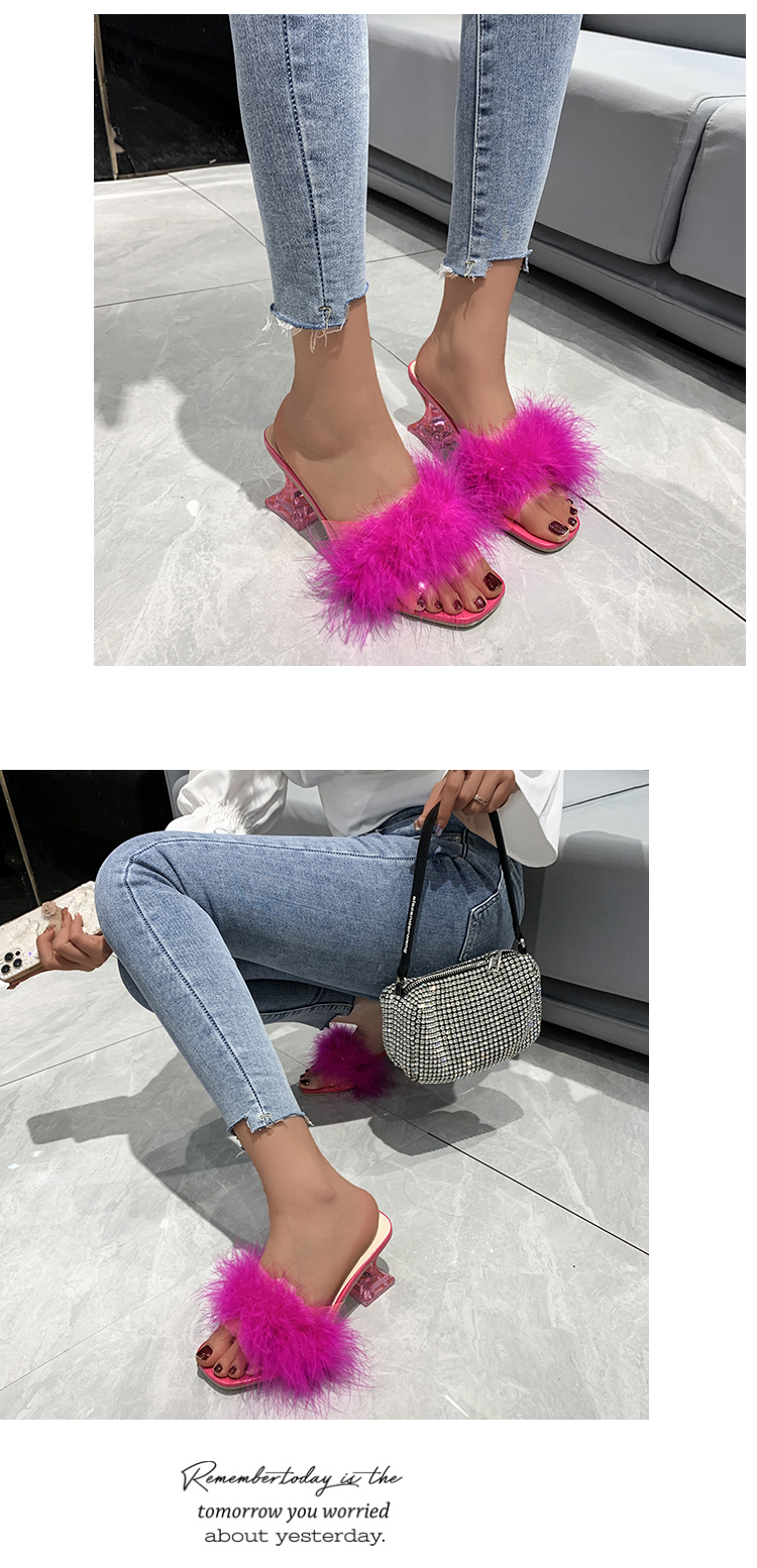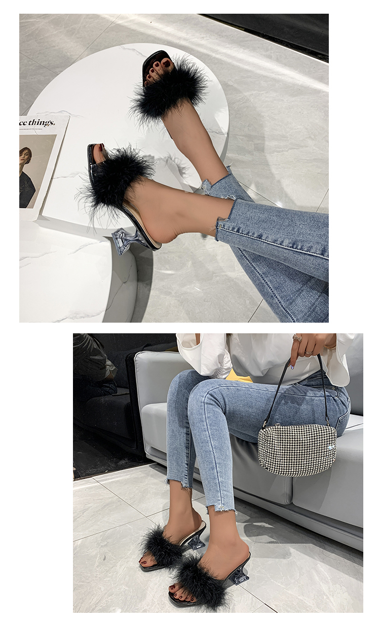 Feather Slippers Transparent Strange High Heels For Women Fashion Clear PVC Square Open Toe Fur Sandals Heels Ladies Mules Slide