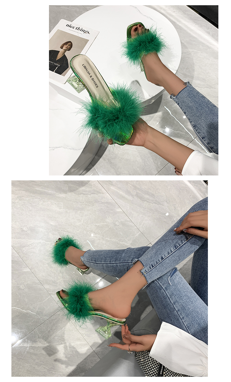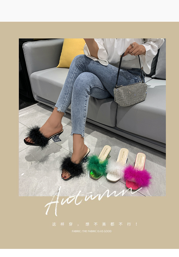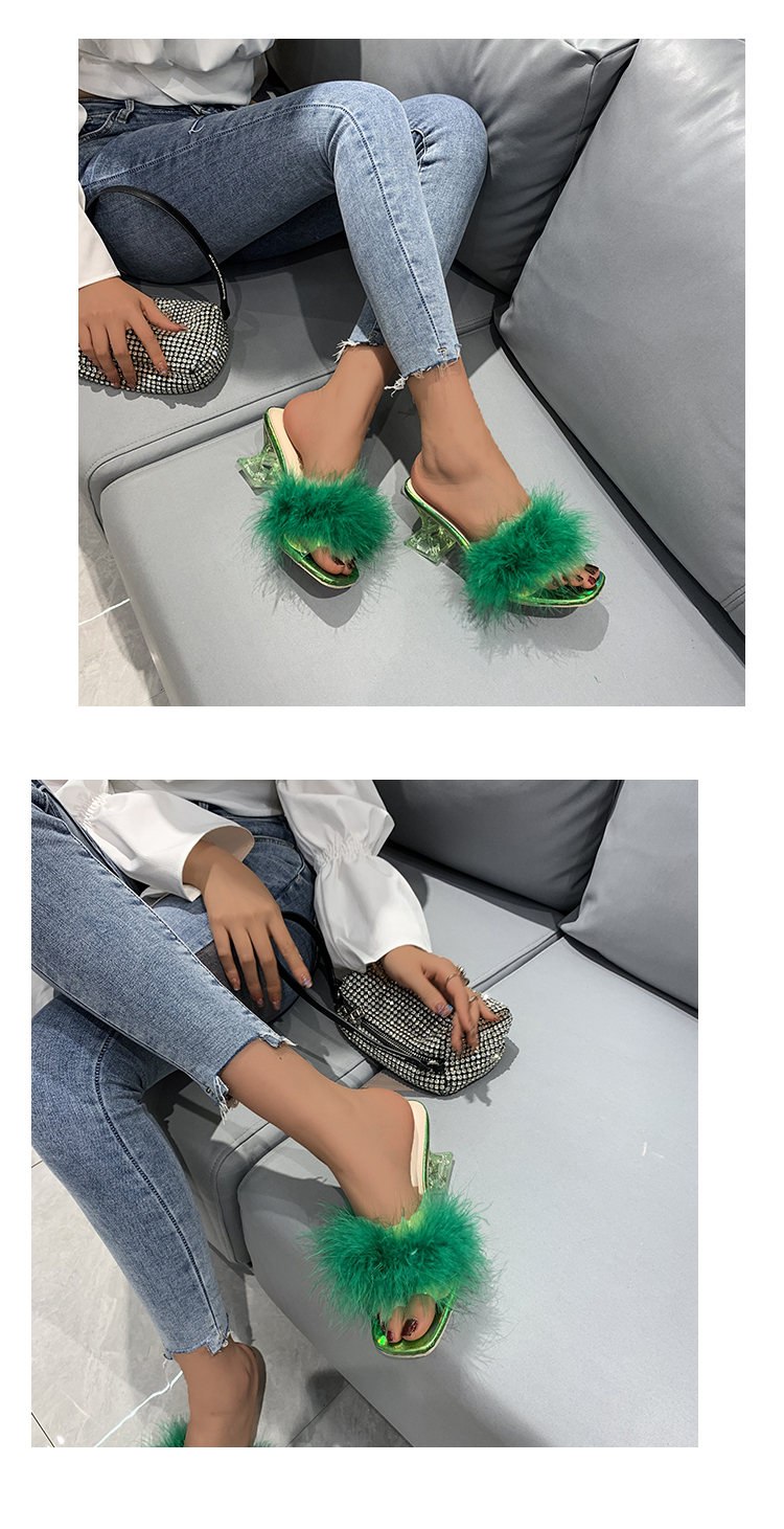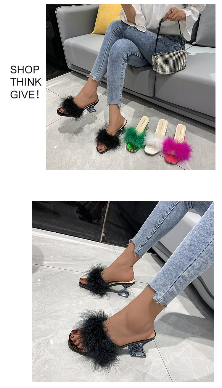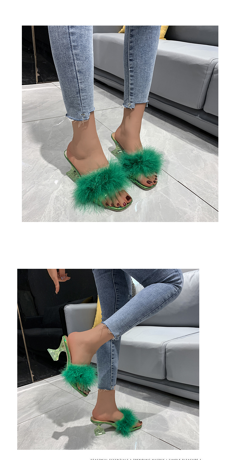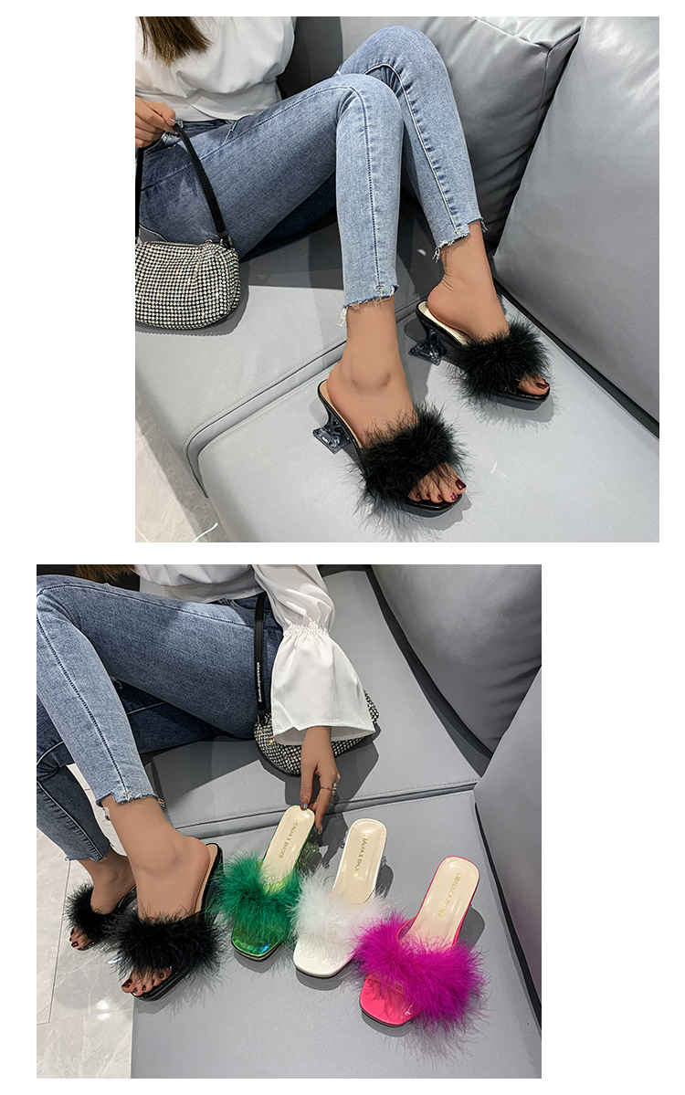 Feather Slippers Transparent Strange High Heels For Women Fashion Clear PVC Square Open Toe Fur Sandals Heels Ladies Mules Slide