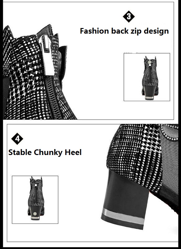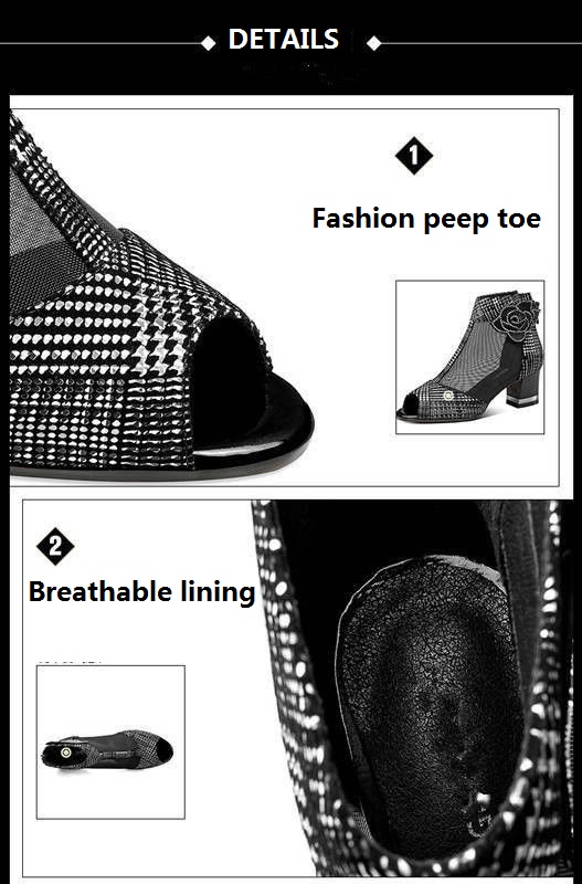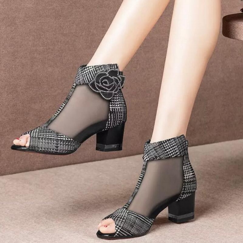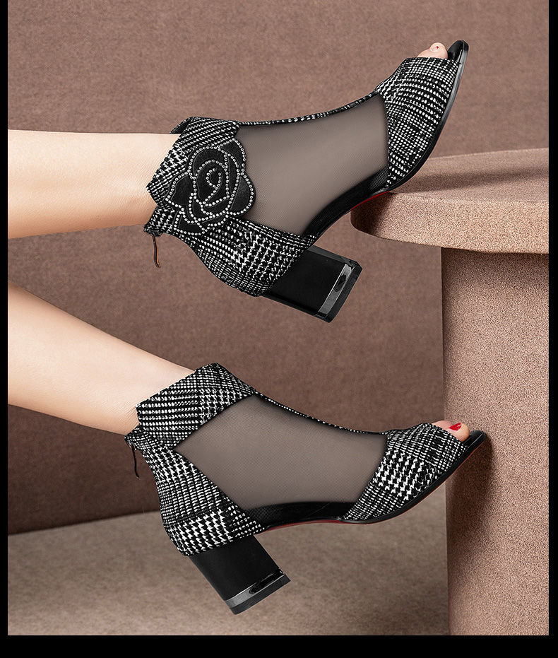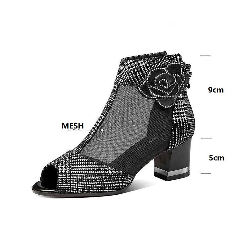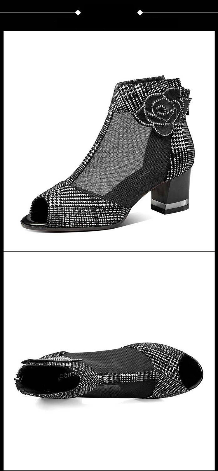 FHC NEW Sandals Boots,Mesh Lace Shose Woman,Peep toe High Heels Sexy Ankle Botas,Back Zip,Chunky Heel,Flower,Black,Red,Dropship