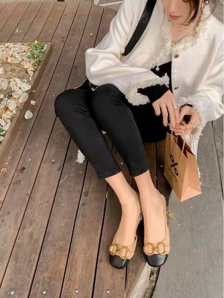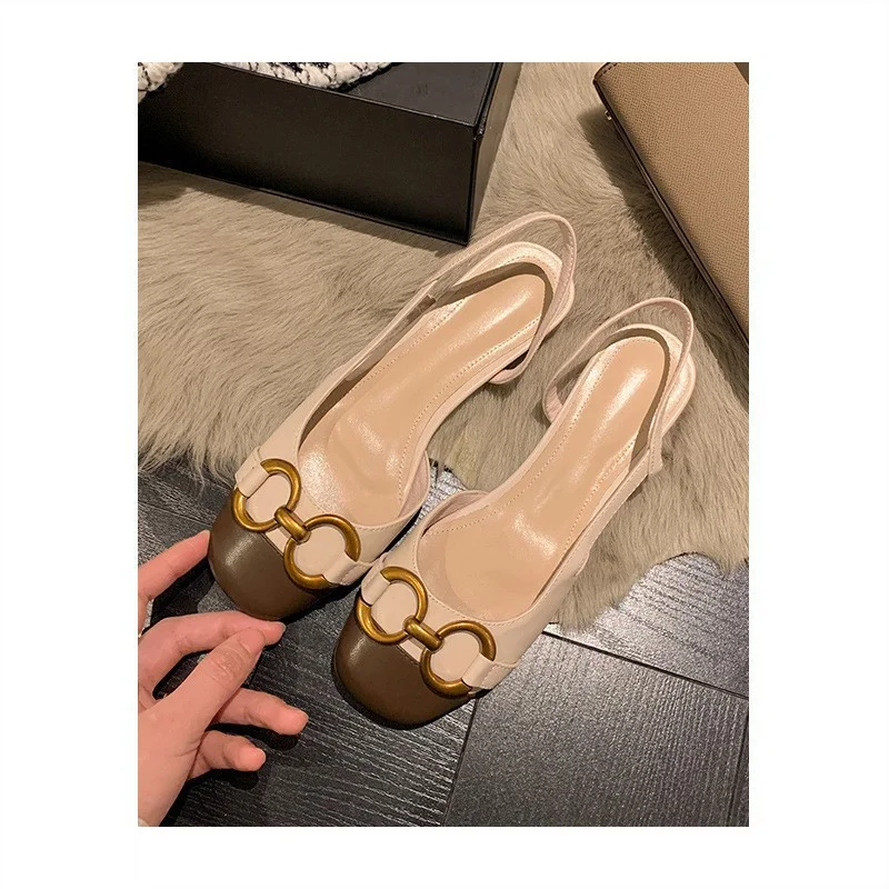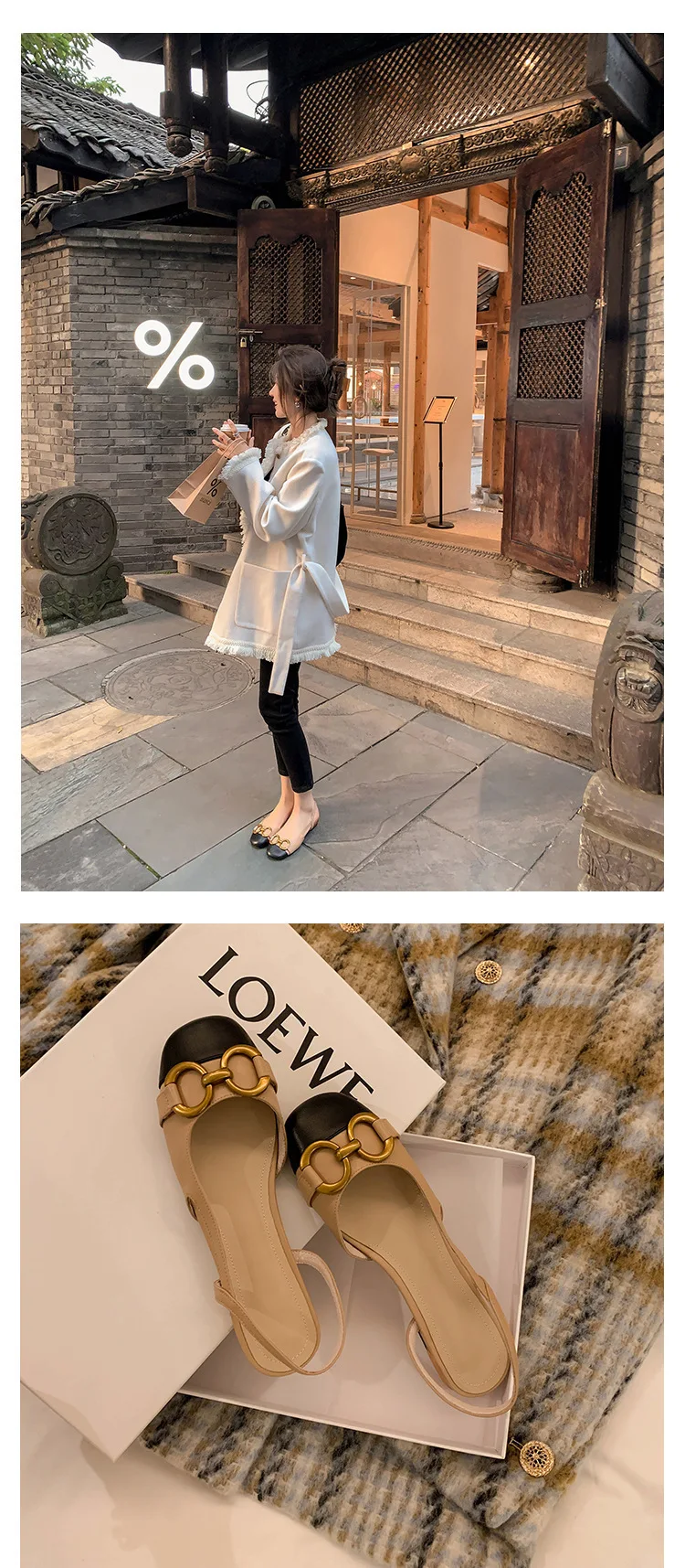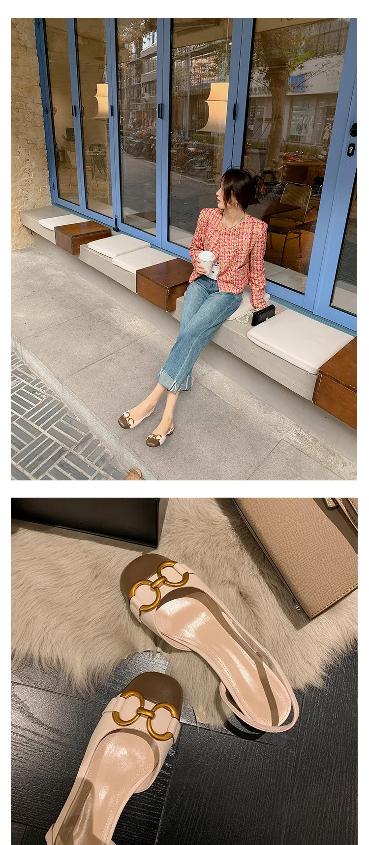 French Retro Baotou Horsebit Women Sandal Real Leather Stitching Low Heels Office Shoes Slip on Sapatos Femininos
