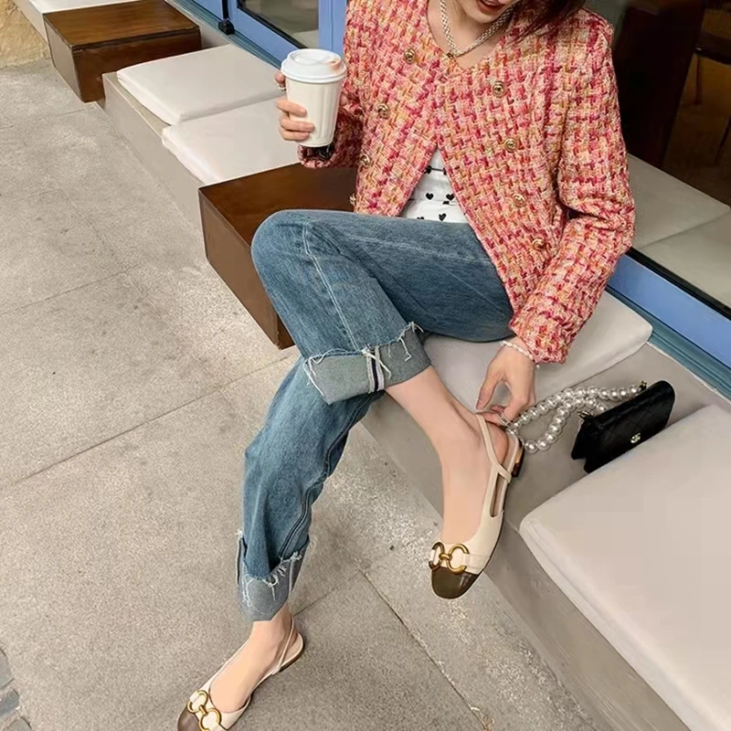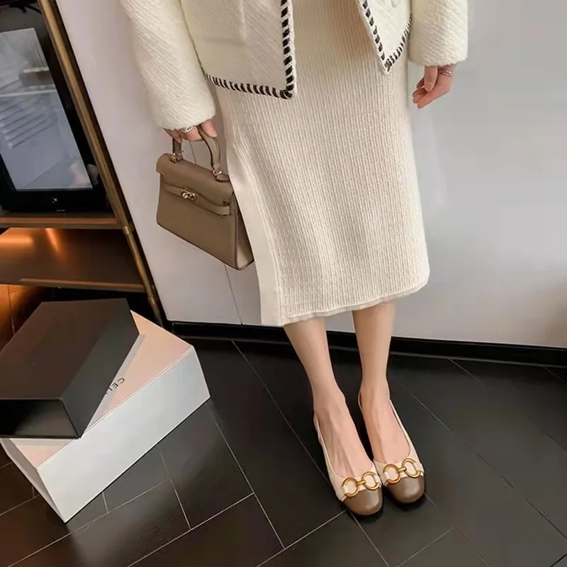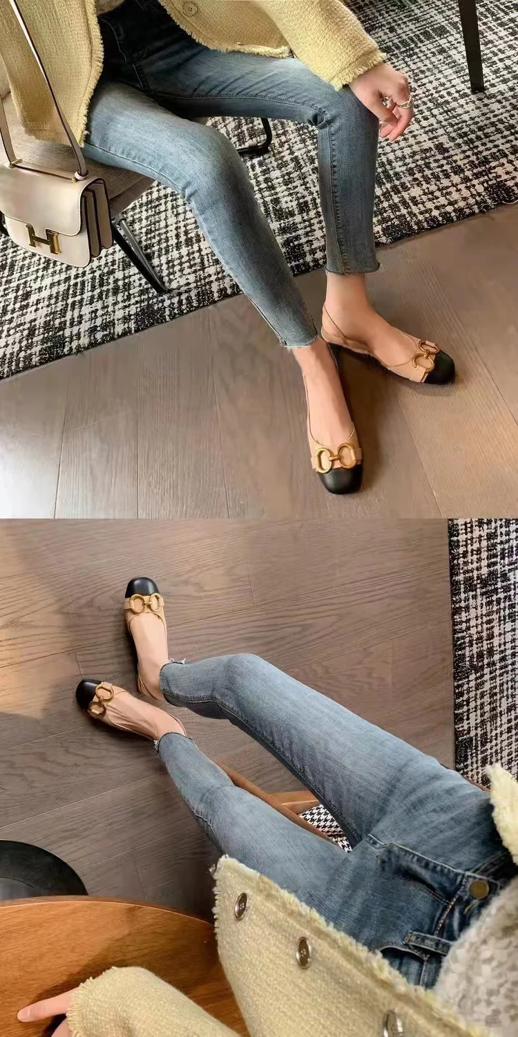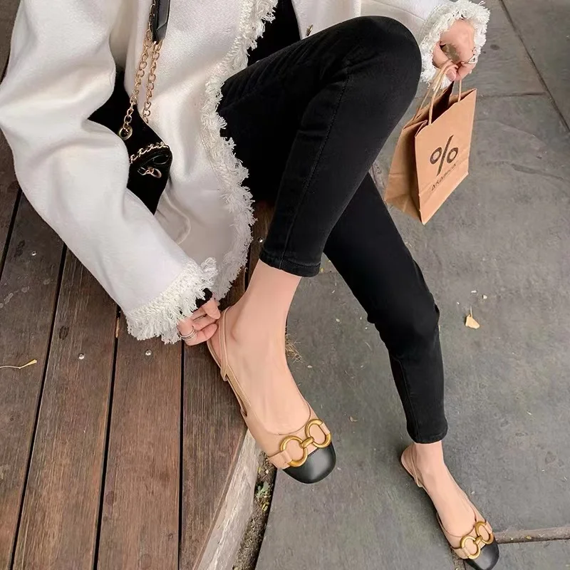 French Retro Baotou Horsebit Women Sandal Real Leather Stitching Low Heels Office Shoes Slip on Sapatos Femininos