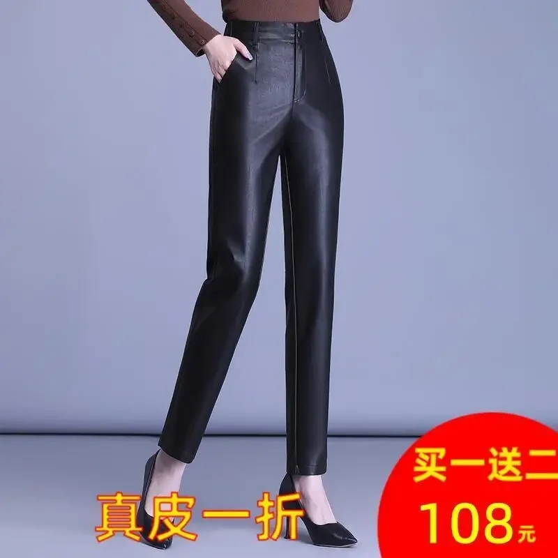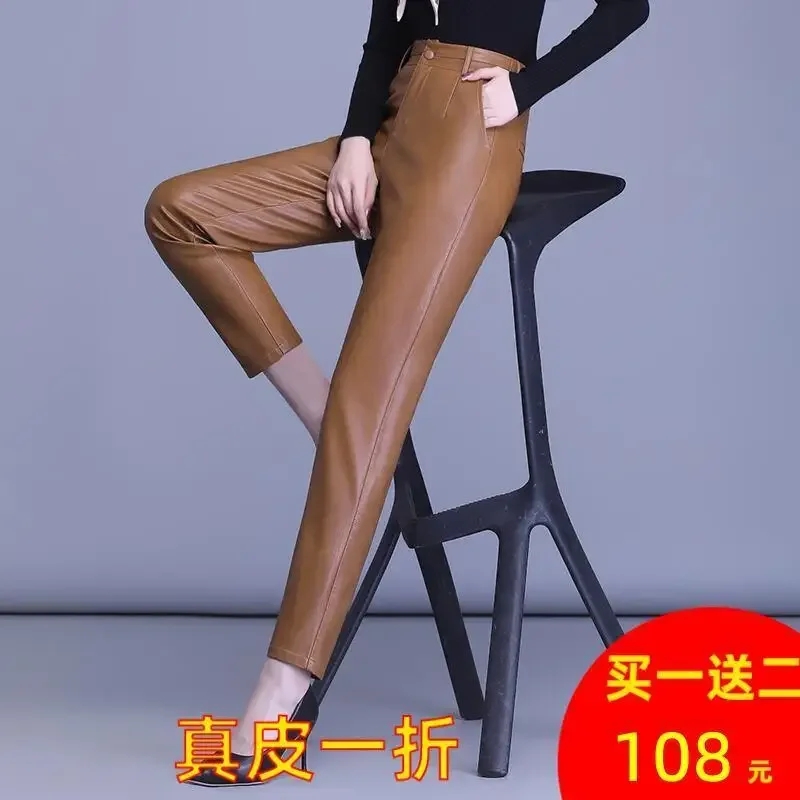 Genuine Leather Pants Women’s Sheepskin Ankle-Tied Harem Autumn and Winter New Casual Pants Elastic High Waist Pants
