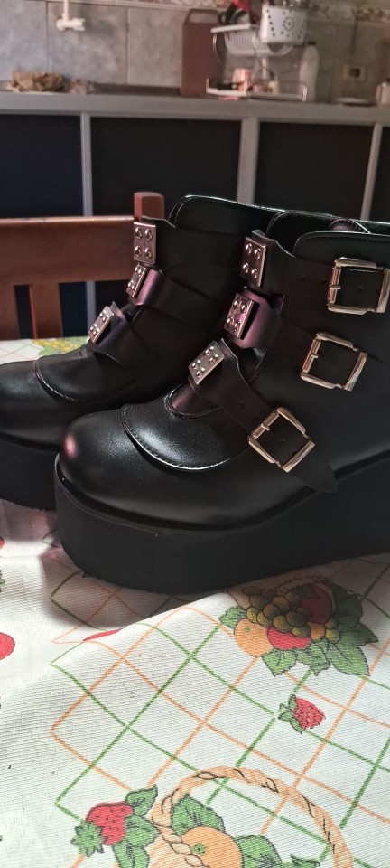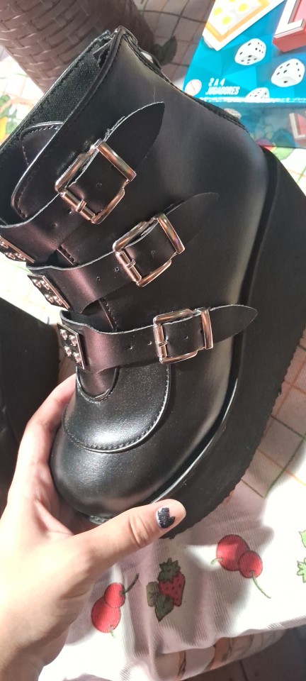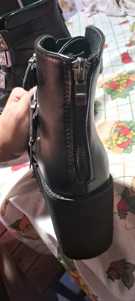 a bota é linda pessoalmente, achei até mais que na própria foto AKAKAKA bem, ela é super confortável, vindo com essas fivelas para ajudar a ajustar nos pés, sem contar que vem com zíper oq é muito bonito e dá um designer maior. eu achava que o salto era maior pela foto, mas pessoalmente não é tão grande não, mas em compensação é ótimo de andar. Se vocês estão procurando praticidade e designer gótico ou punk, é uma ótima opção, ainda mais pelo orçamento.