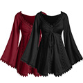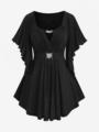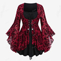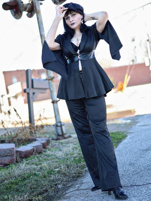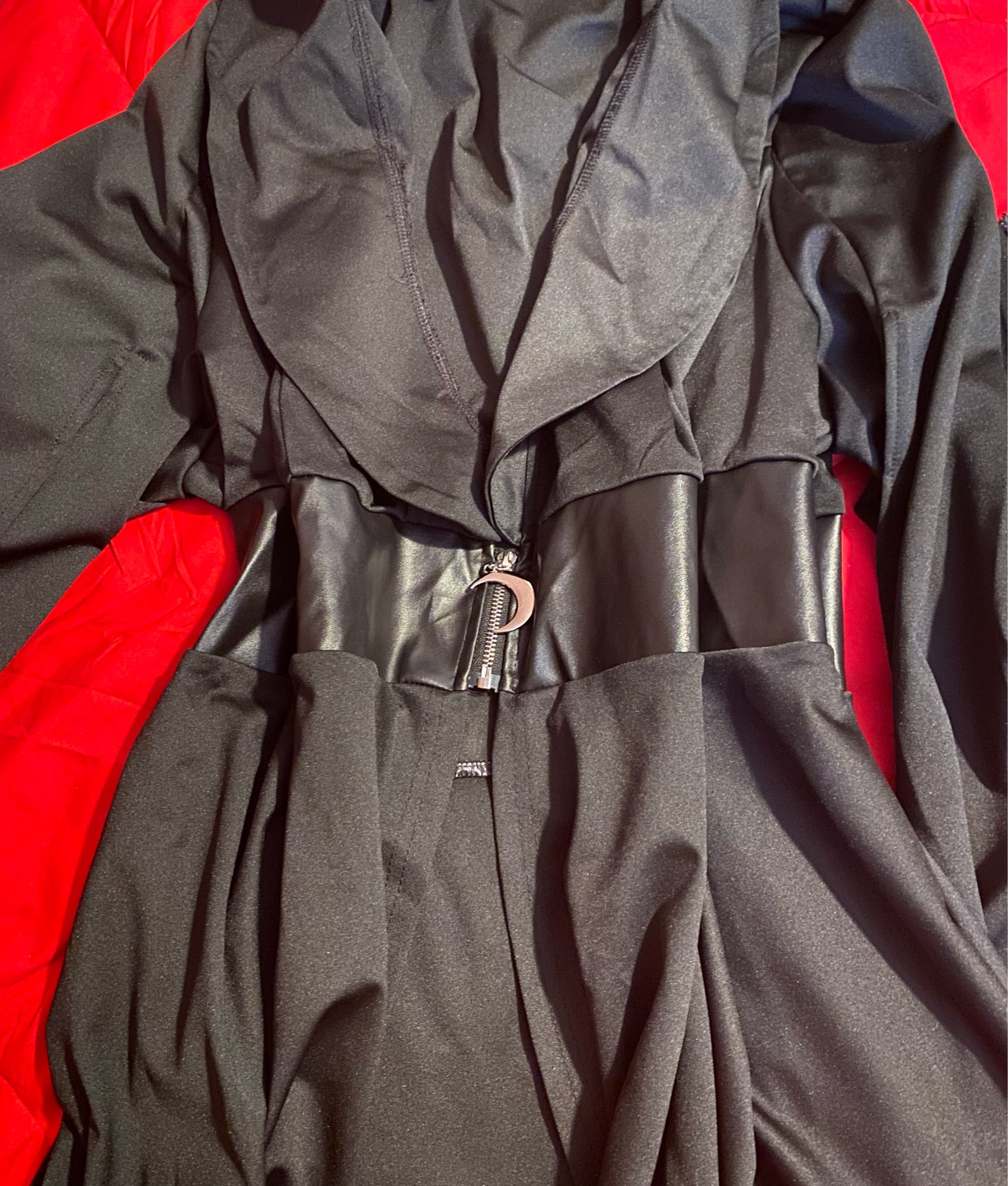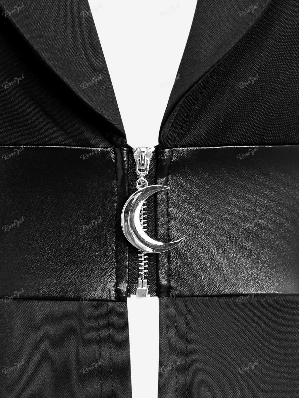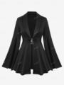 Gothic Lapel Collar Split Flutter Sleeves PU Panel Zipper Belted Ruched Coat