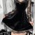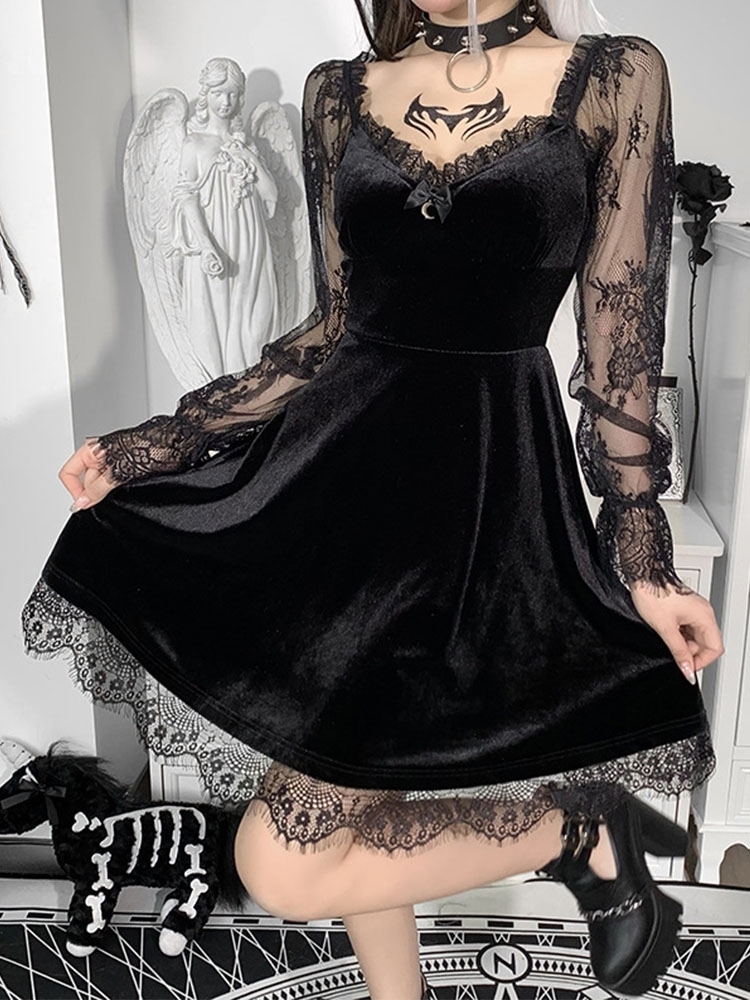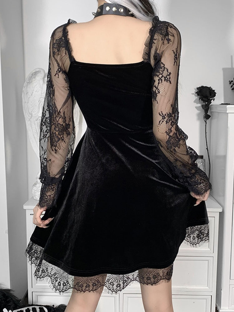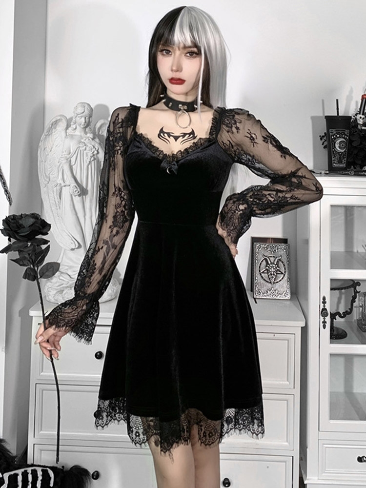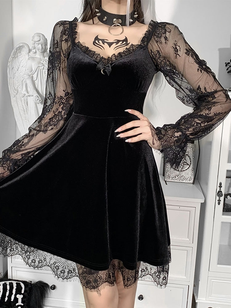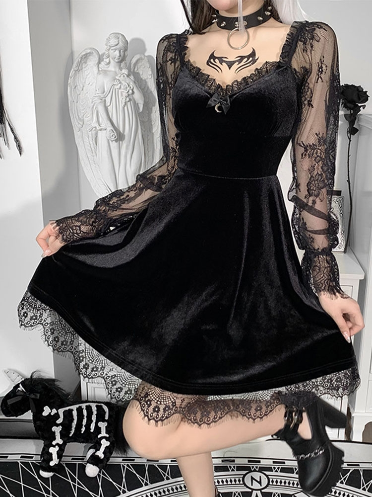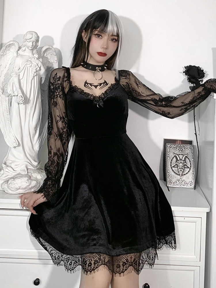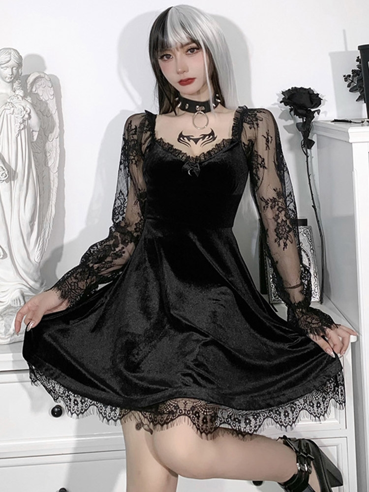 Gothic Lolita Girl Lace Trim Velvet A-Line Dress Women Sexy Perspective Long Sleeve V Neck Slim Mini Dress Cosplay Party Costume