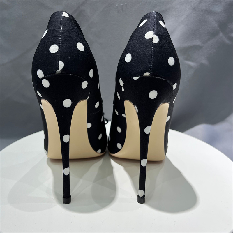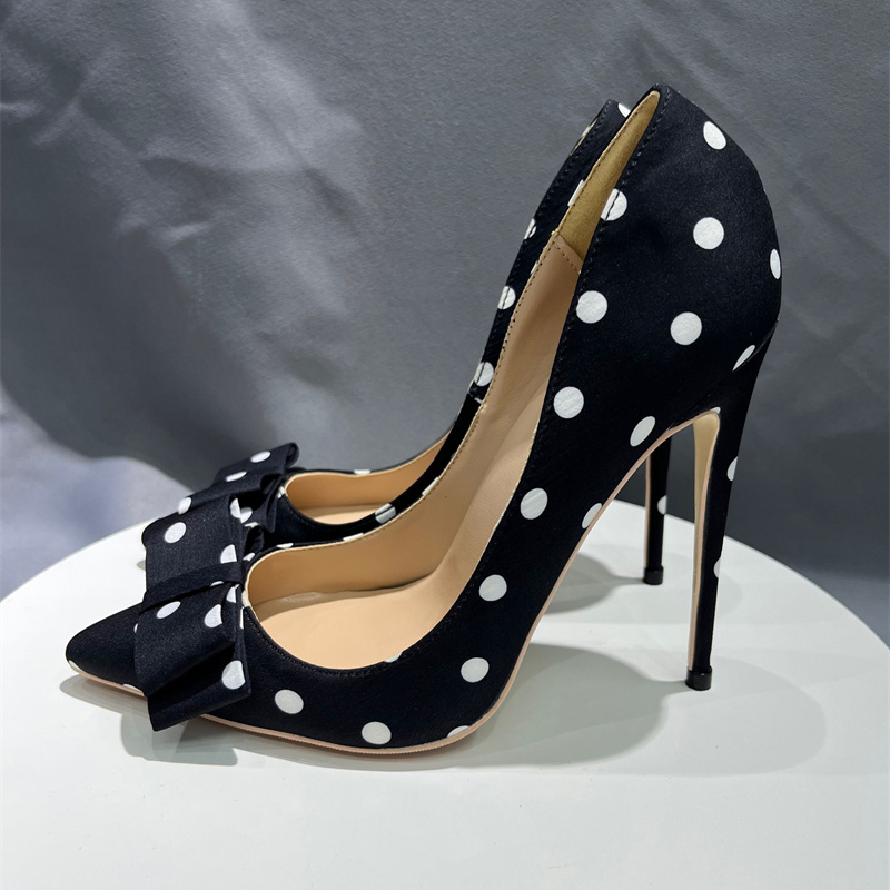 Heelgoo Polka Dot Bow Women Black Satin Sexy Pointy Toe High Heel Shoes Elegant Ladies Party Dress Stiletto Pumps Size 33-46