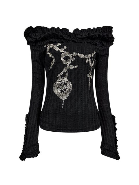 Sexy Punk Outfits 2 Piece Set Slash Neck Black Top Jacquard + Patchwork Wrapped Hip Skirt Asymmetrical Coquette Gothic Clubwear