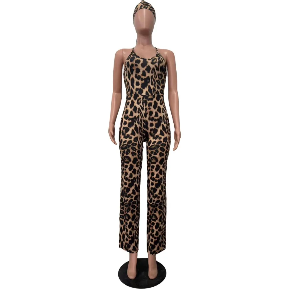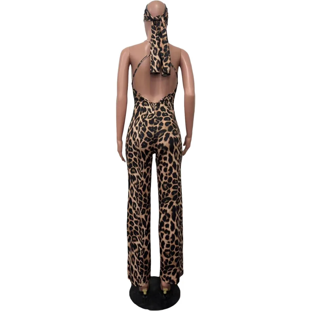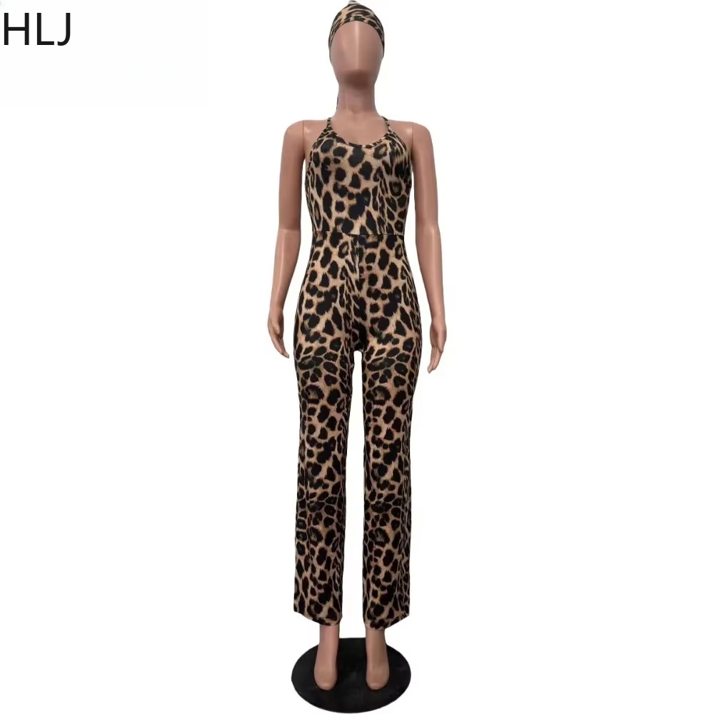 HLJ Sexy Leopard Print Bodycon Jumpsuits Women Thin Strap Sleeveless V Neck Wide Leg Pants Playsuit Female Overall With Scarf