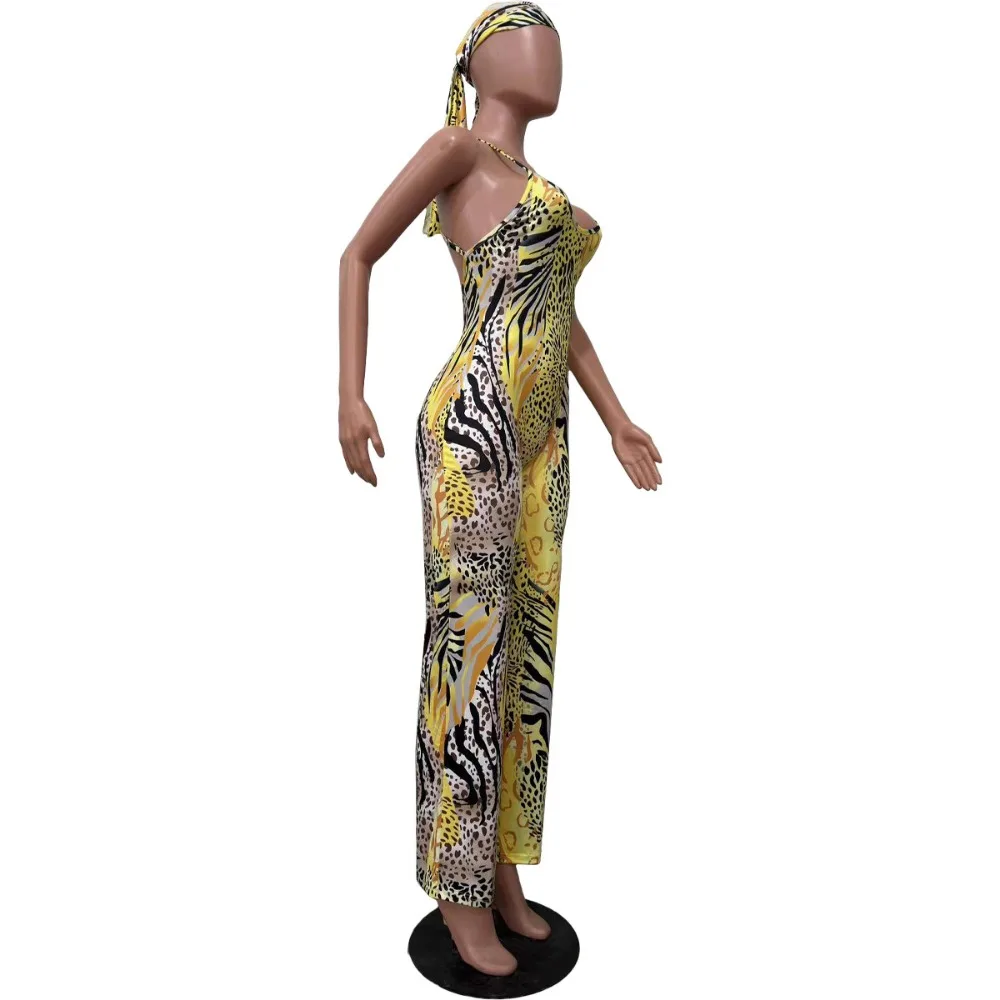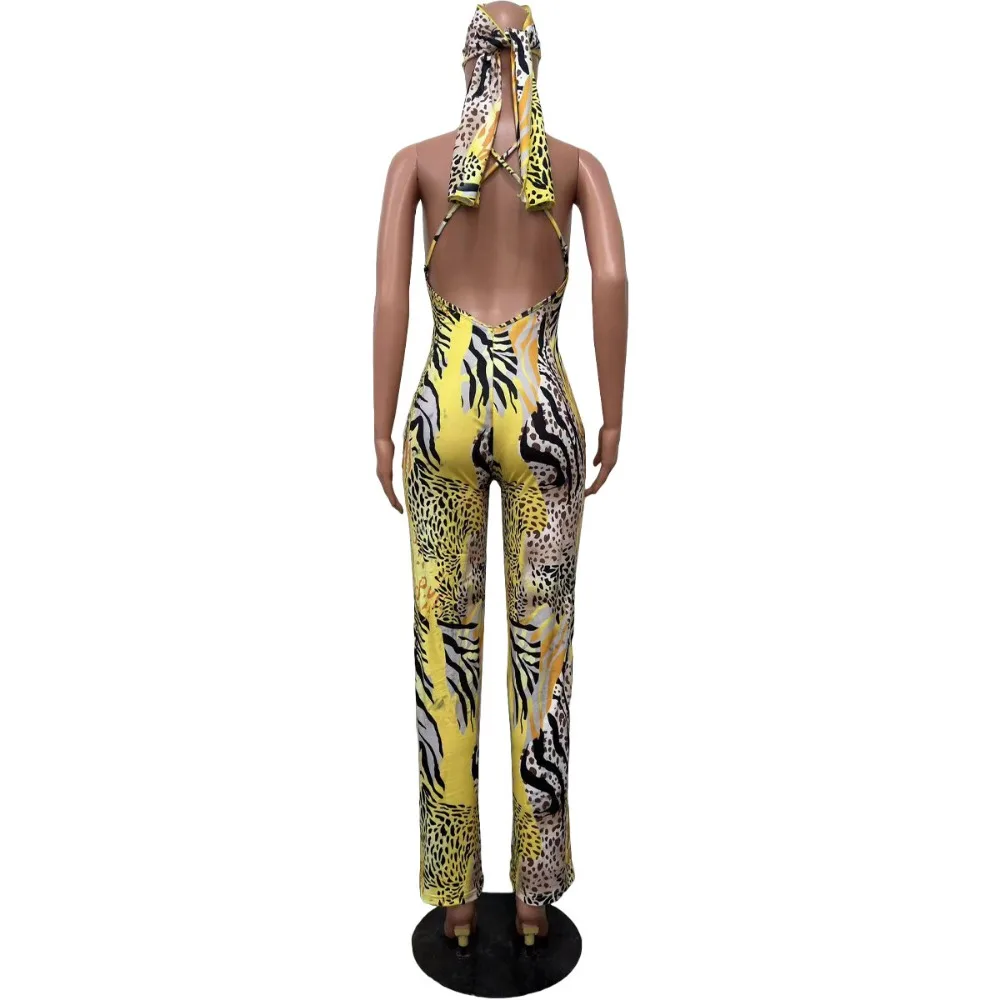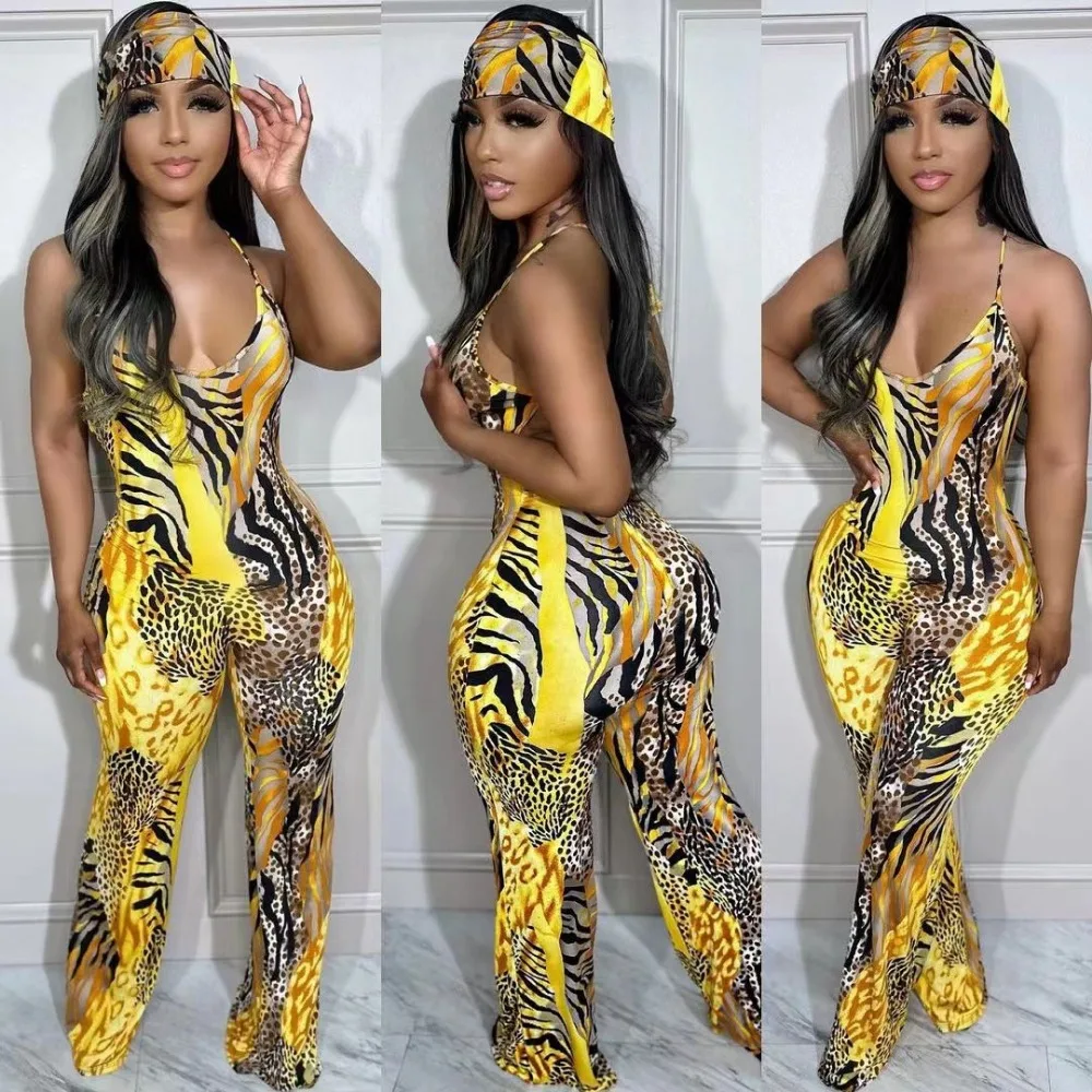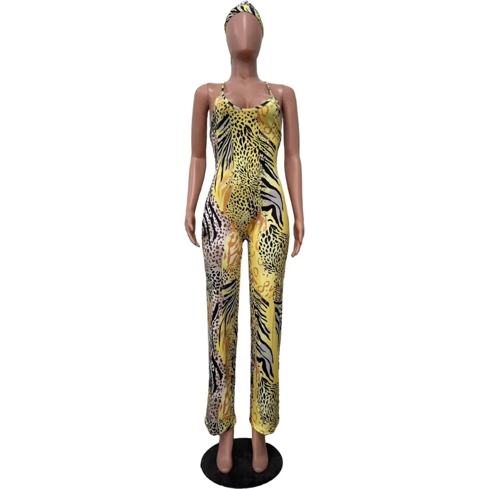 HLJ Sexy Leopard Print Bodycon Jumpsuits Women Thin Strap Sleeveless V Neck Wide Leg Pants Playsuit Female Overall With Scarf