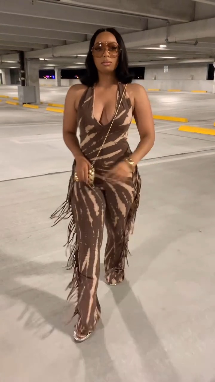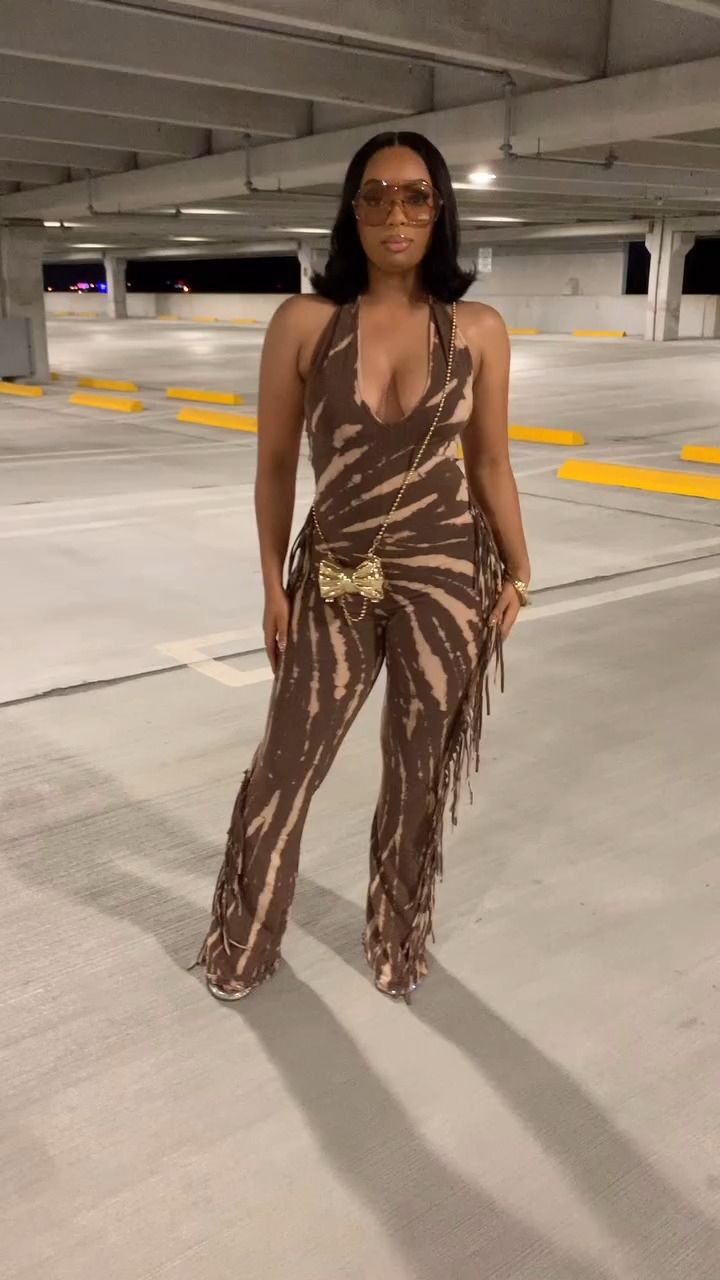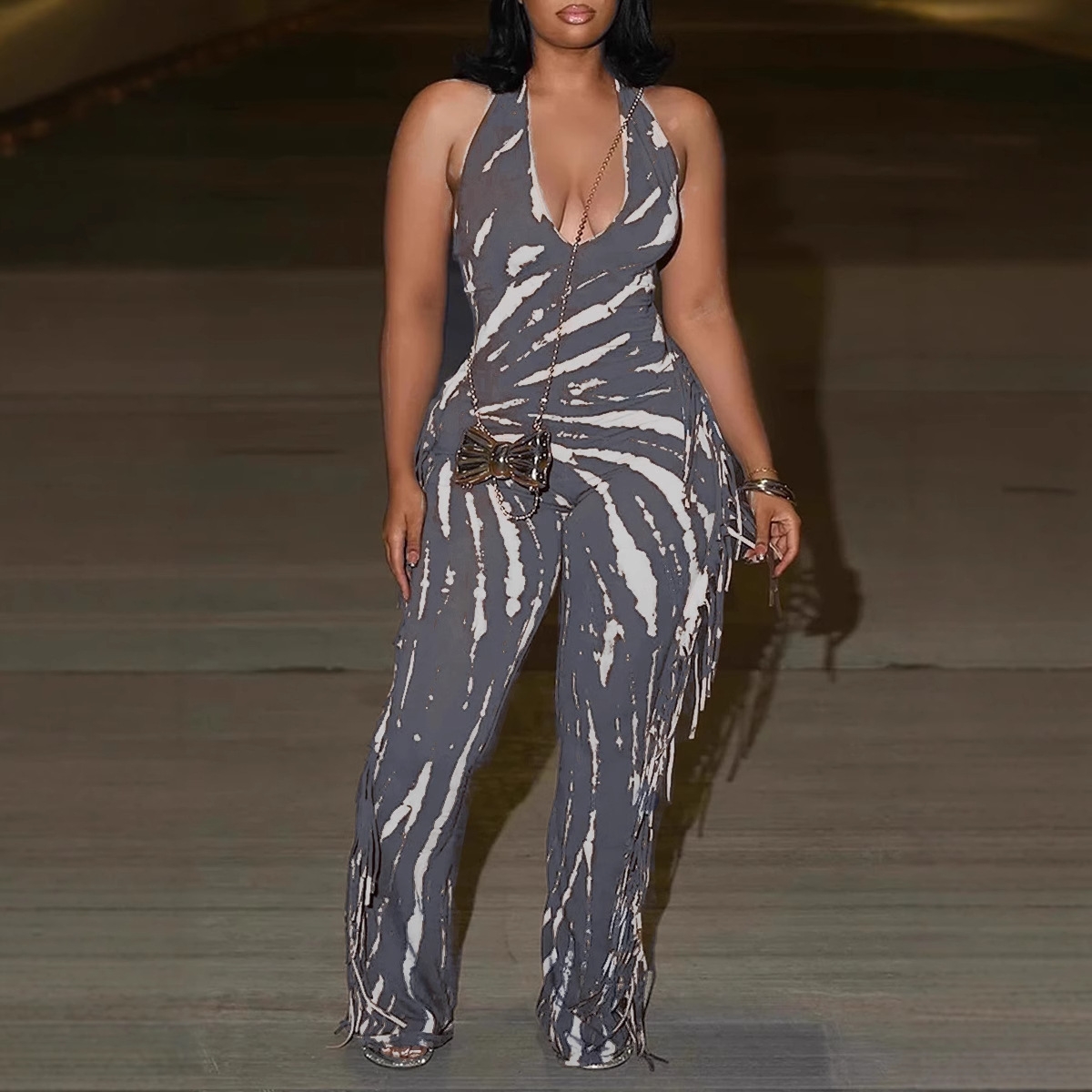 HLJ Sexy Striped Print Tassel Patchwork Bodycon Jumpsuit Women Halter Backless Skinny Rompers Female Party Clubwear Overalls New