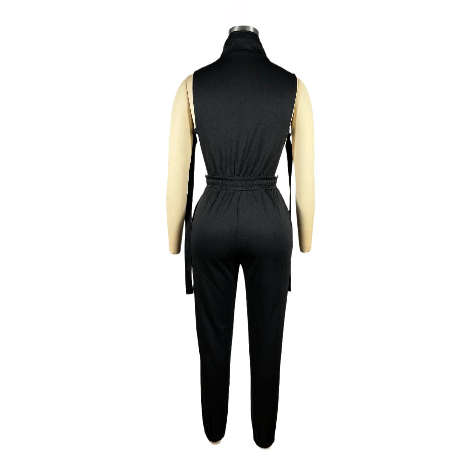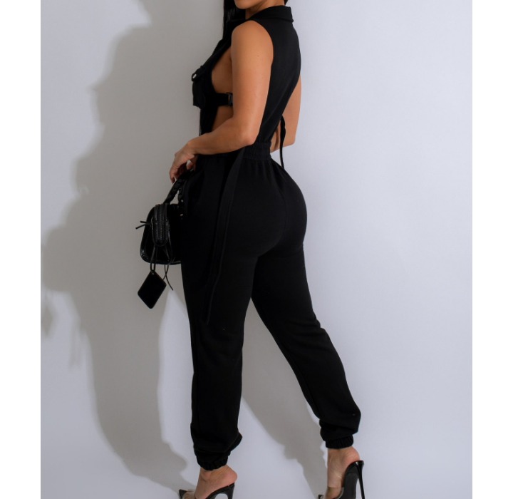 Women’s V-age neck hanging, backless, lace up, solid color, pit stripe, slim fit, sexy hot girl jumpsuit