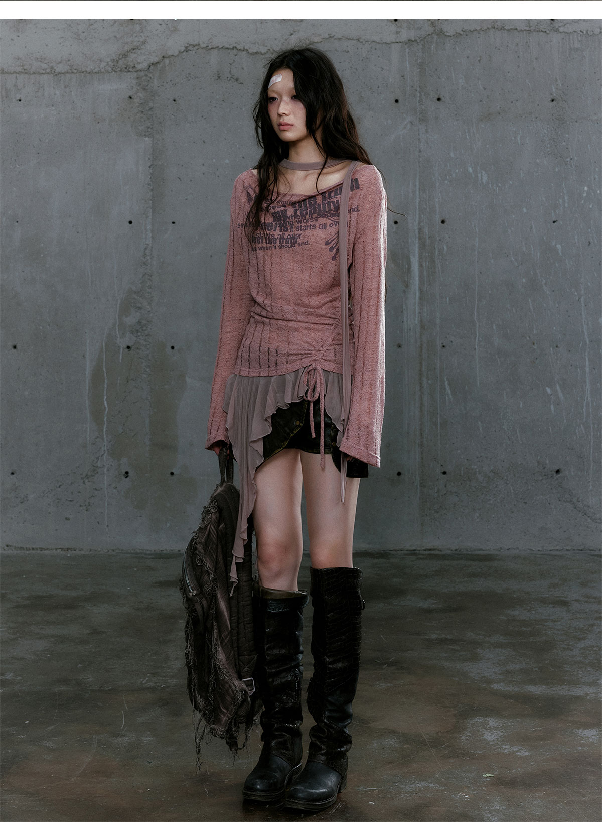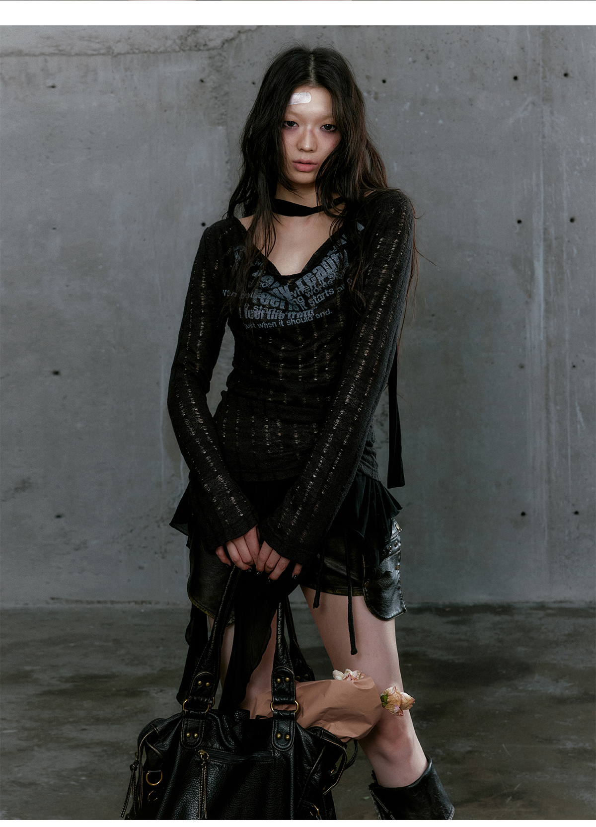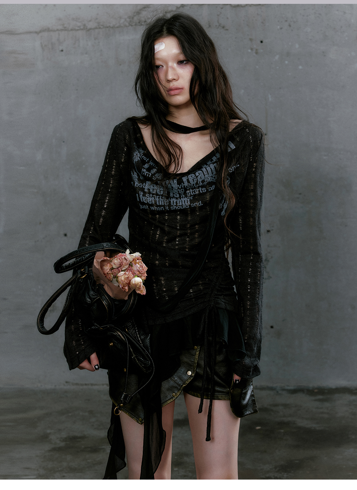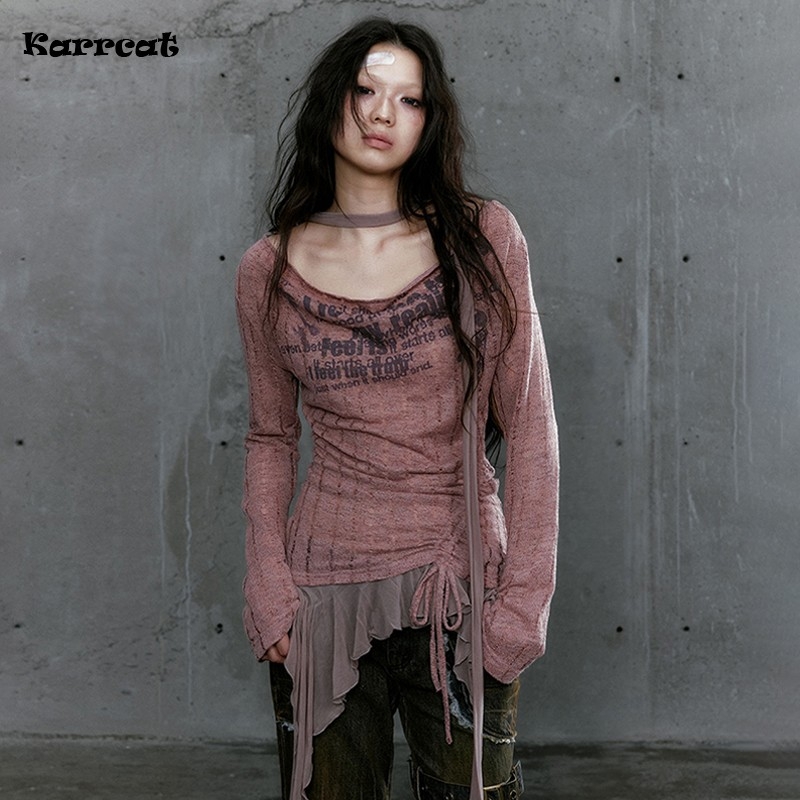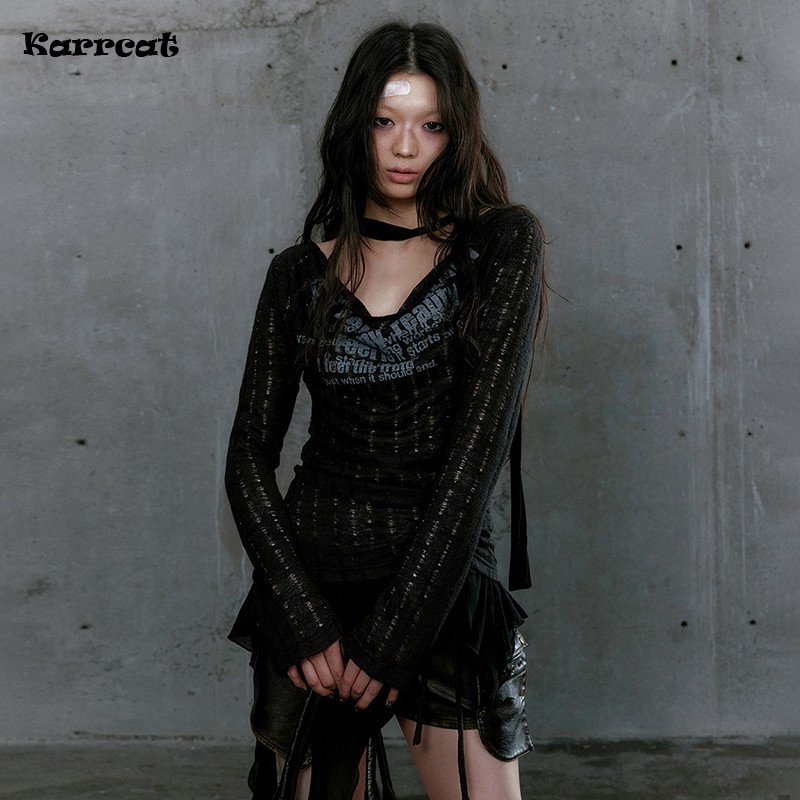 Karrcat Grunge Aesthetics Knitted Tops Trashy Y2k Graffiti Print T-shirt Vintage Punk Irregular Patchwork Knitwear High Street