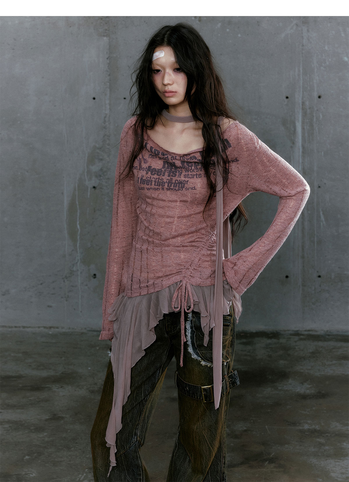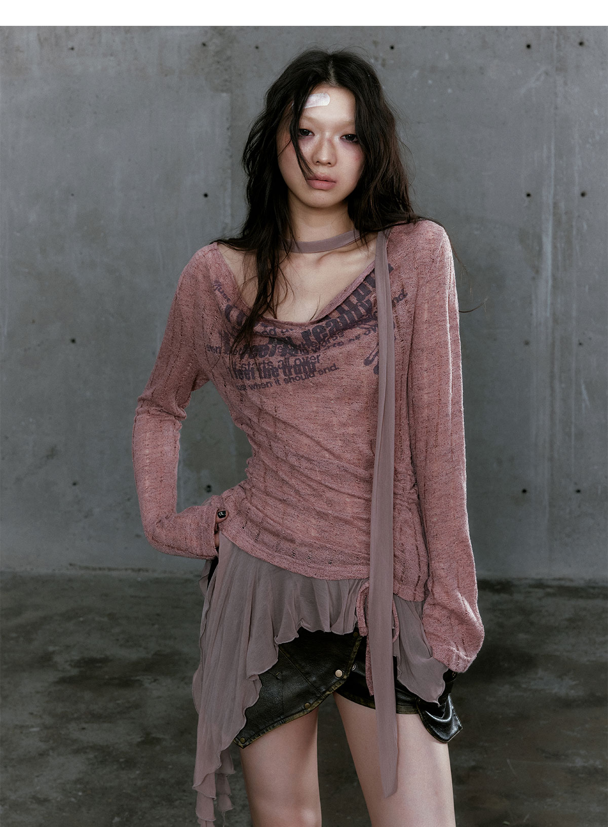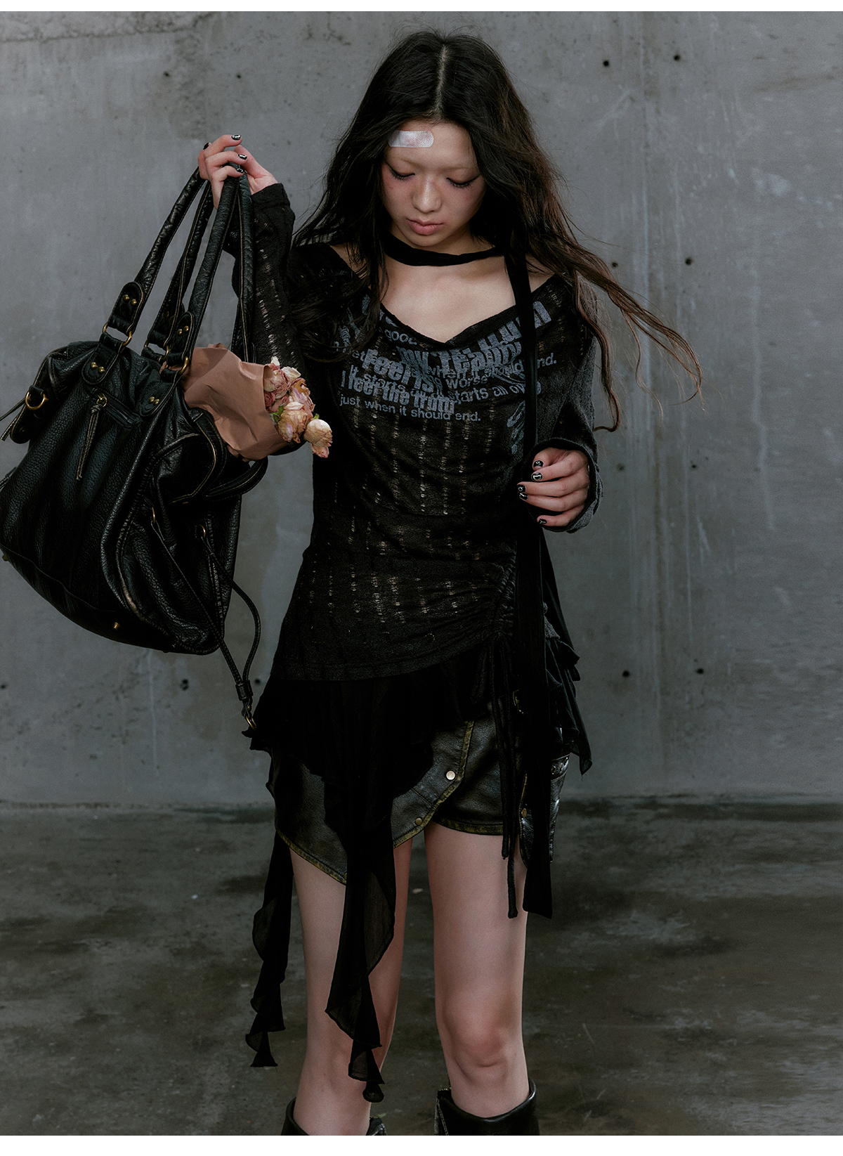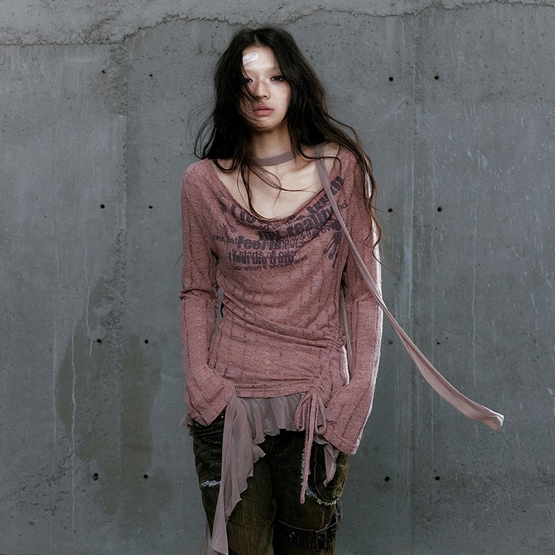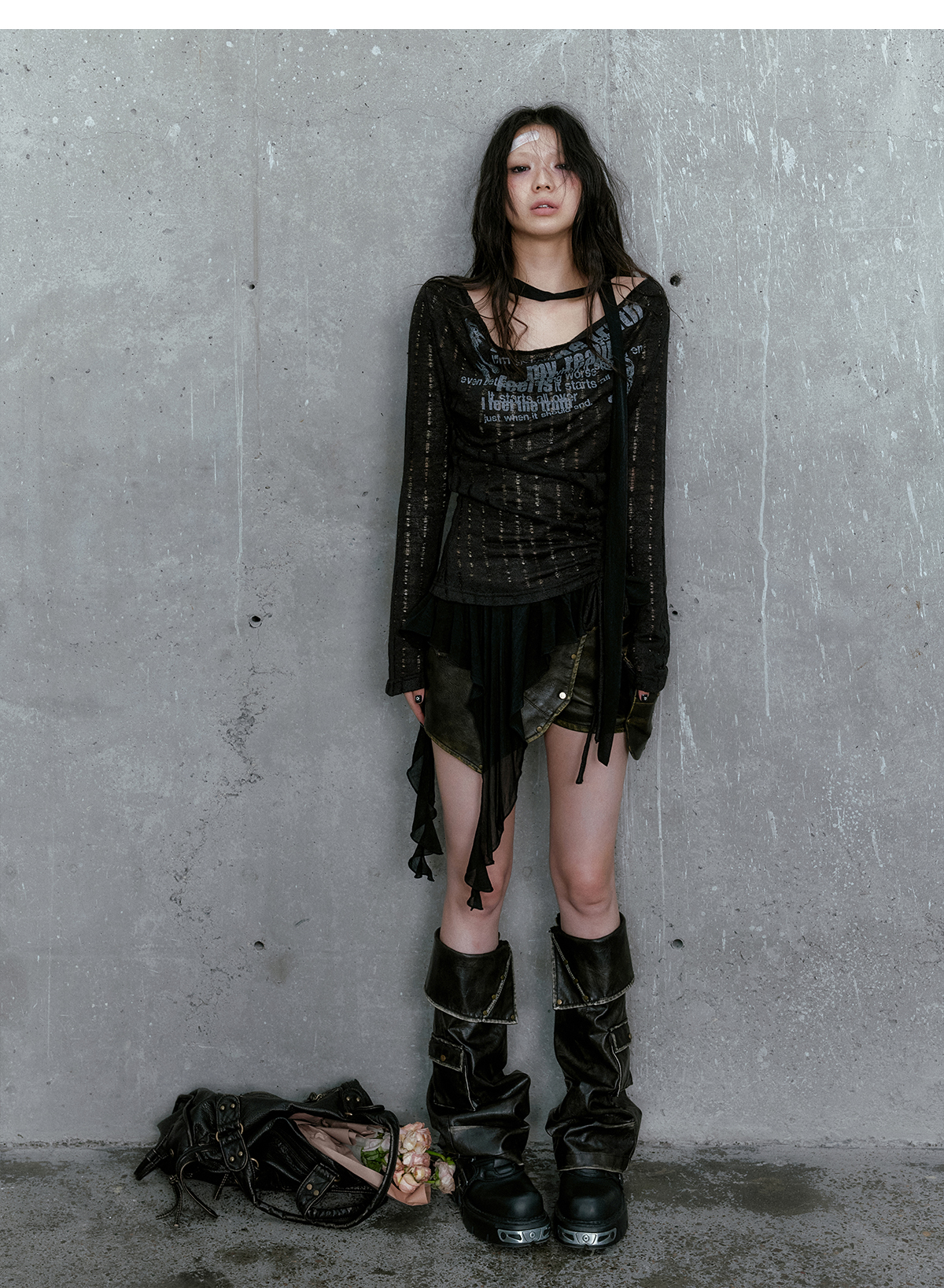 Karrcat Grunge Aesthetics Knitted Tops Trashy Y2k Graffiti Print T-shirt Vintage Punk Irregular Patchwork Knitwear High Street