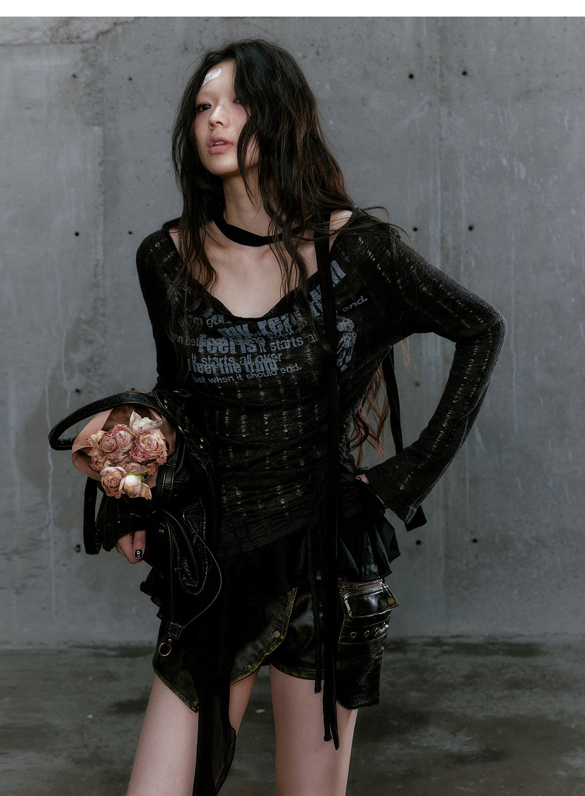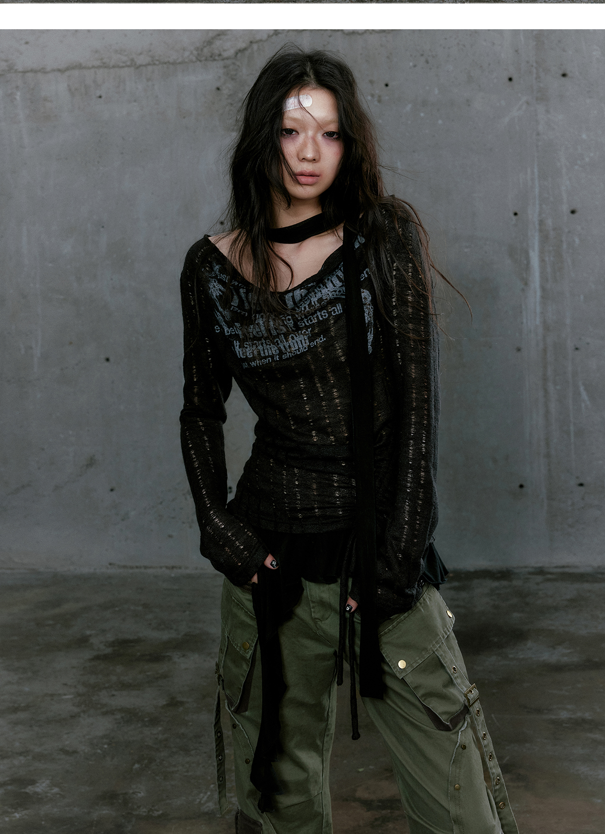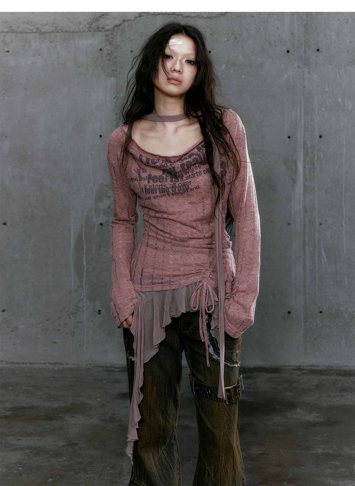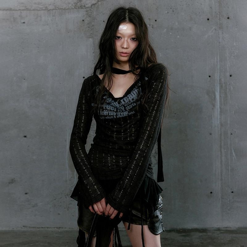 Karrcat Grunge Aesthetics Knitted Tops Trashy Y2k Graffiti Print T-shirt Vintage Punk Irregular Patchwork Knitwear High Street